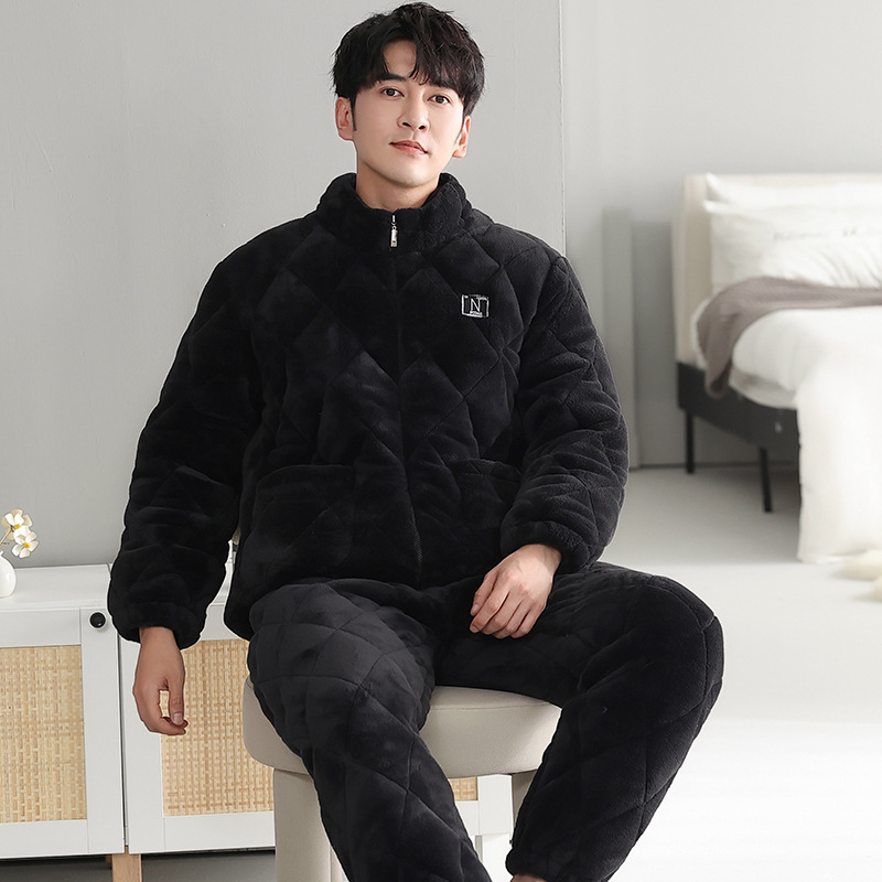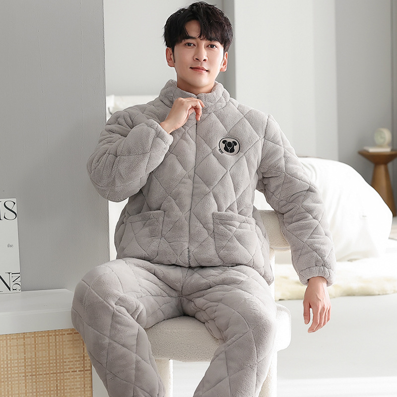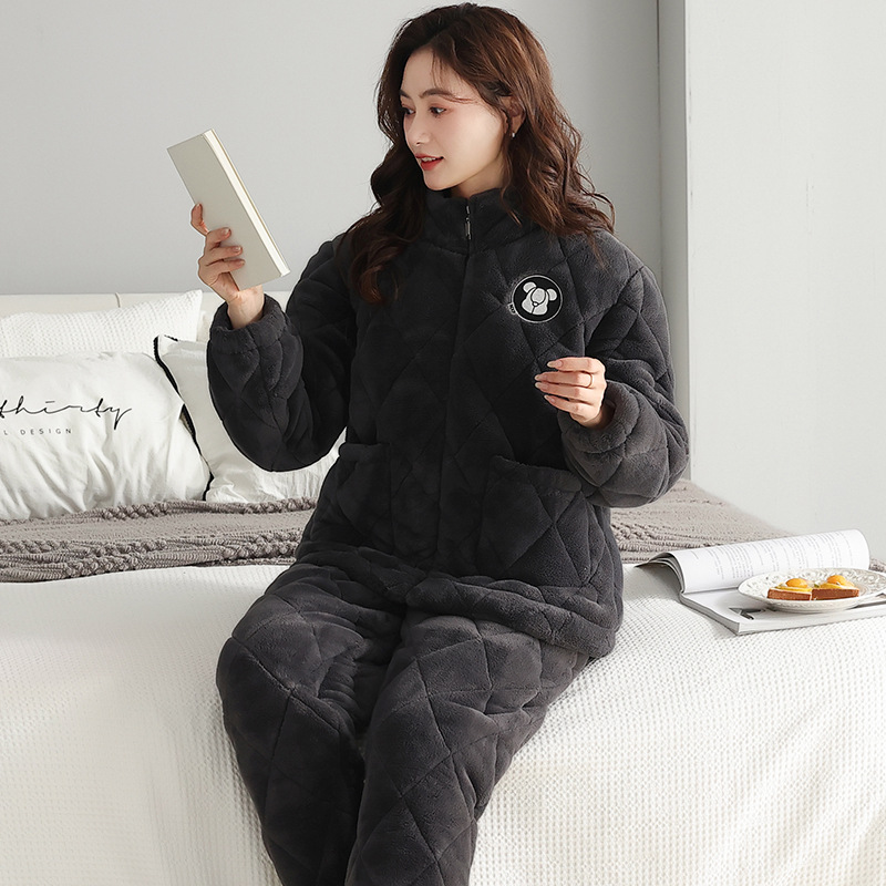 커플 잠옷 겨울 젊은 남녀 3 층 두껍게 기모 산호 양털 퀼트 지퍼 스탠드 칼라 겨울 세트