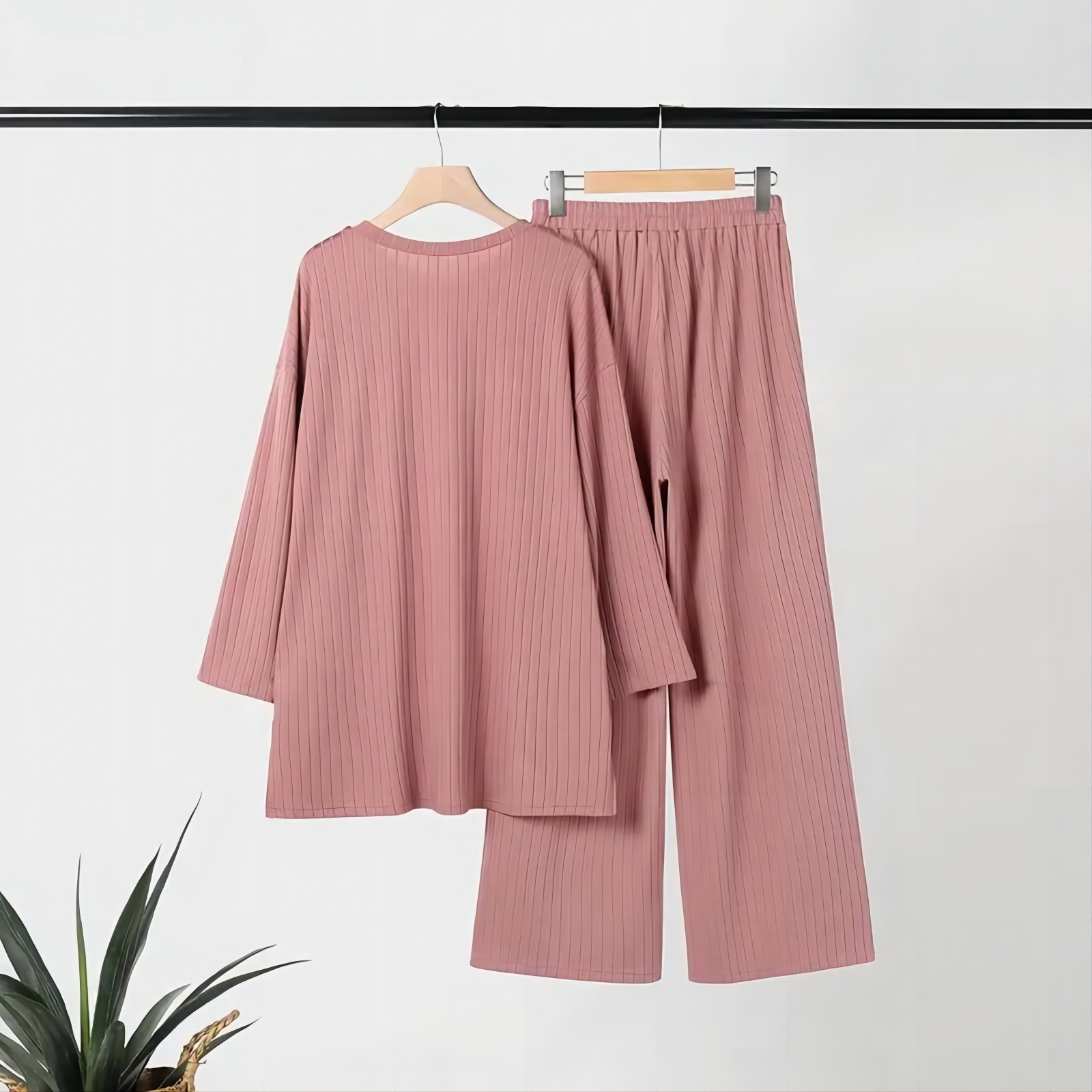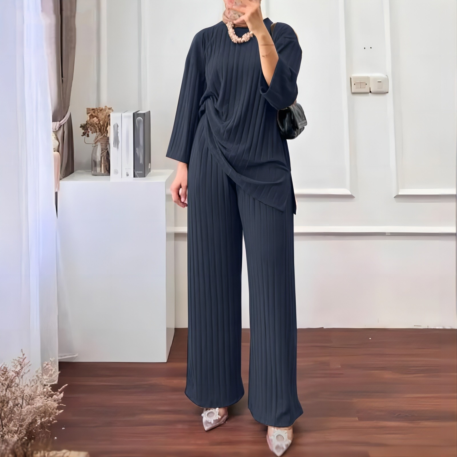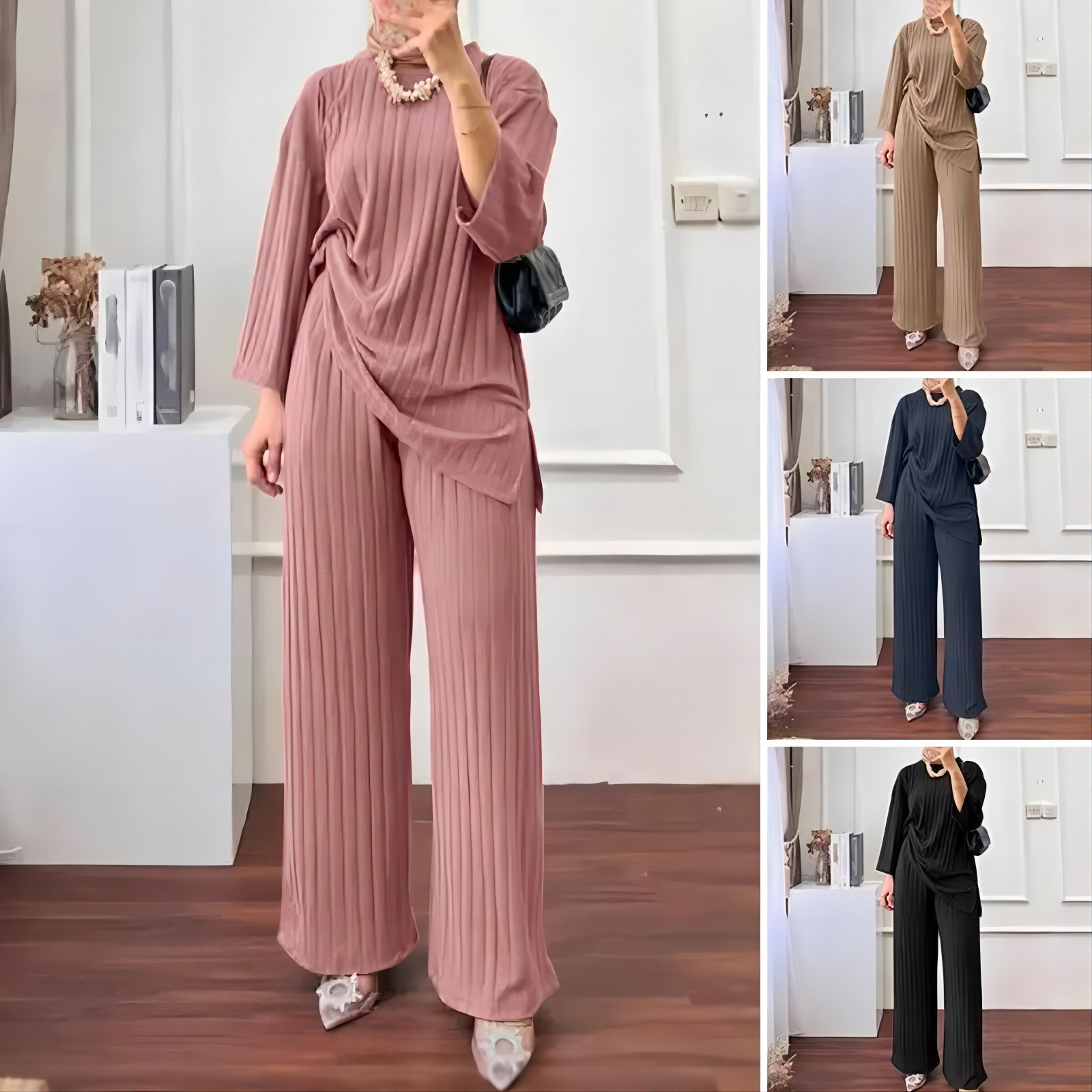 국경 간 2023 가을과 겨울 새로운 여성의 긴팔 탑 와이드 레그 팬츠 세트 단색 캐주얼 스포츠웨어 2 피스 세트