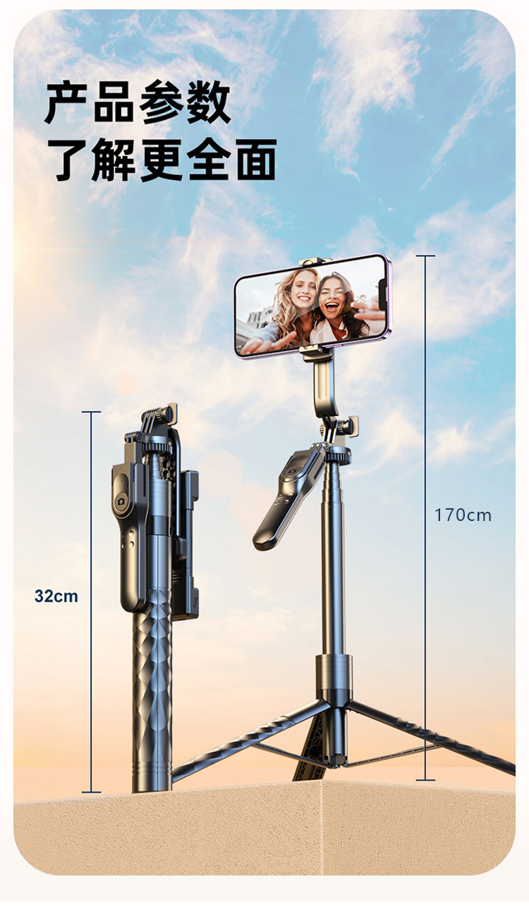 • 1.7 PTZ 광각 셀카 스틱 + TikTok 리모컨 + 삼각대