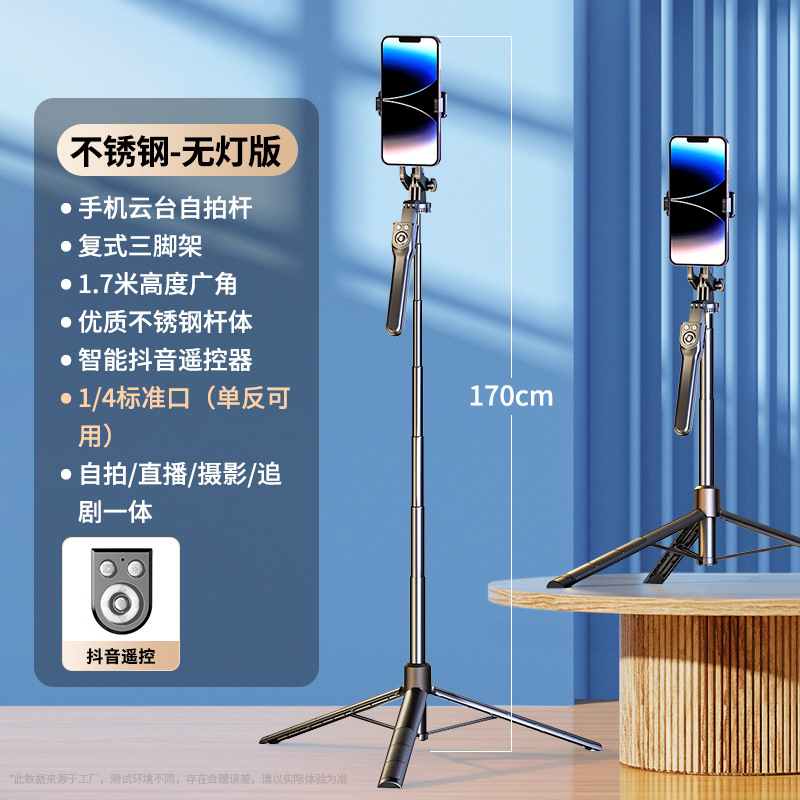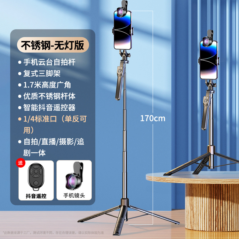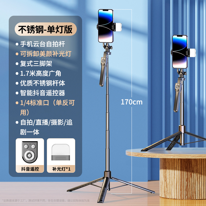 • 1.7 PTZ 광각 셀카 스틱 + 블루투스 원격 제어 + 단일 채우기 조명 + 삼각대