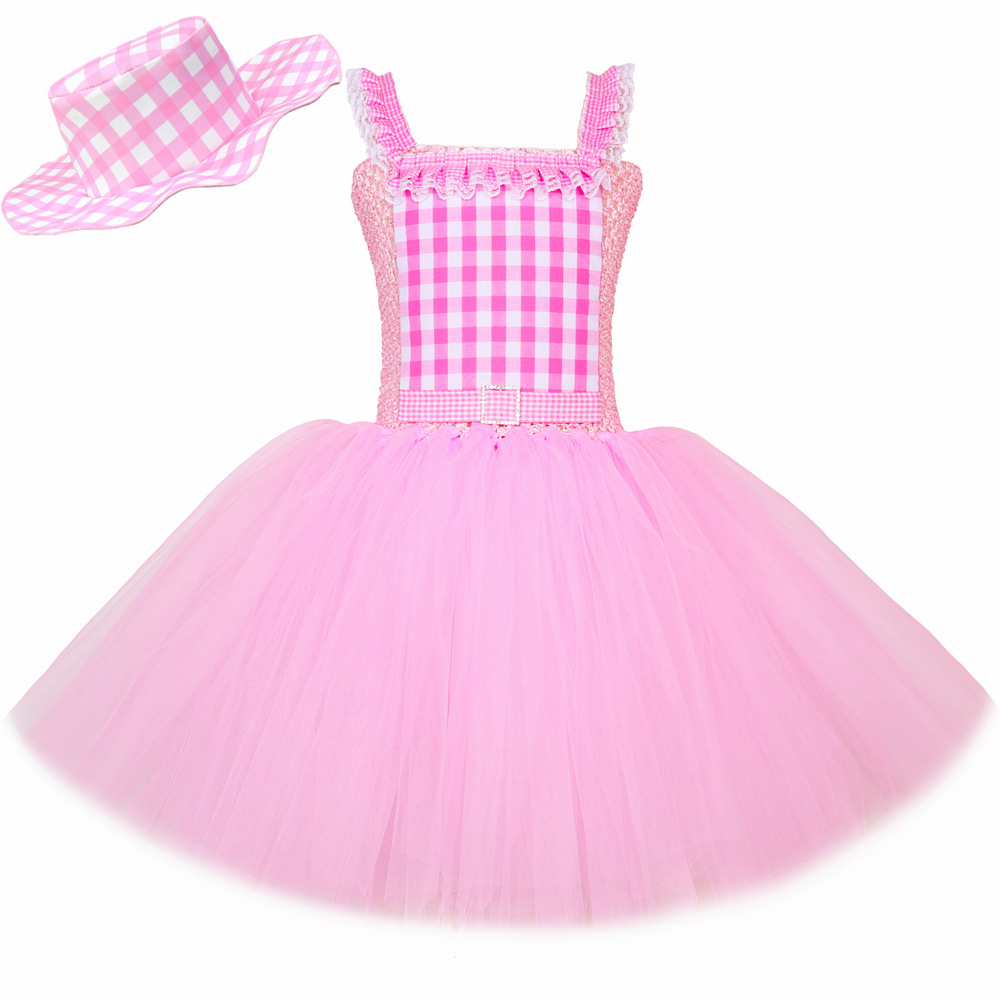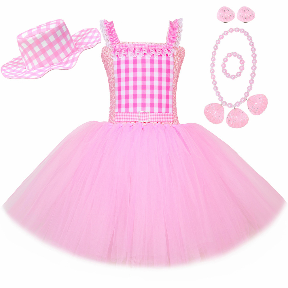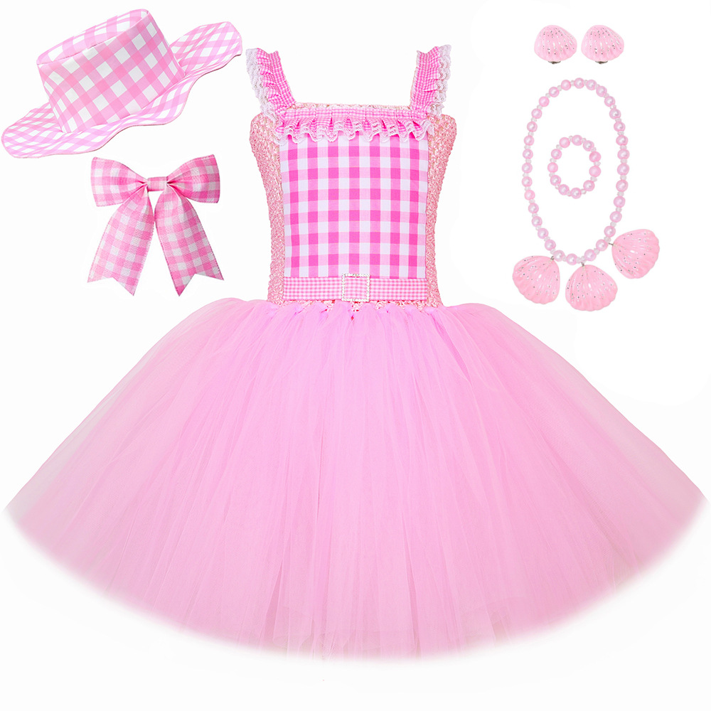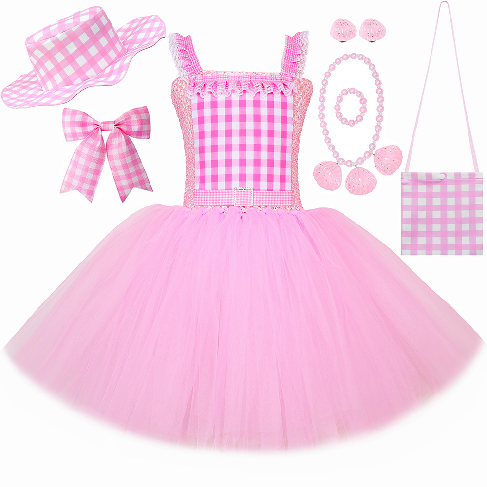 실제 영화 바비 소녀 원피스 코스프레 세트 핑크 격자 무늬 어린이 메쉬 솜털 공주 원피스스토어 가기
