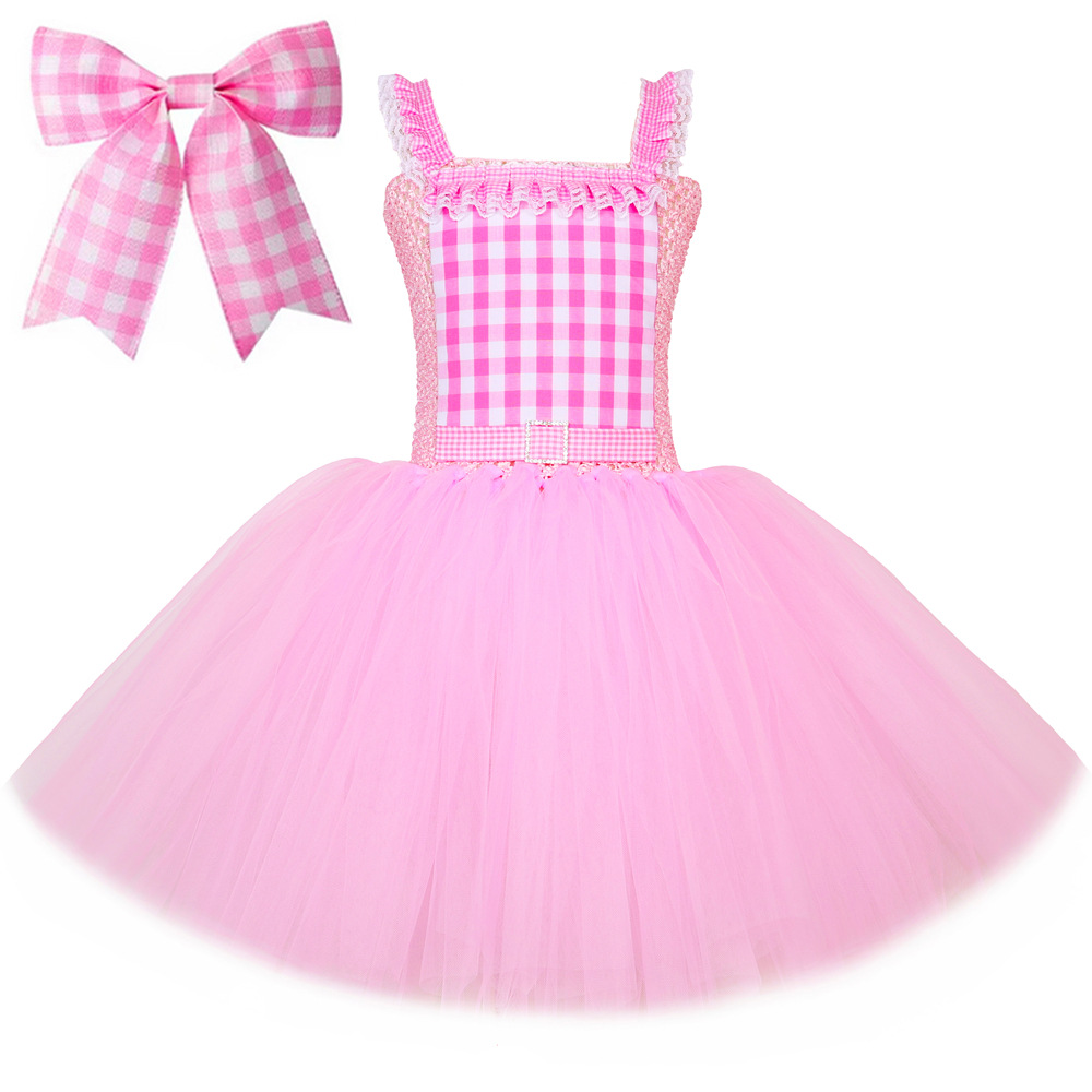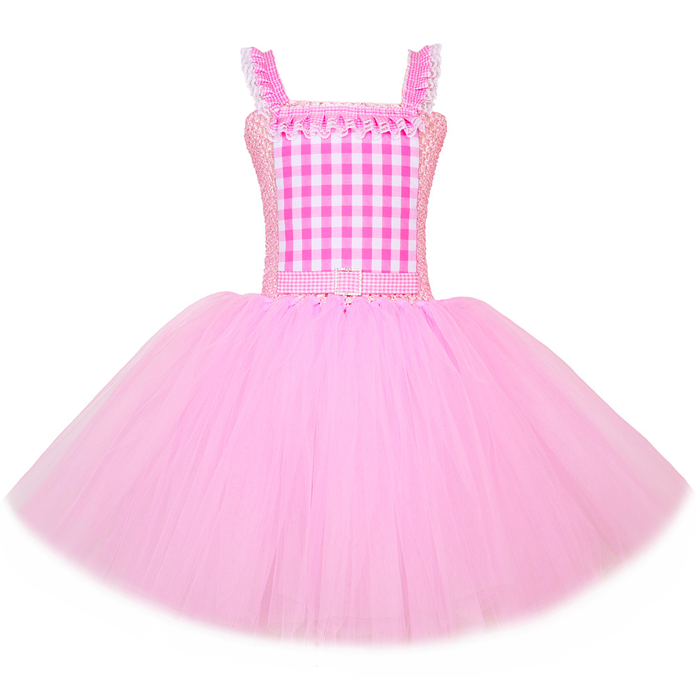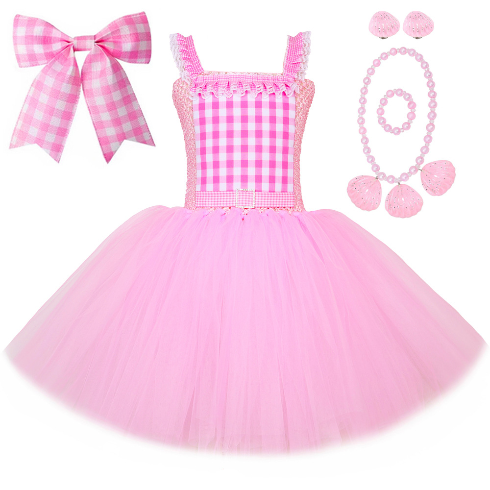 실제 영화 바비 소녀 원피스 코스프레 세트 핑크 격자 무늬 어린이 메쉬 솜털 공주 원피스