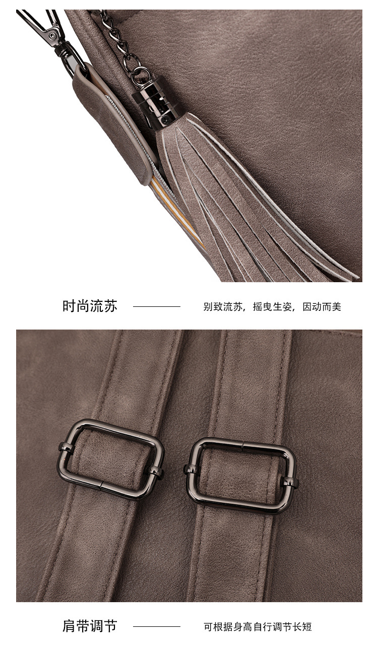 产品前部以加长流苏做为拉头使用,流苏采用同主包原料手工制作,加长设计,精致典雅,同时悬挂位亦可悬挂其他配饰或是钥匙、零钱包等物品;