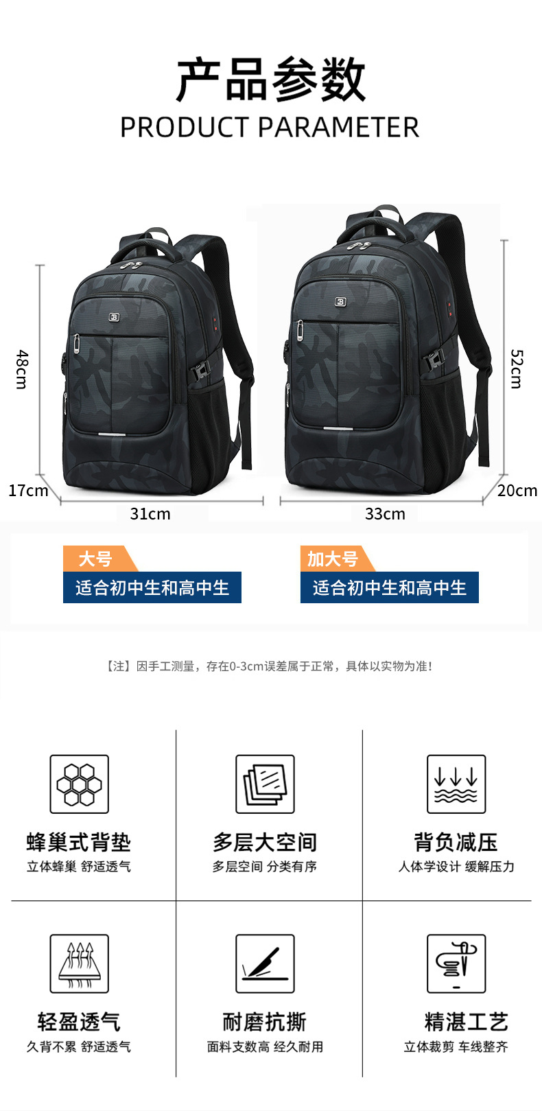 중학교 중학교 학생 대학생 대용량 소년 위장 여행 배낭 고등학교 배낭