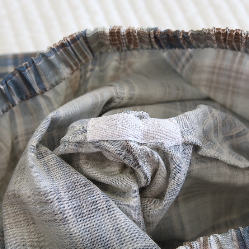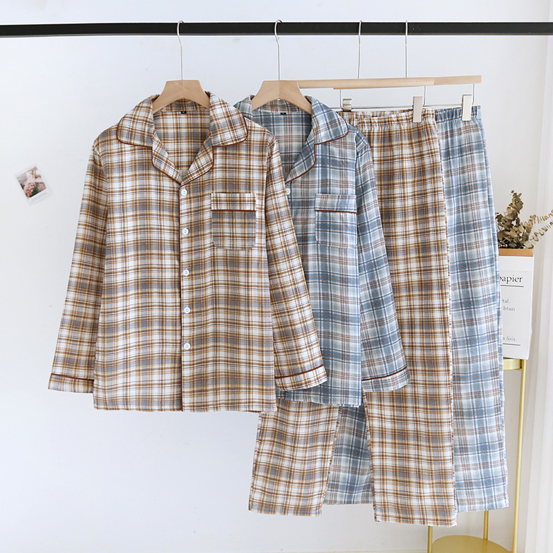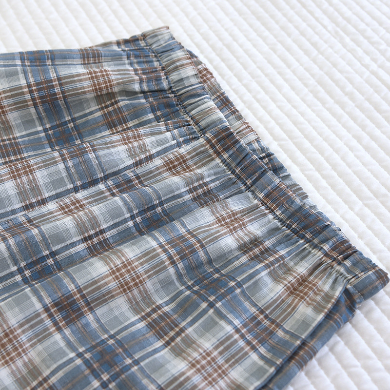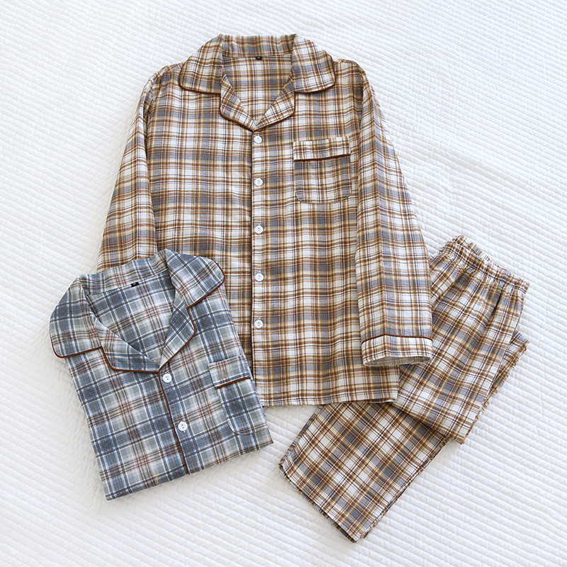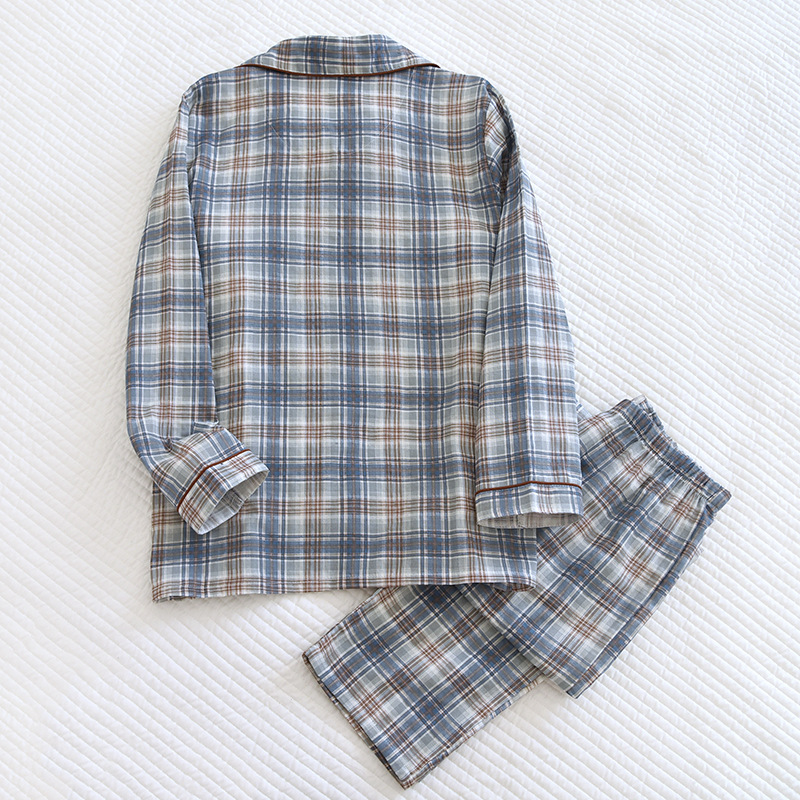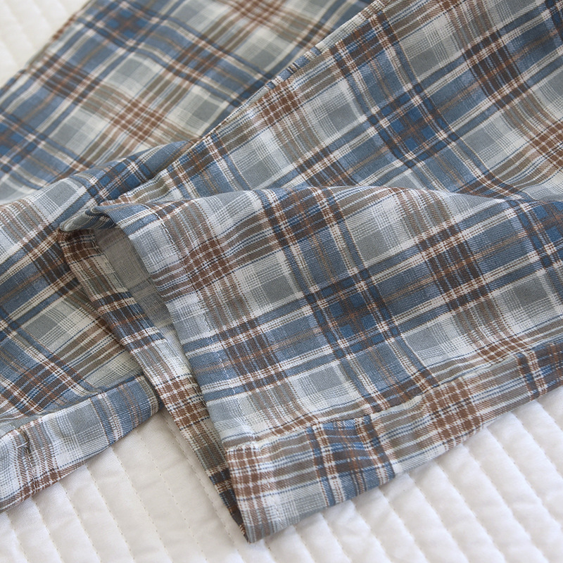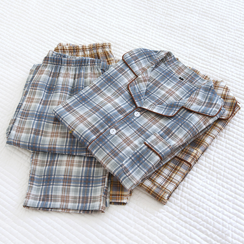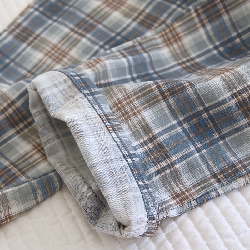 봄과 가을 더블 거즈 코튼 파자마 남자의 느슨한 큰 크기 얇은 긴 소매 바지 간단한 격자 무늬 홈 옷스토어 가기