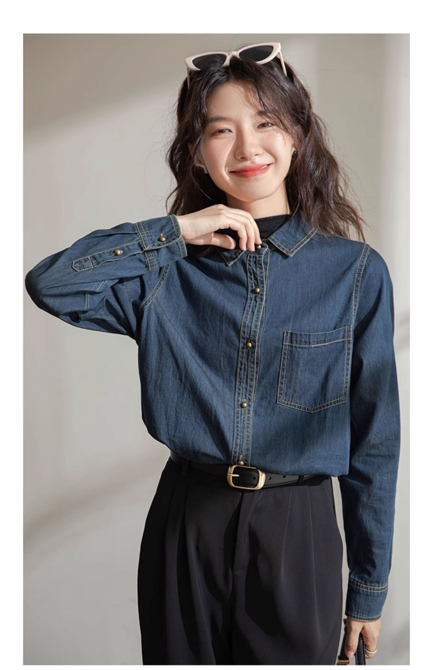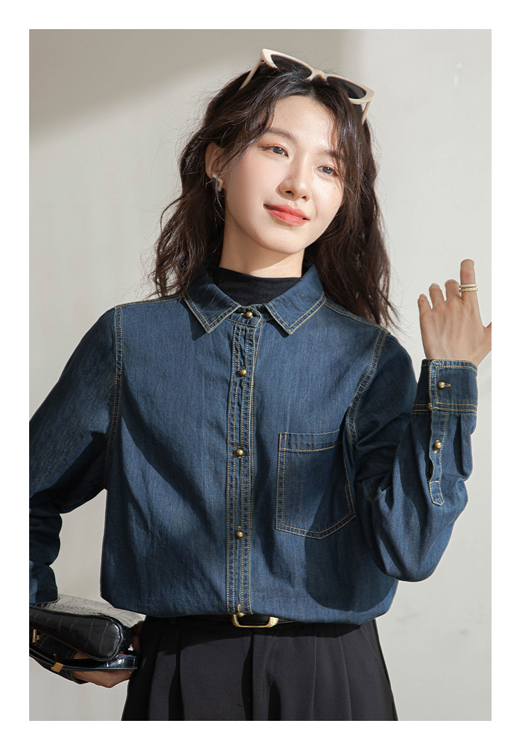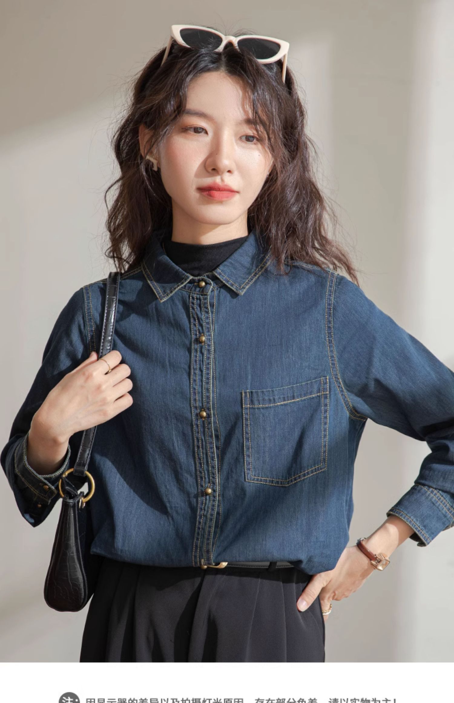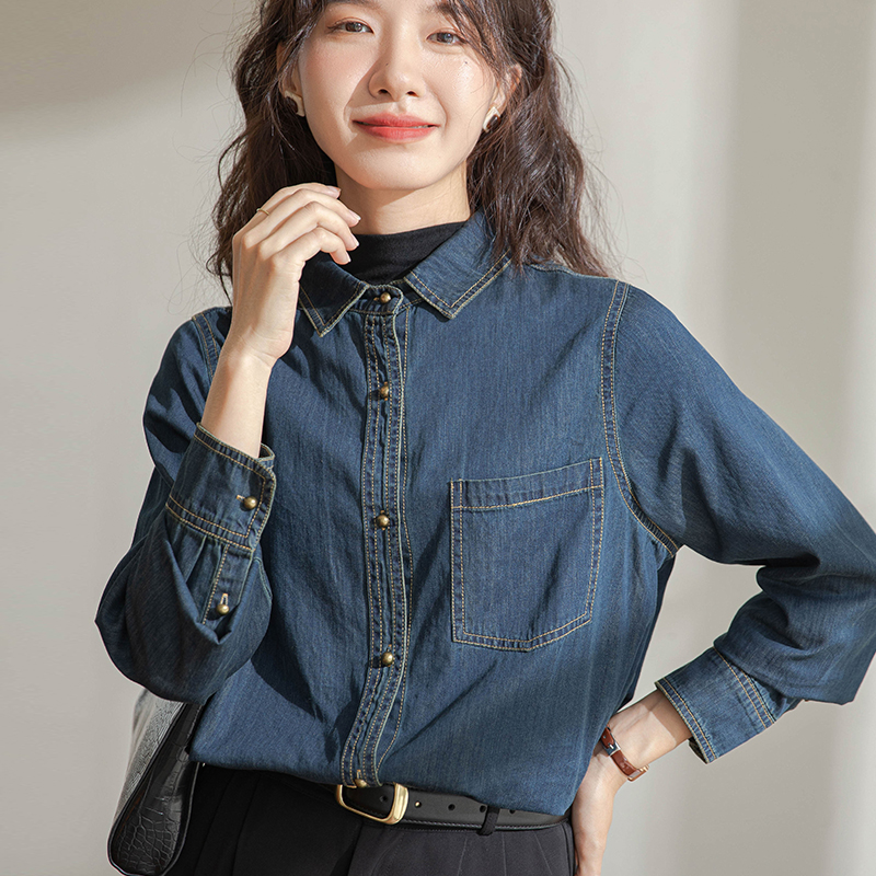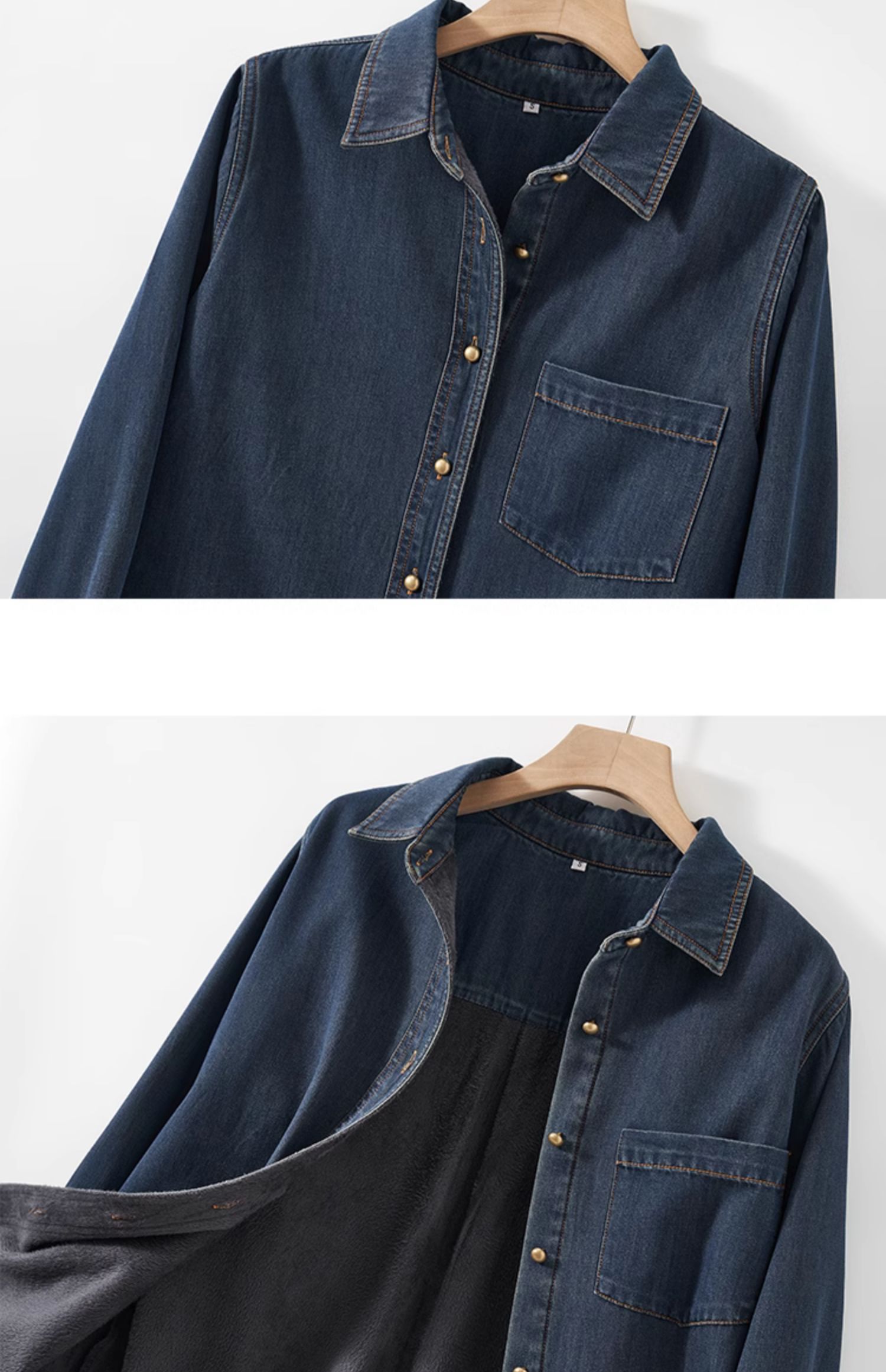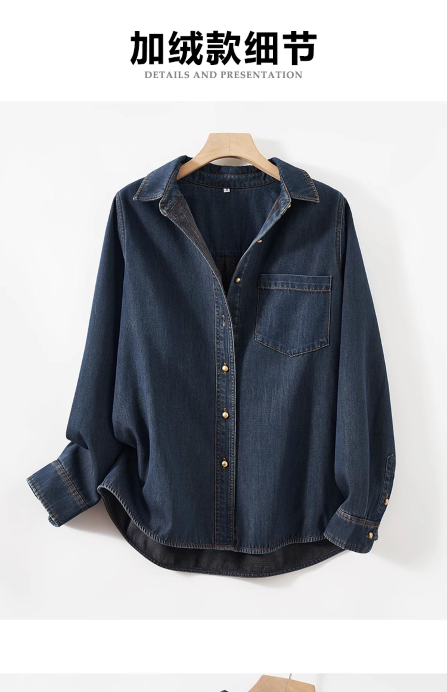 진한 파란색 복고풍 어깨 데님 셔츠 여성용 양털 안감 24 새로운 가을과 겨울 작은 내부 착용 부드러운 탑스토어 가기