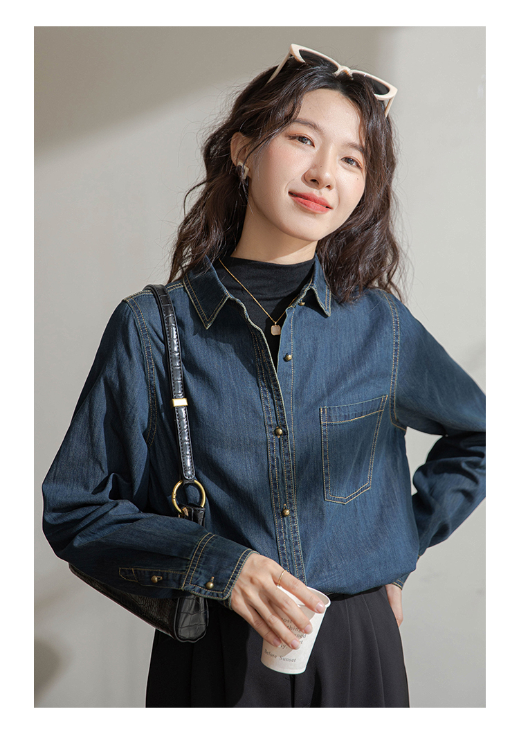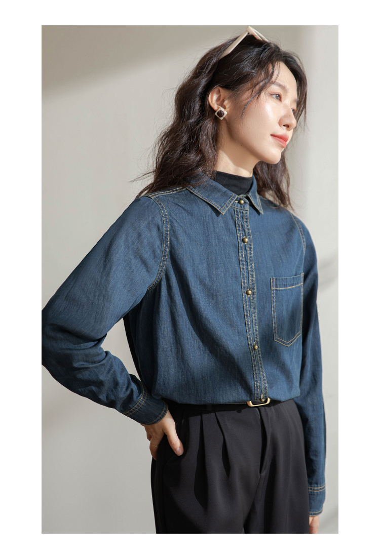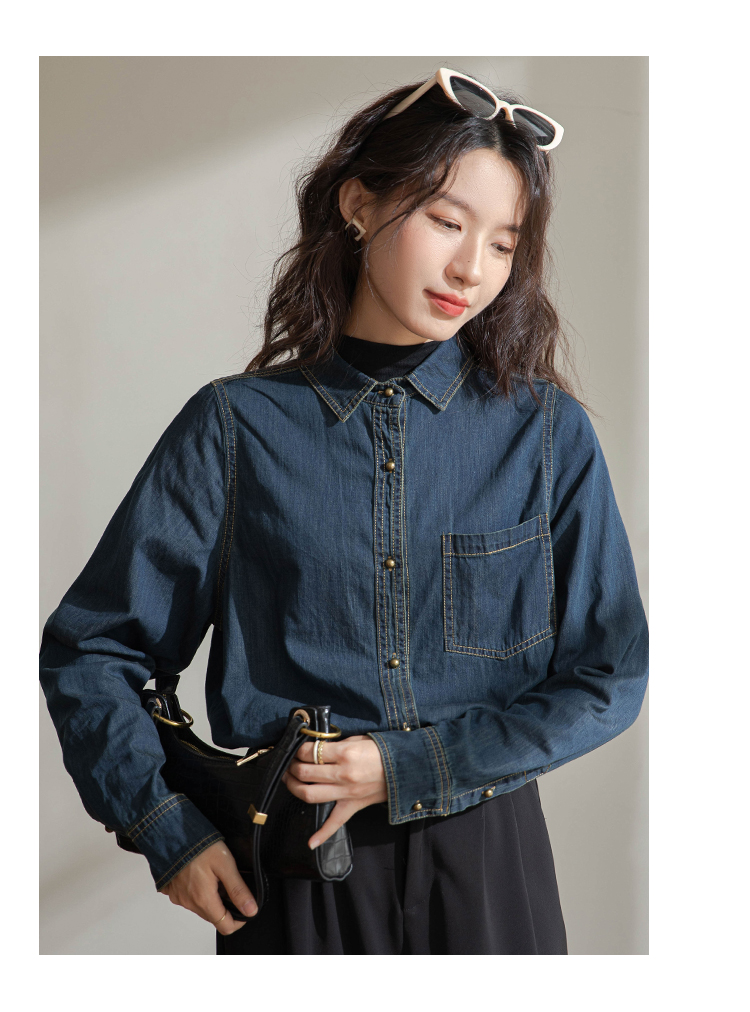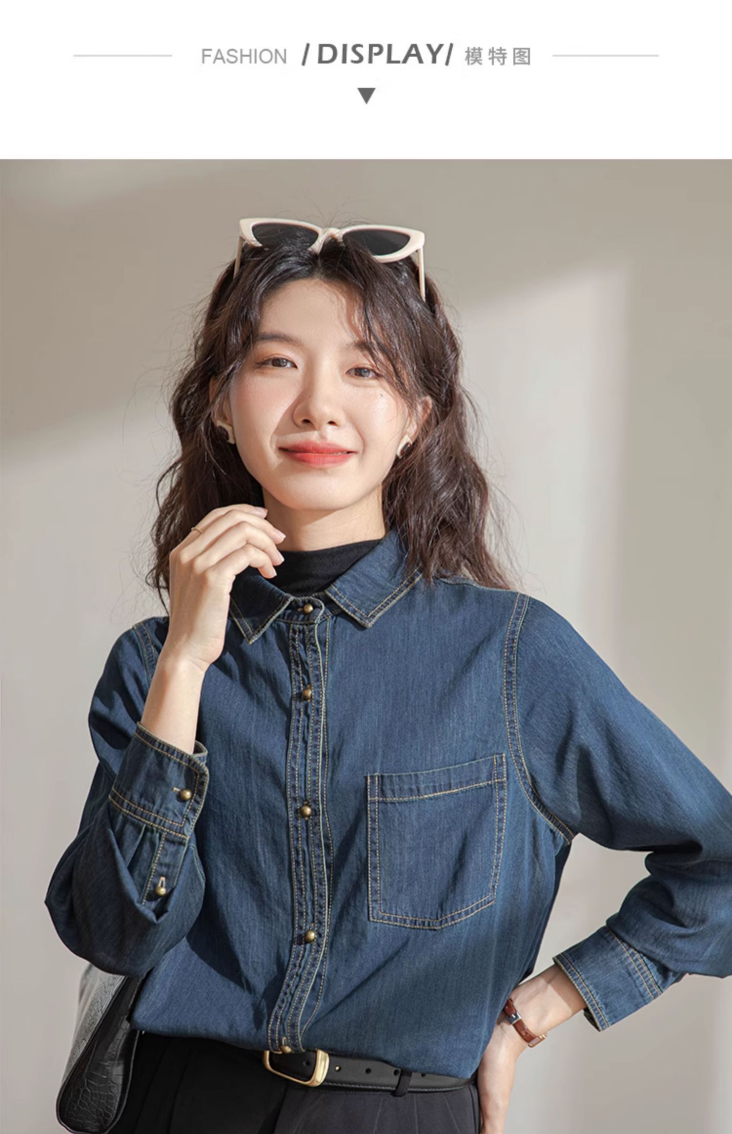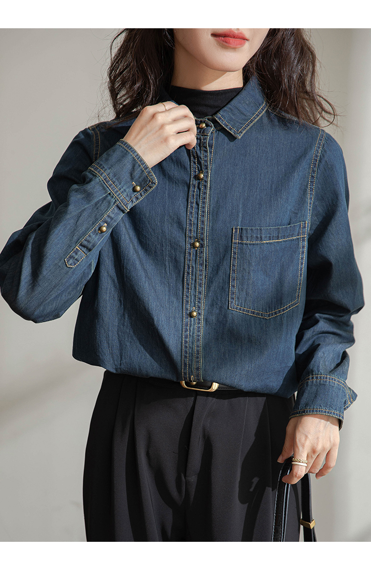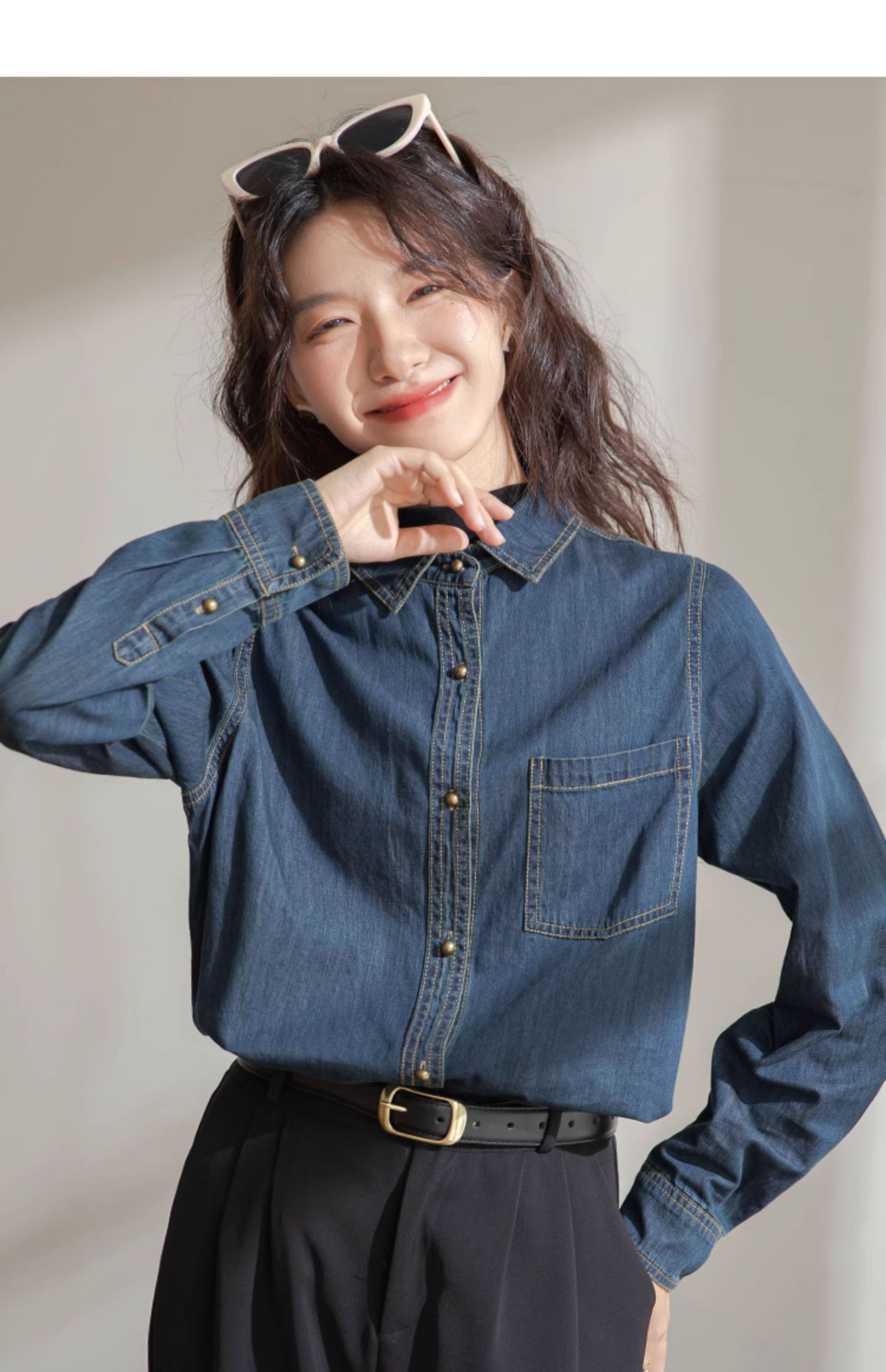진한 파란색 복고풍 어깨 데님 셔츠 여성용 양털 안감 24 새로운 가을과 겨울 작은 내부 착용 부드러운 탑스토어 가기