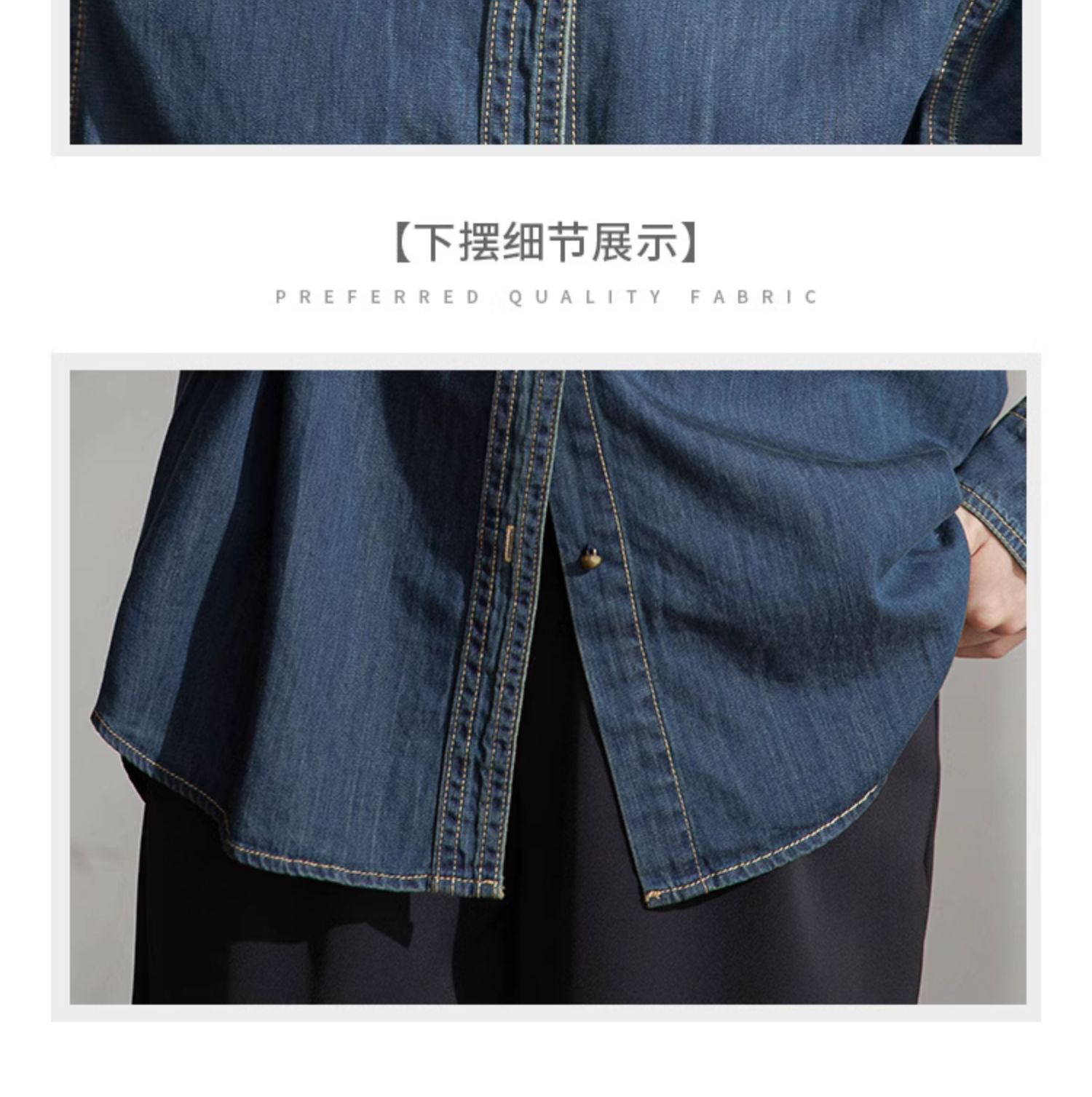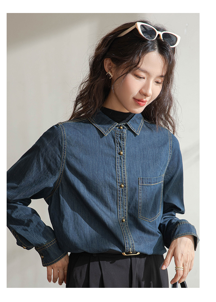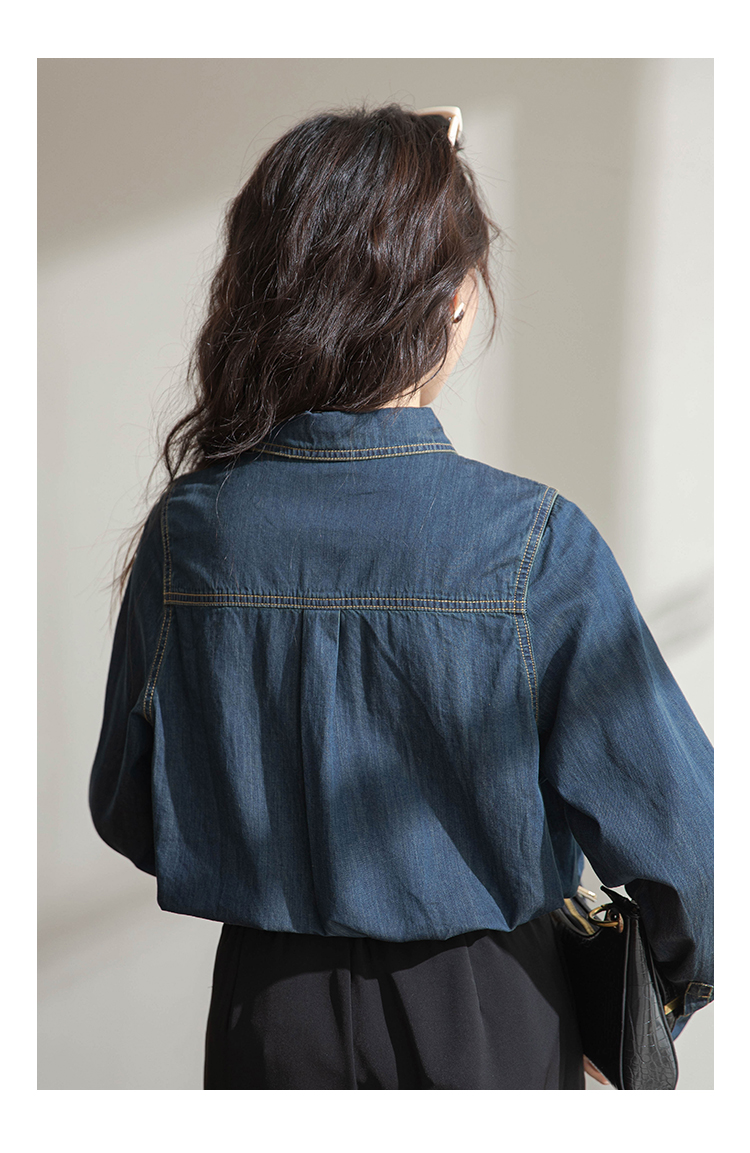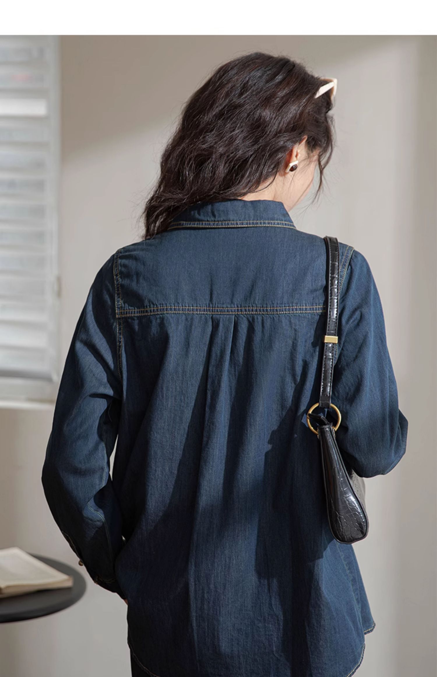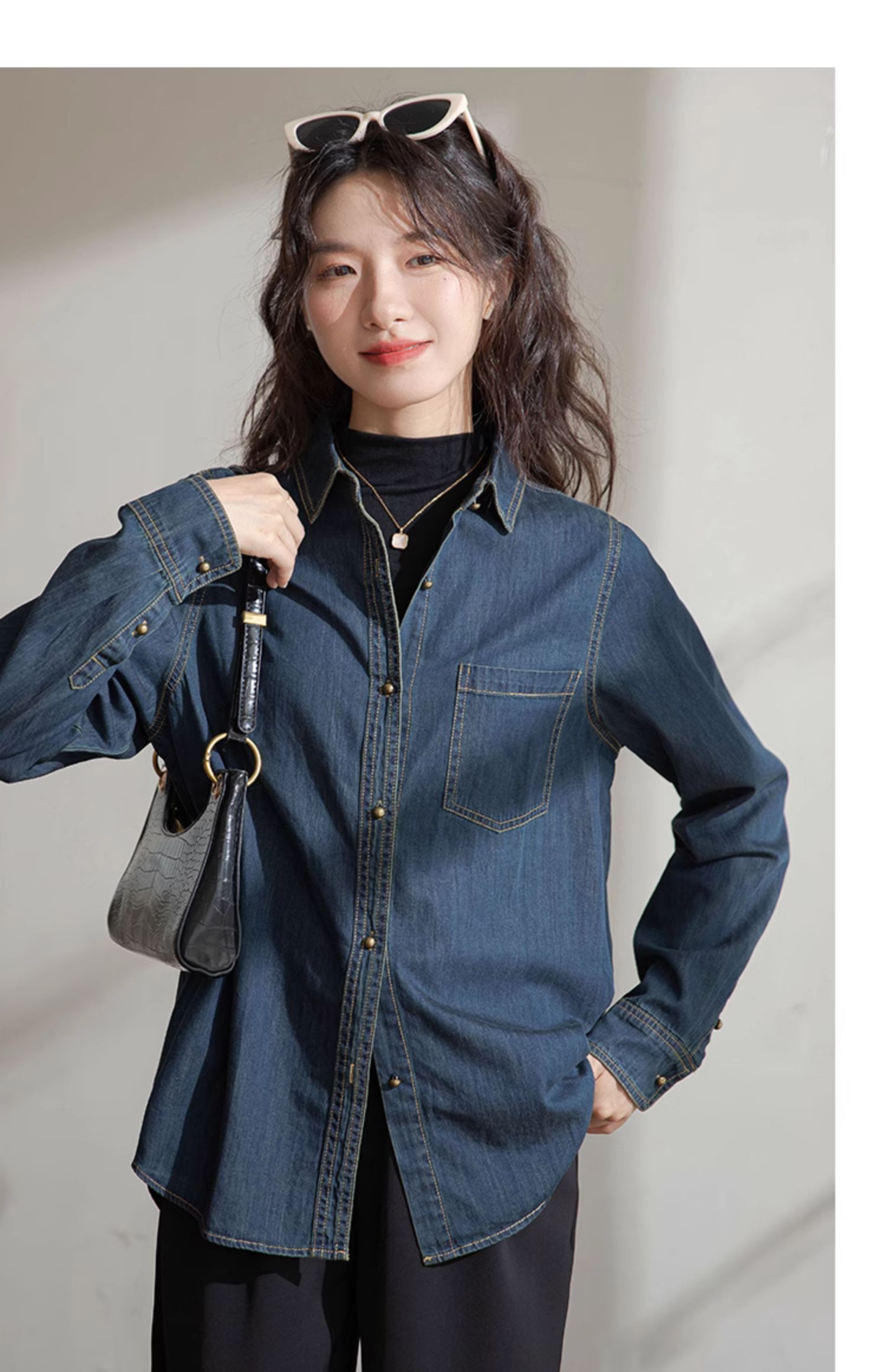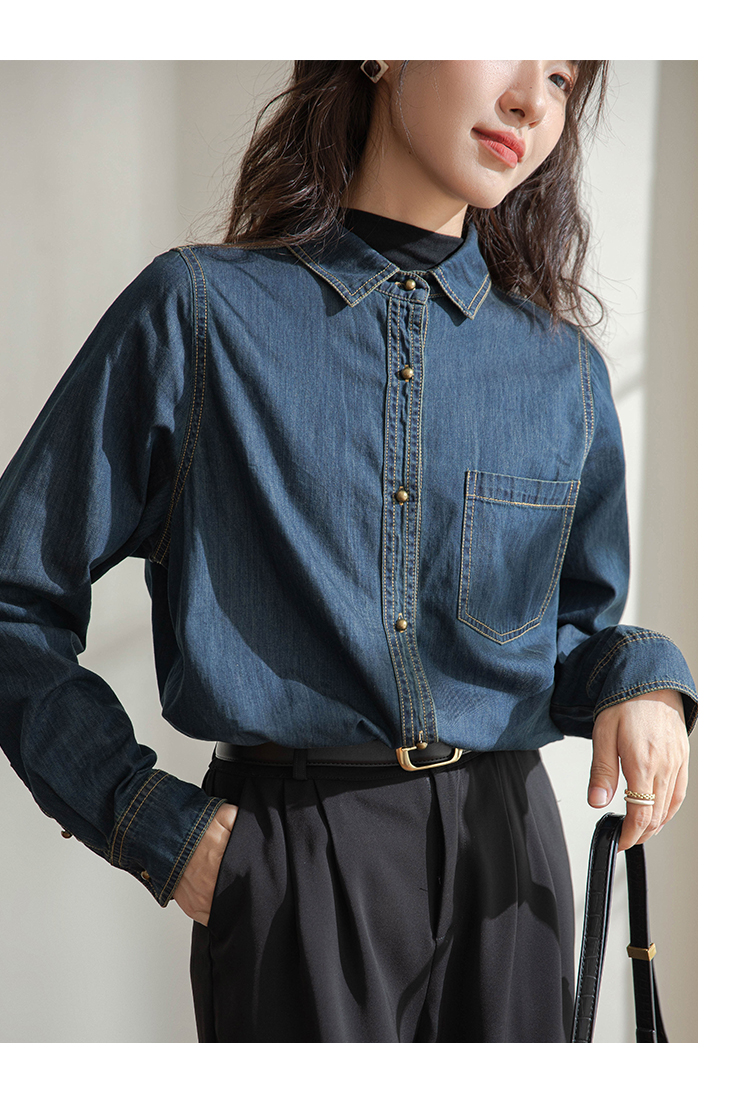 진한 파란색 복고풍 어깨 데님 셔츠 여성용 양털 안감 24 새로운 가을과 겨울 작은 내부 착용 부드러운 탑스토어 가기