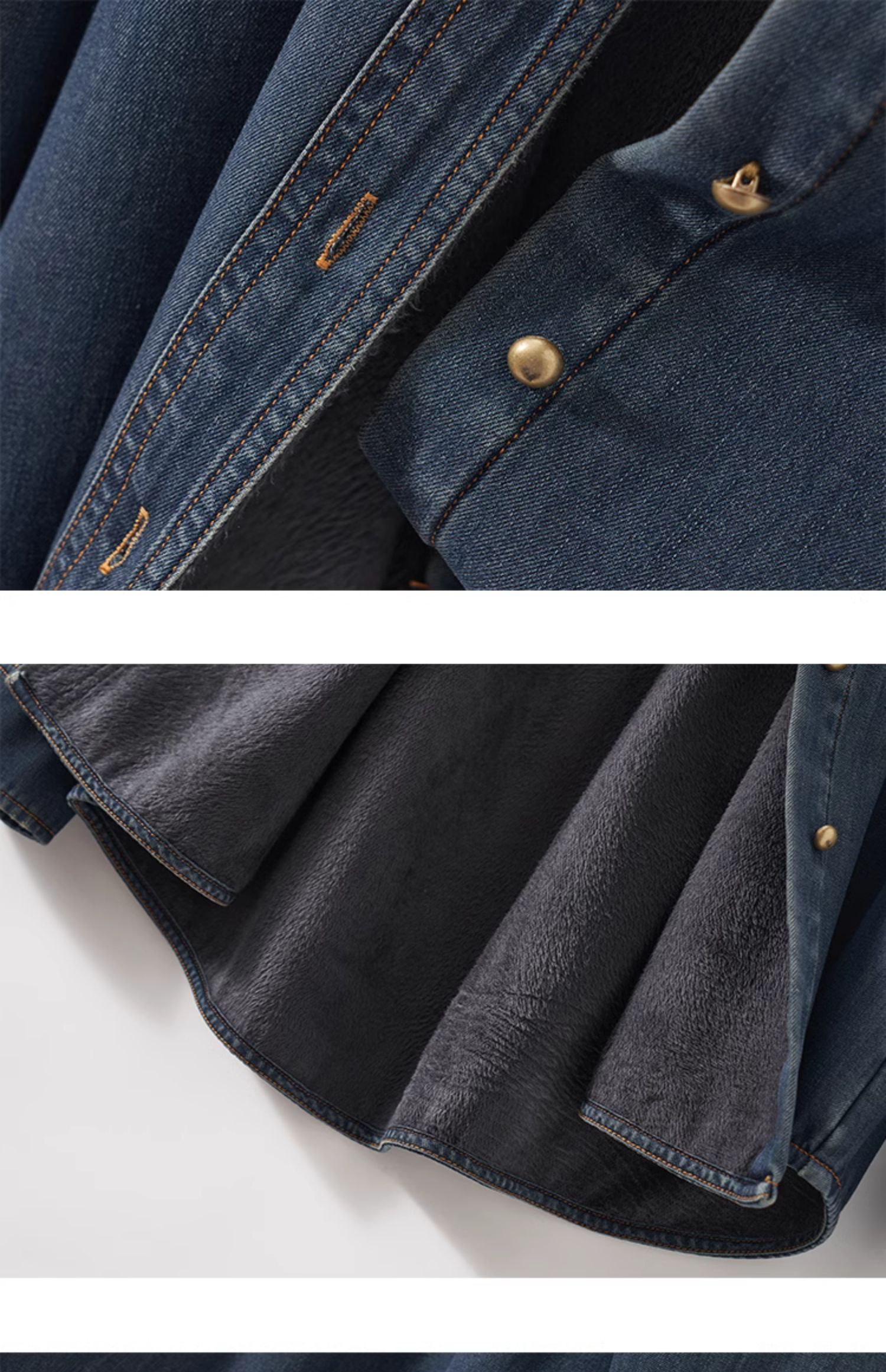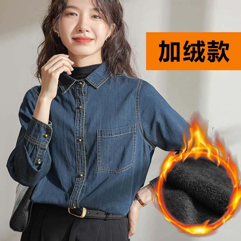 진한 파란색 복고풍 어깨 데님 셔츠 여성용 양털 안감 24 새로운 가을과 겨울 작은 내부 착용 부드러운 탑