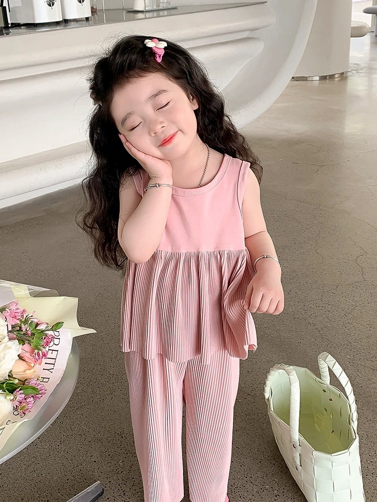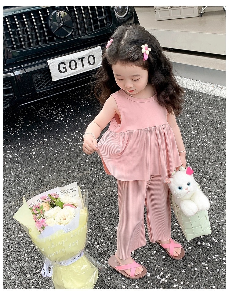 여아용 새 스타일 조끼형 베이비탑, 한국 스타일 아동복, 얇은 와이드 팬츠, 모기 방지 바지 세트 (중소형 아동용)