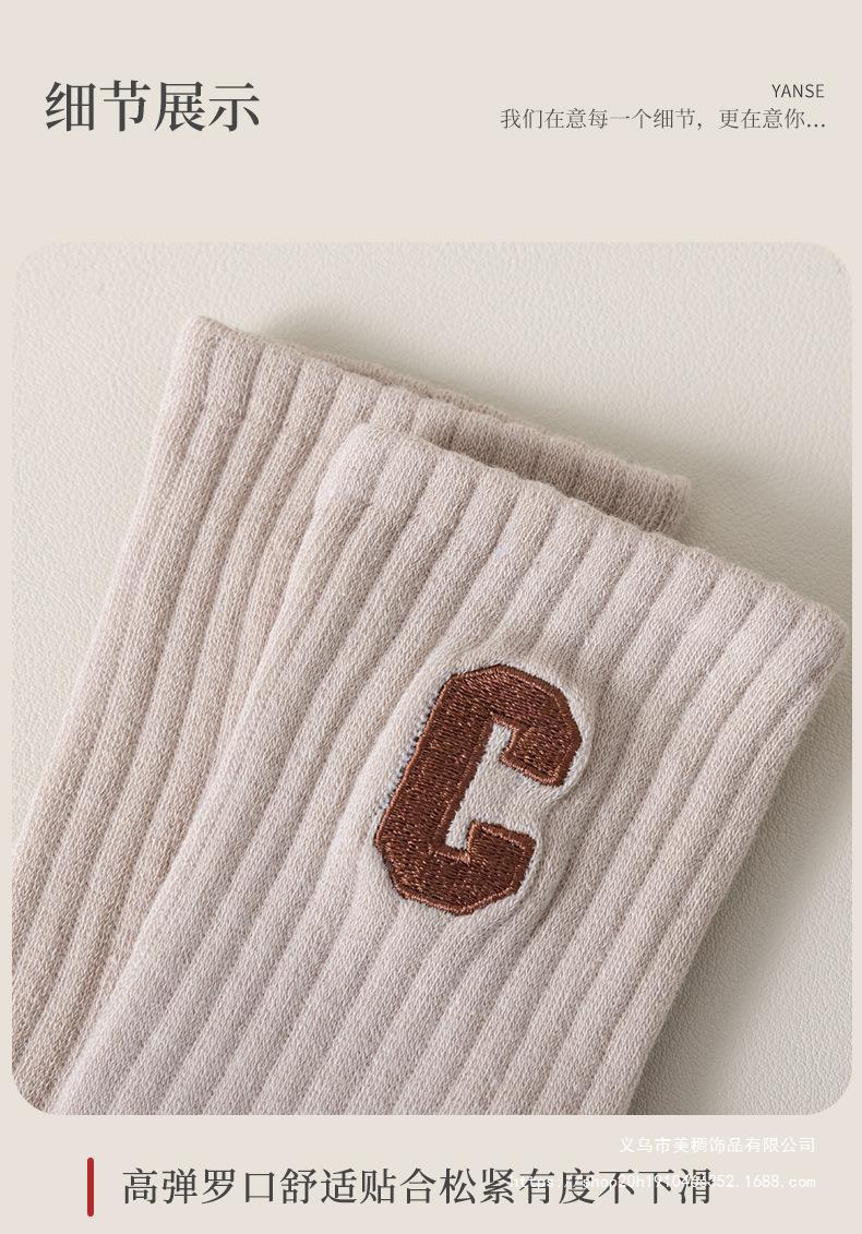 양말 여성의 중간 종아리 양말 가을과 겨울 단색 문자 C 수 놓은 면화 양말 땀 흡수성 통기성 스타킹 인터넷 유명인 수직 패턴 파일 양말스토어 가기