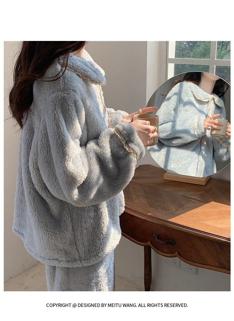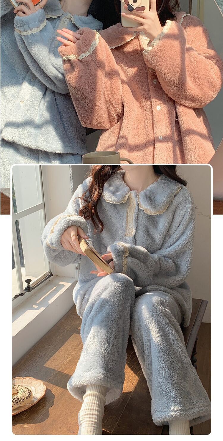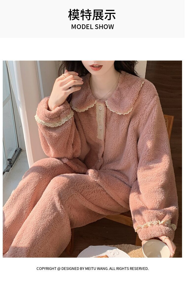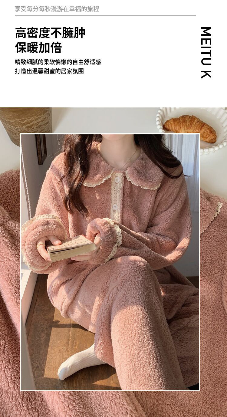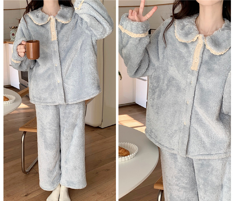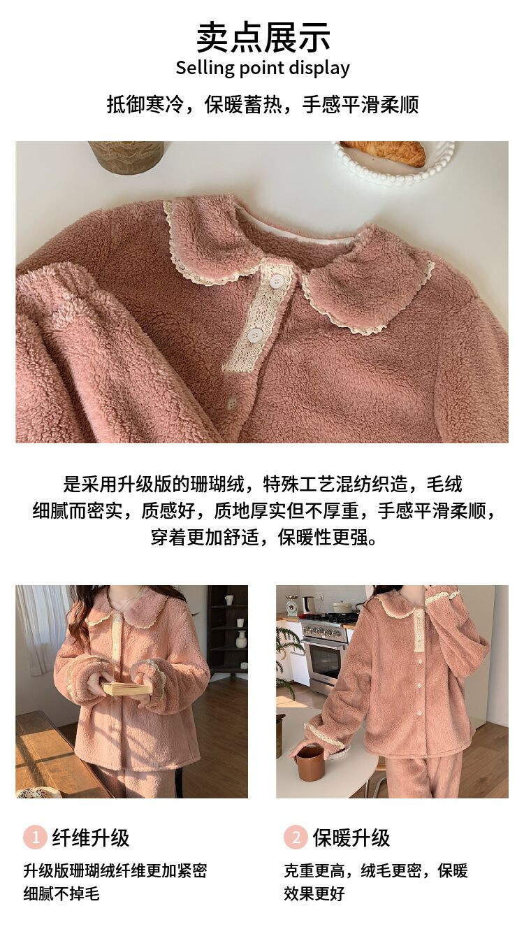 겨울 공주 스타일 잠옷 여성 플란넬 레이스 코트 홈 옷 한국 산호 양털 샤넬 스타일 두꺼운 세트스토어 가기