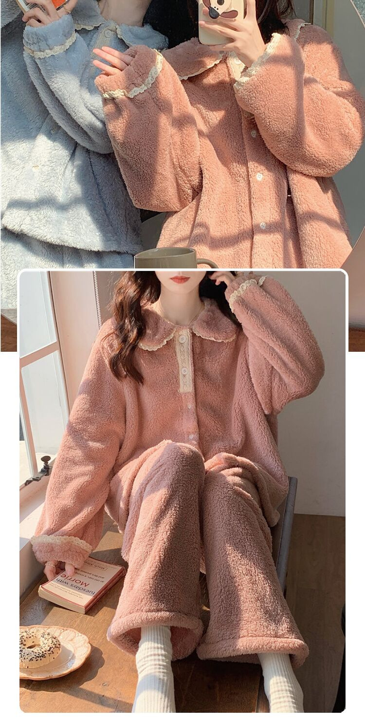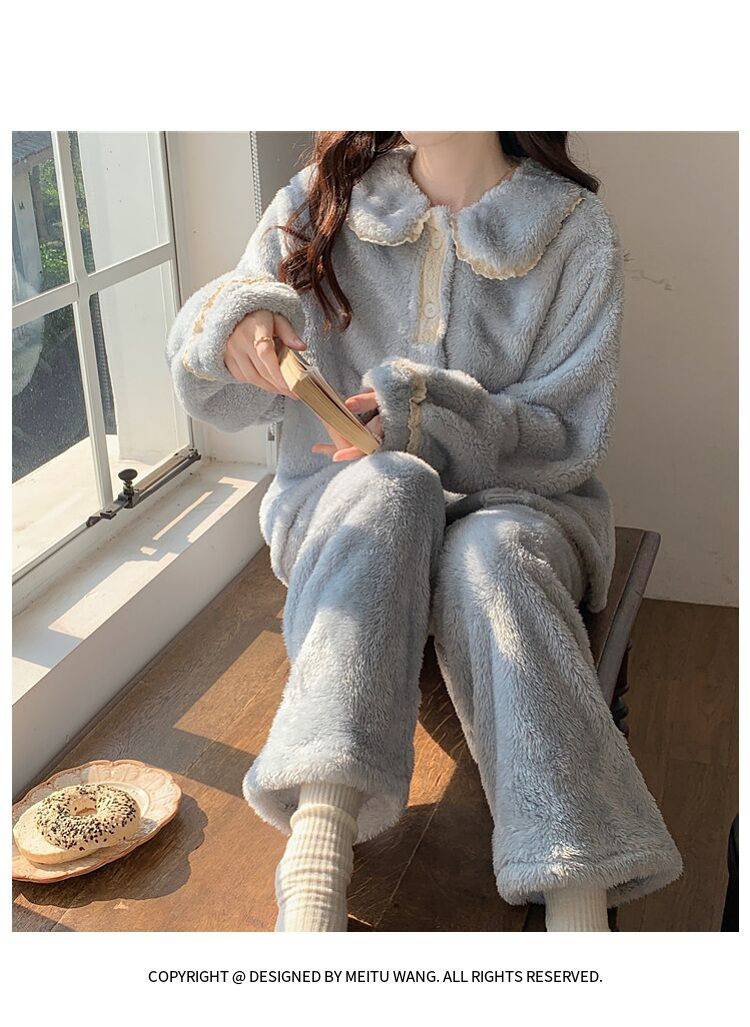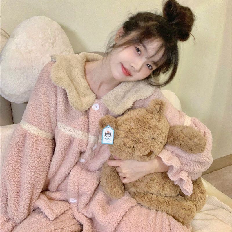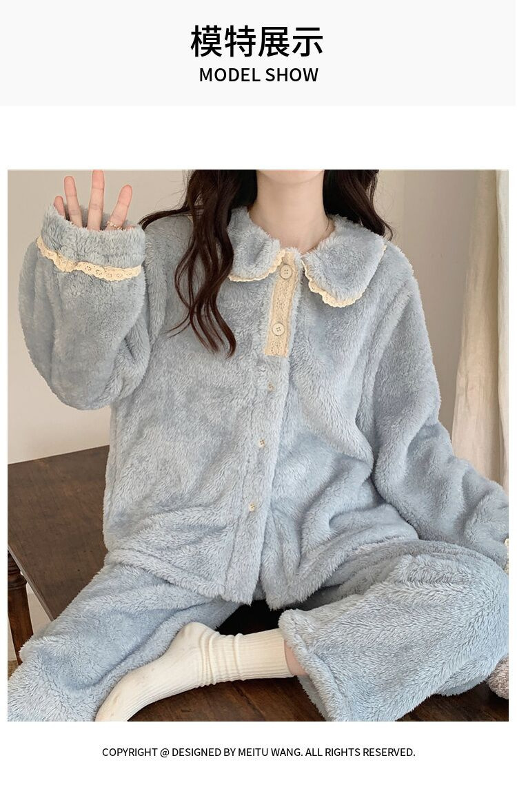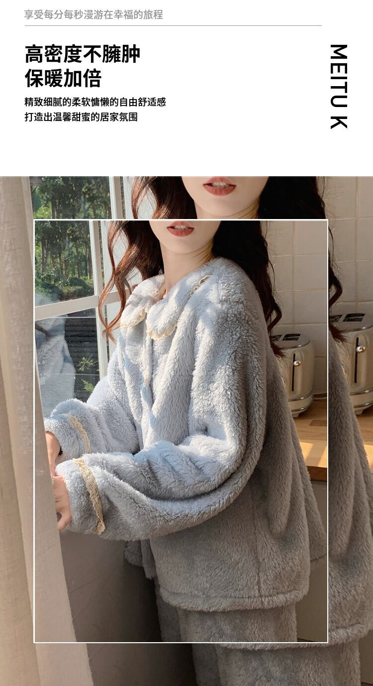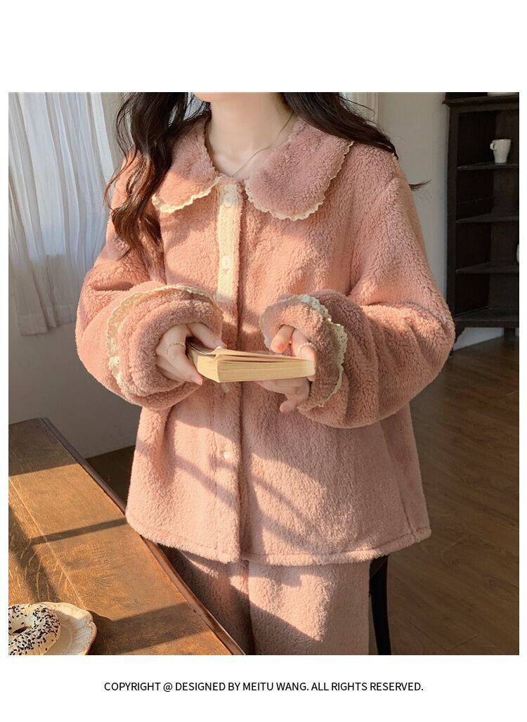 겨울 공주 스타일 잠옷 여성 플란넬 레이스 코트 홈 옷 한국 산호 양털 샤넬 스타일 두꺼운 세트스토어 가기