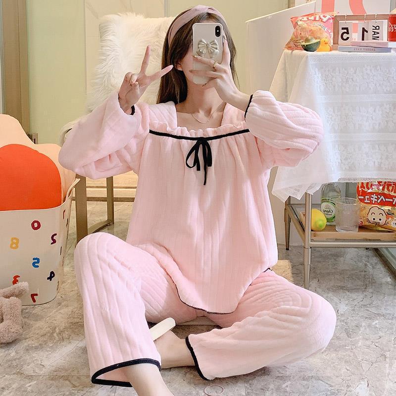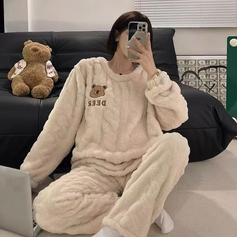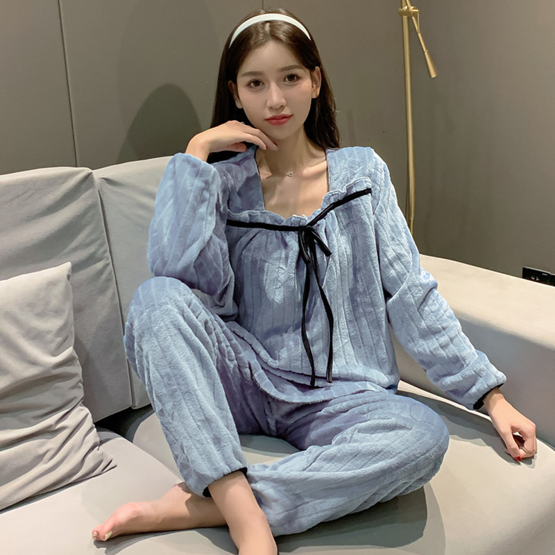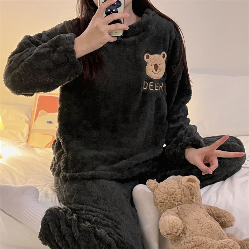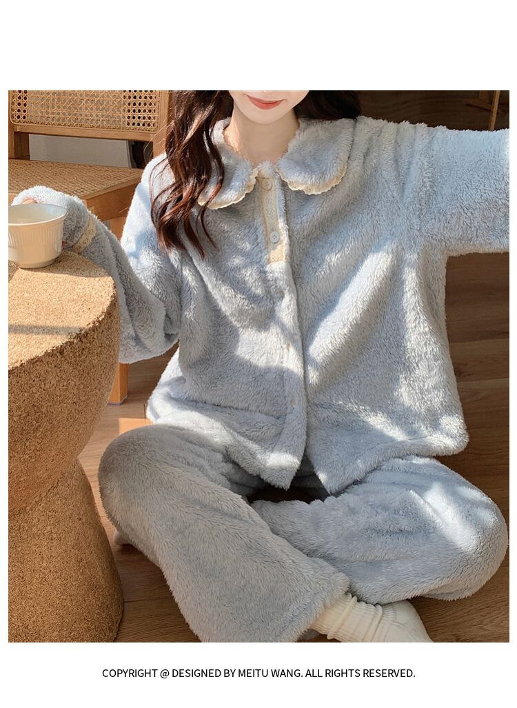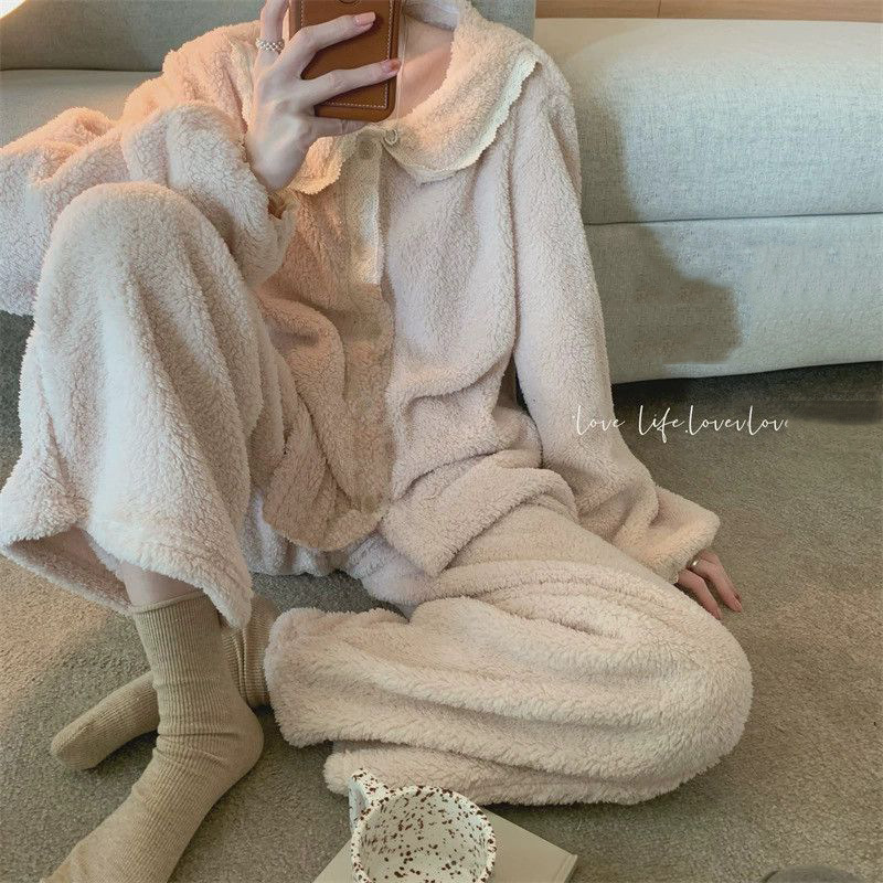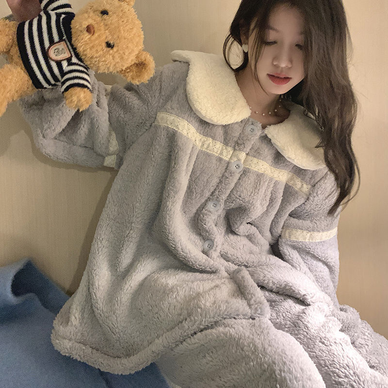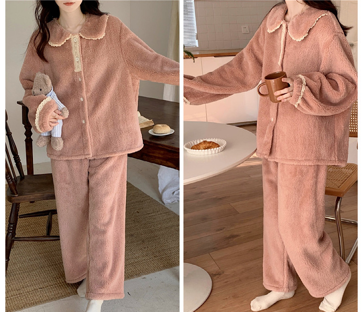 겨울 공주 스타일 잠옷 여성 플란넬 레이스 코트 홈 옷 한국 산호 양털 샤넬 스타일 두꺼운 세트스토어 가기