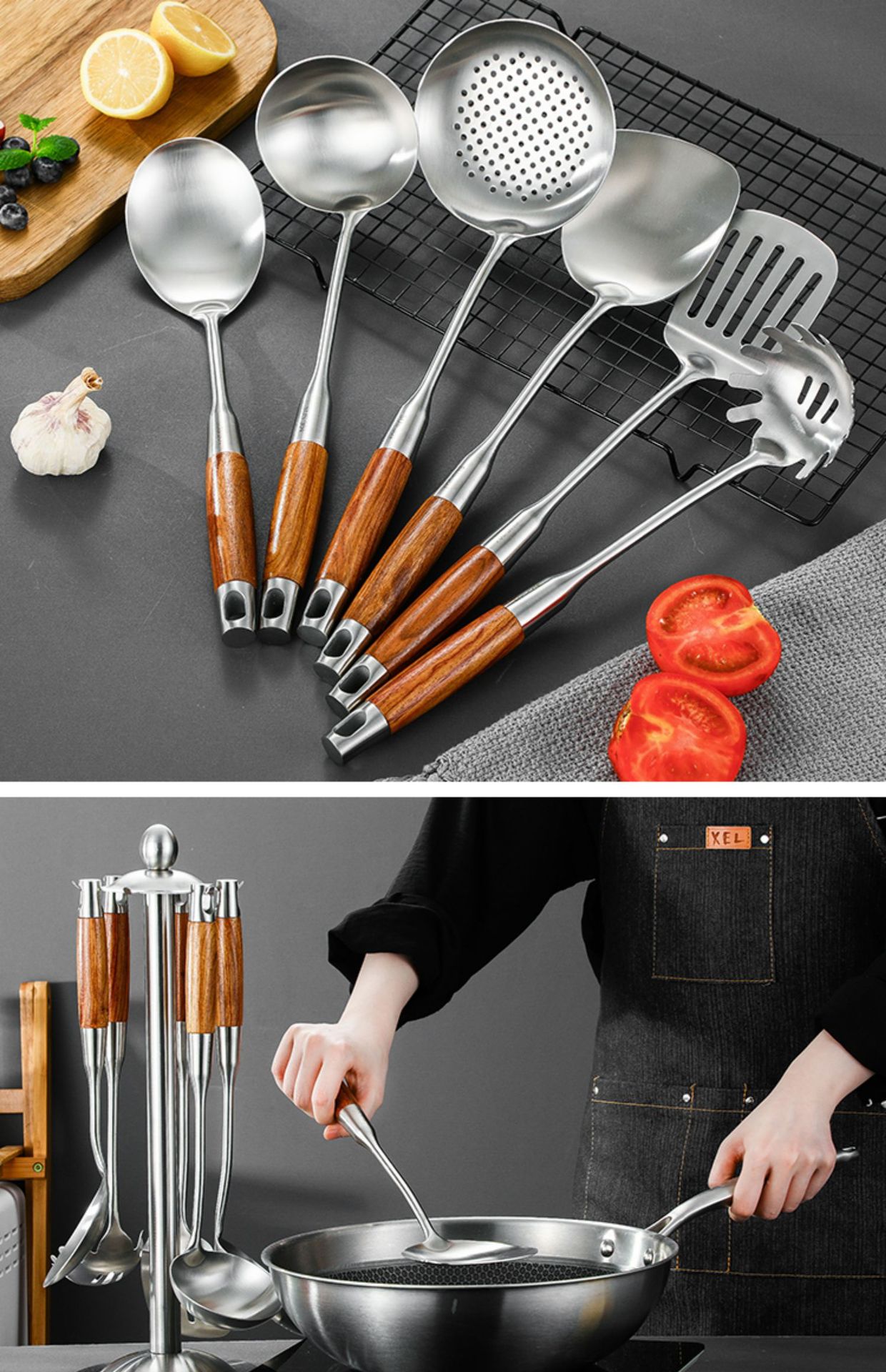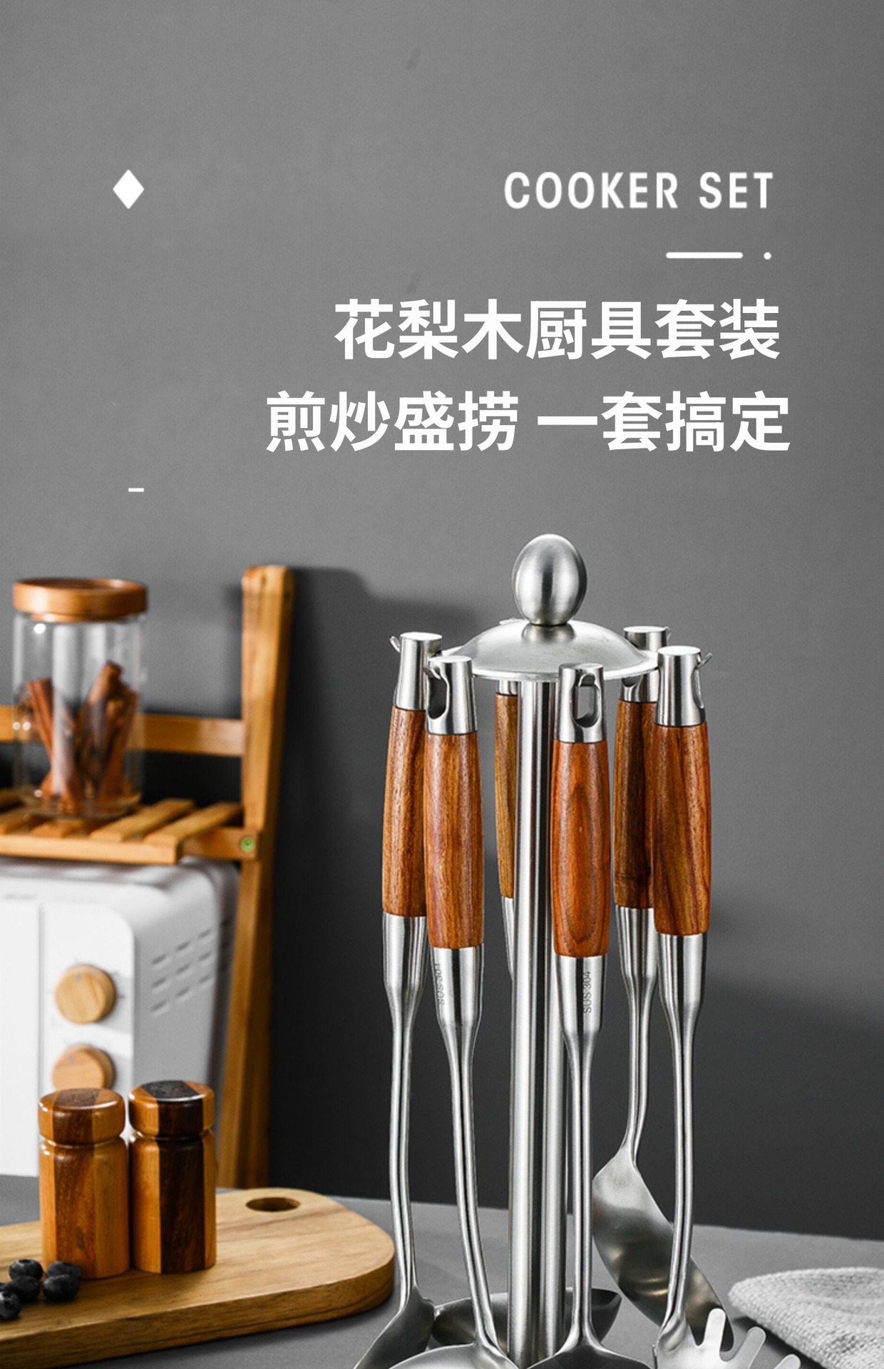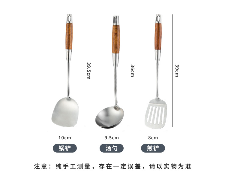 304 히노키 나무 스테인리스 주걱 및 국자 가정용 주방 조리 도구 세트