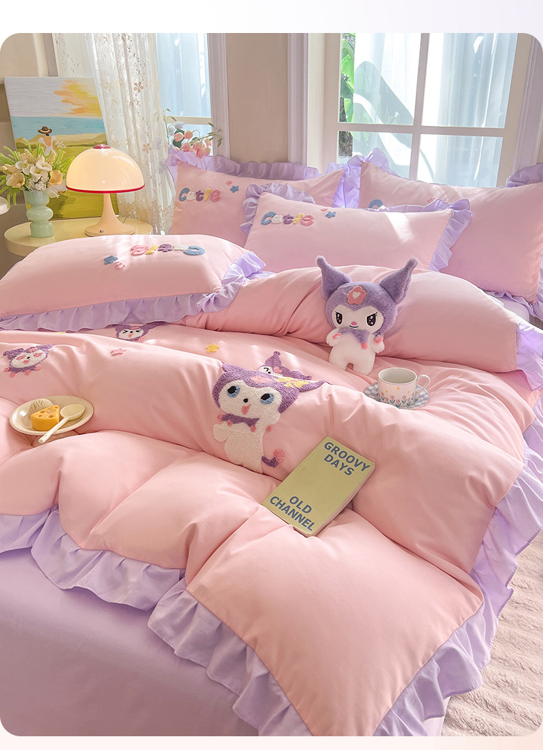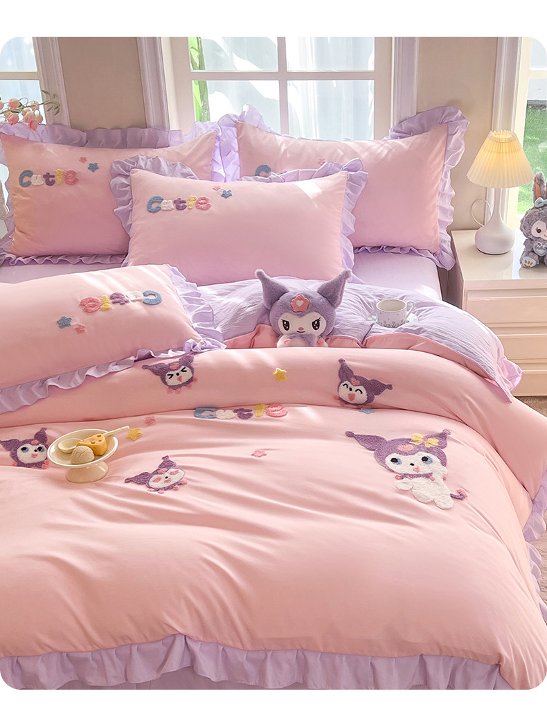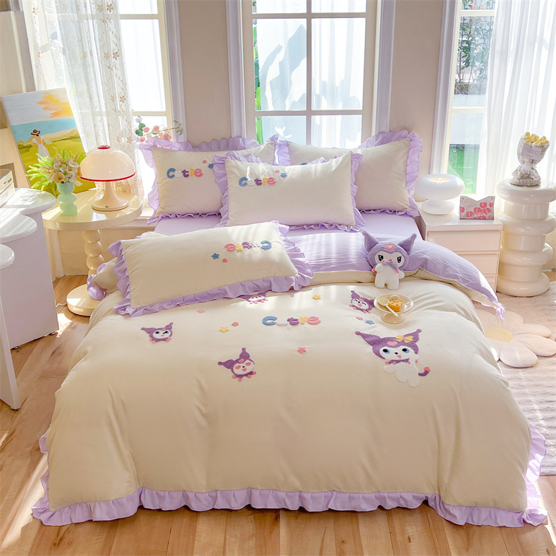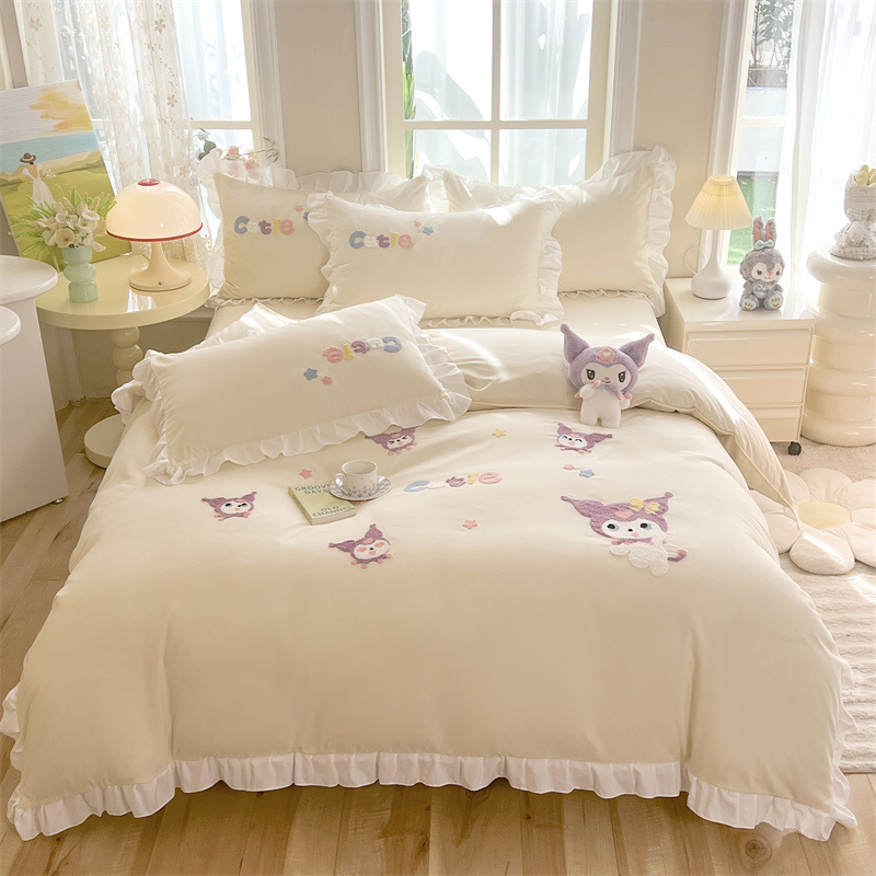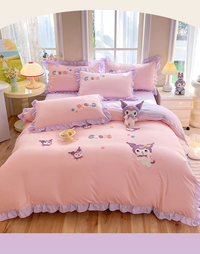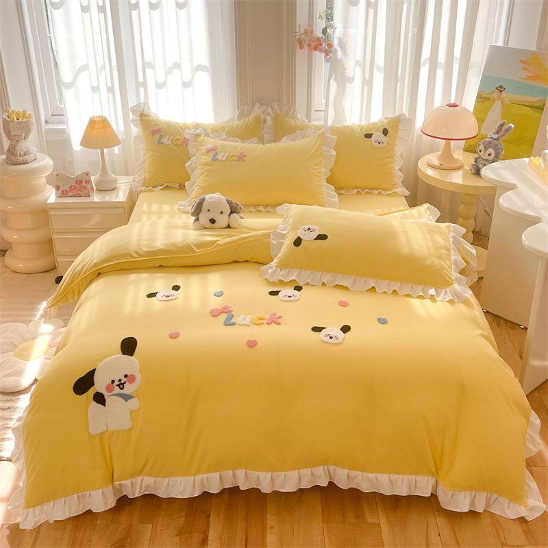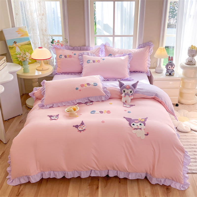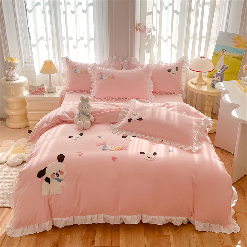 새로운 한국식 레이스 타월 자수 4 피스 어린이 만화 3 피스 코튼 세정면 침대 시트 퀼트 커버