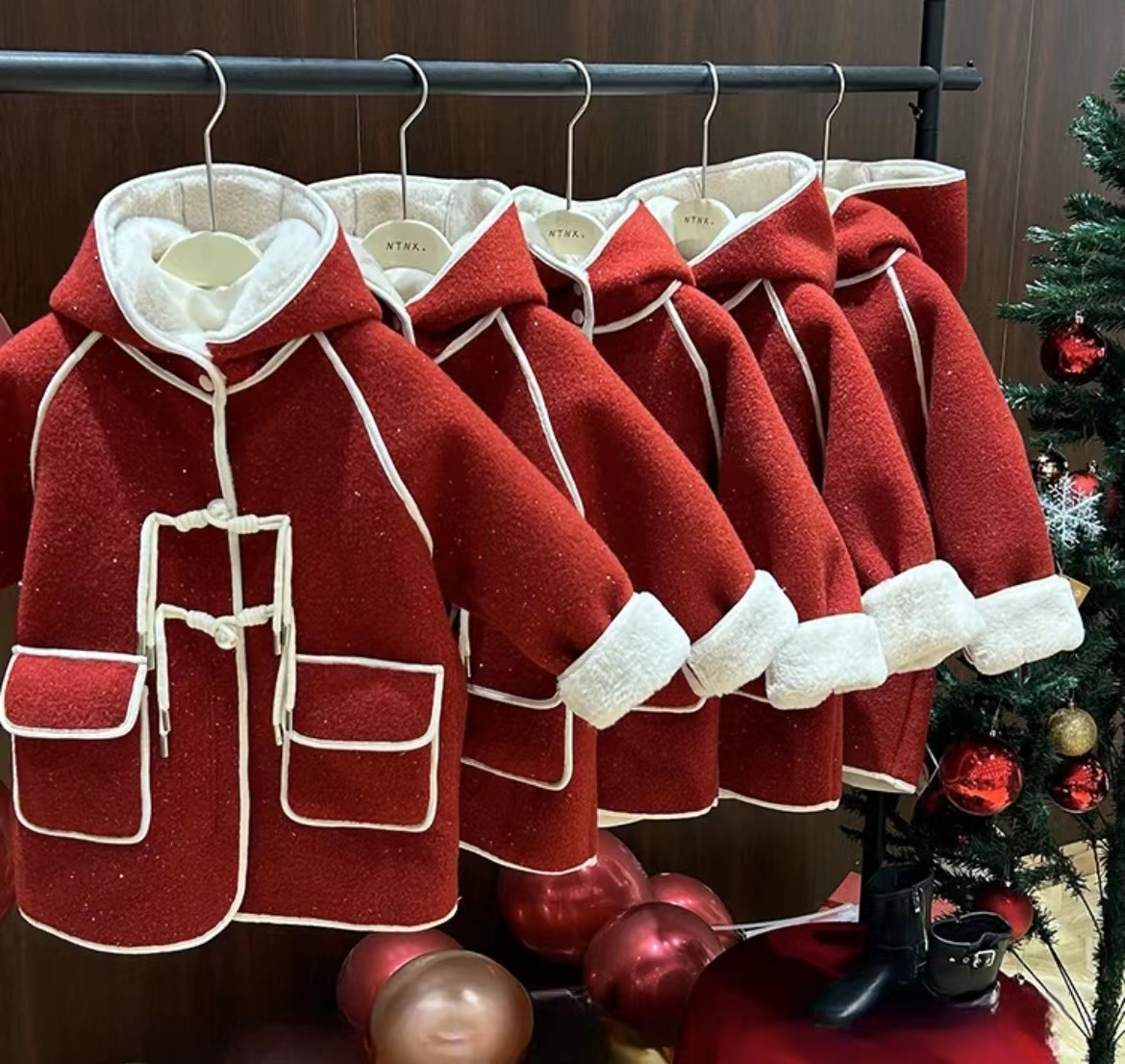 소녀 기모 모직 코트 겨울 옷 2023 새 어린이 모직 코트 아기 빨간 새해 옷 새해 복스토어 가기