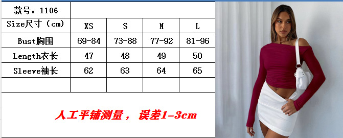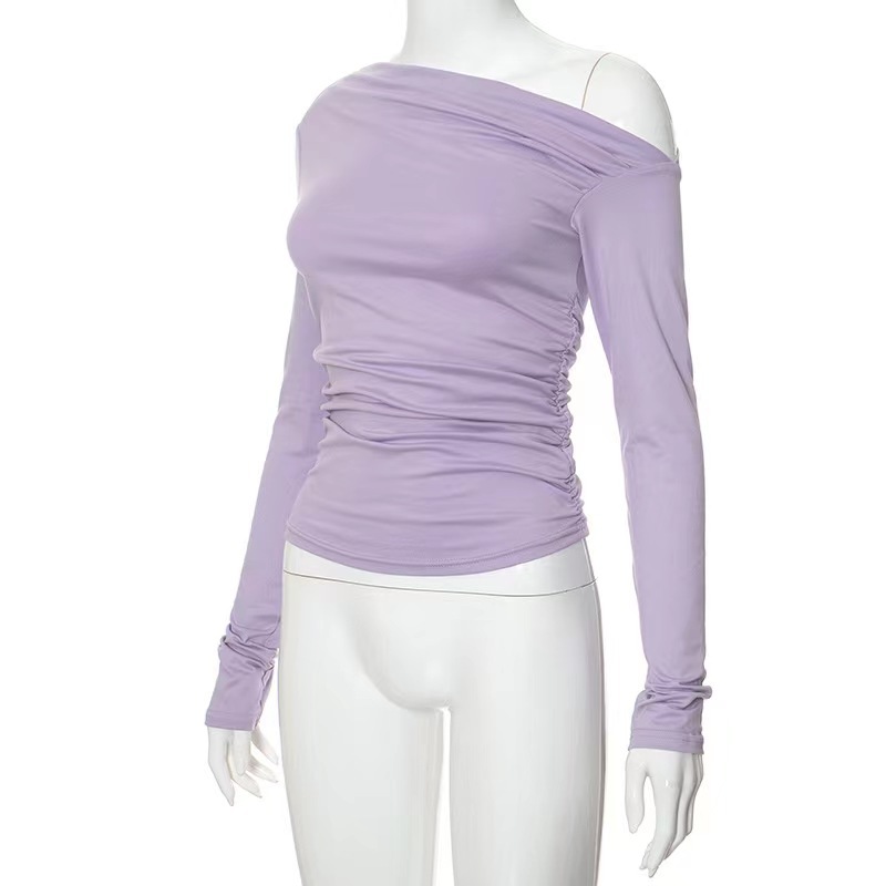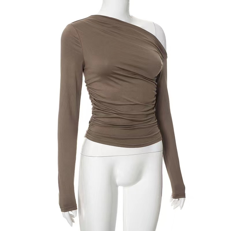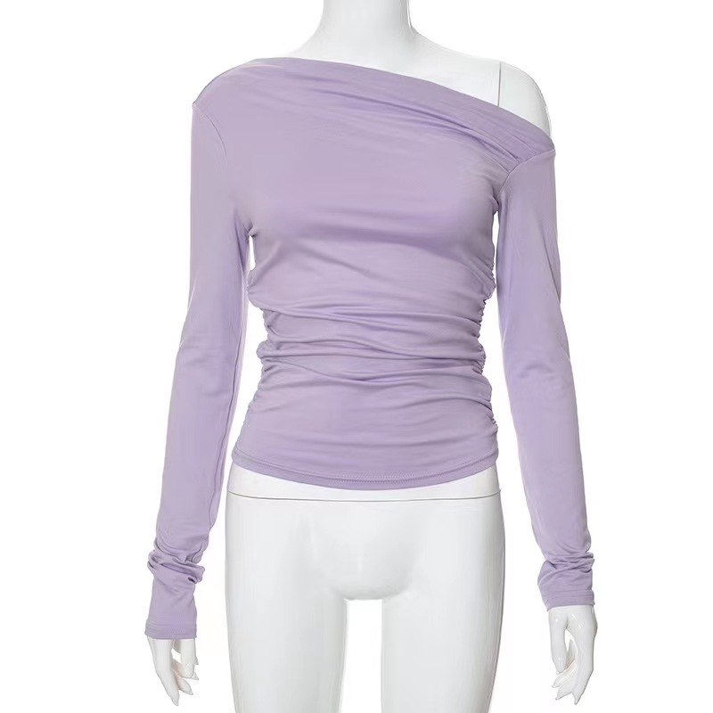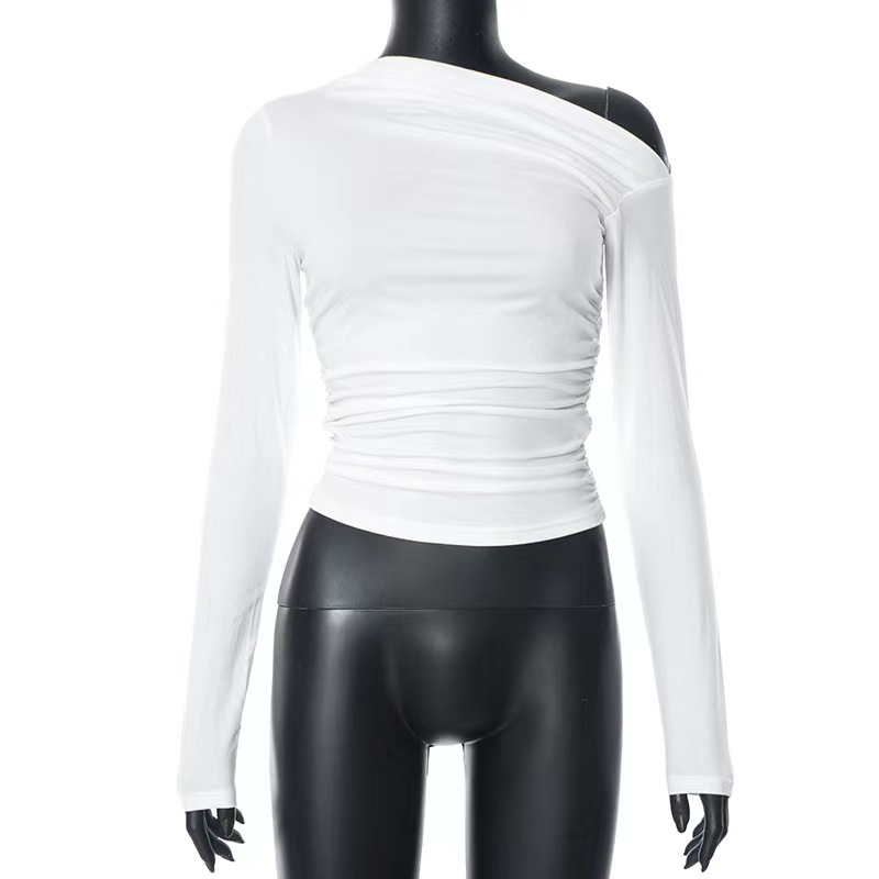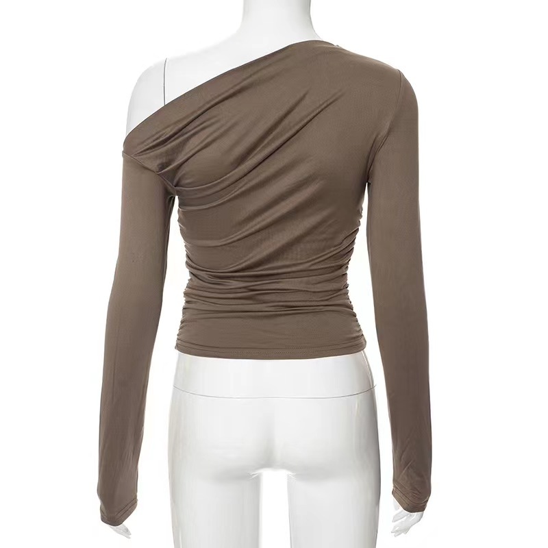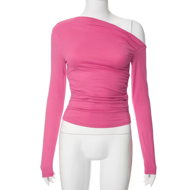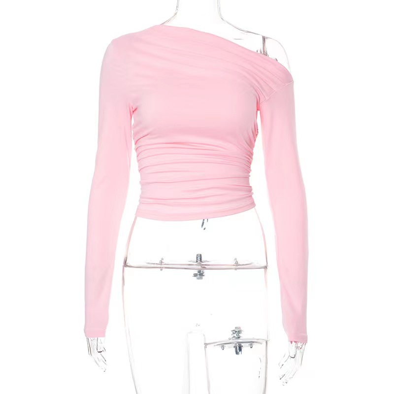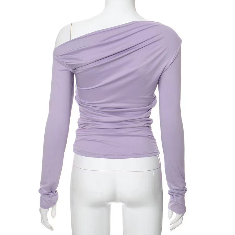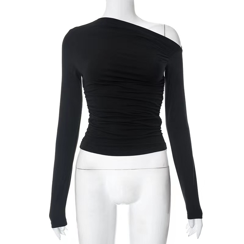 2024 비대칭 숄더 디자인 솔리드 컬러 크롭탑 긴팔 슬림핏 배색 디자인 다용도 사선넥 캐주얼
