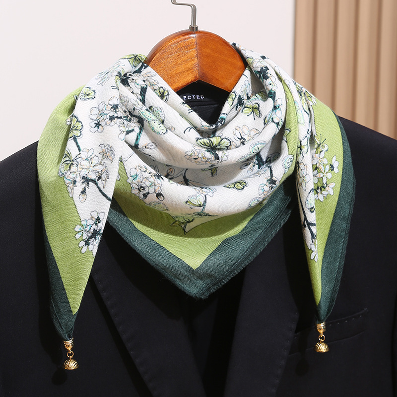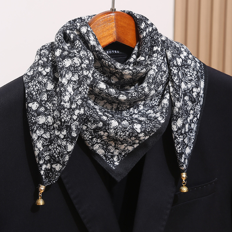 • 꽃과 새 흰색 + 금속 자석 버클 스카프