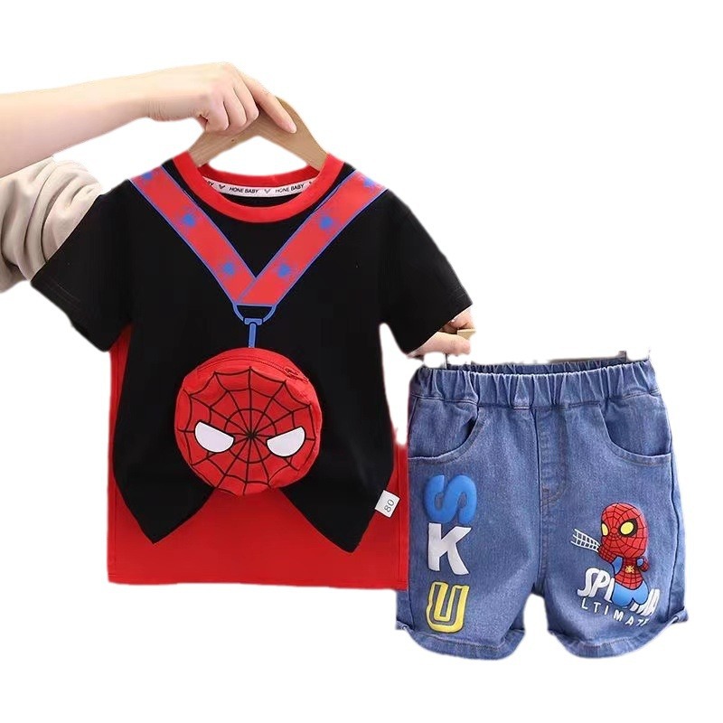 어린이 여름 스타일 슈트 스파이더맨 가방 스타일 패션 트렌드 어린이용 시원한 만화 패턴 반팔스토어 가기