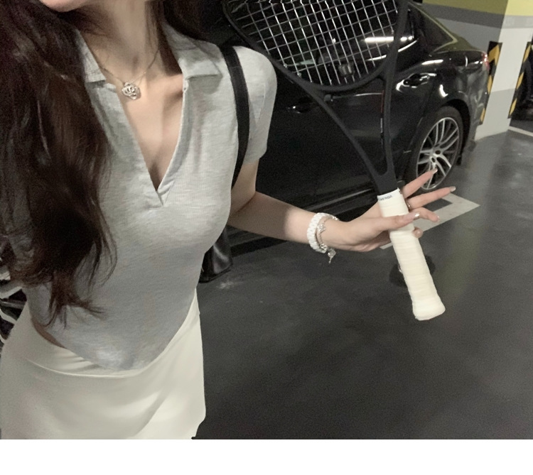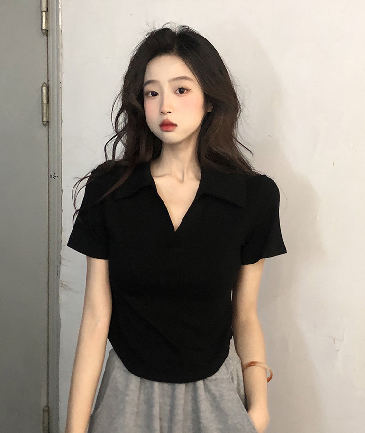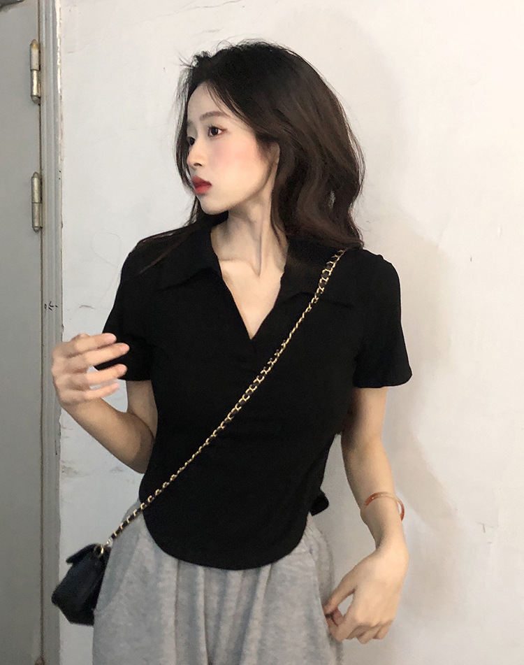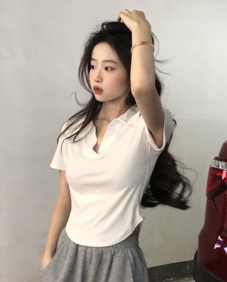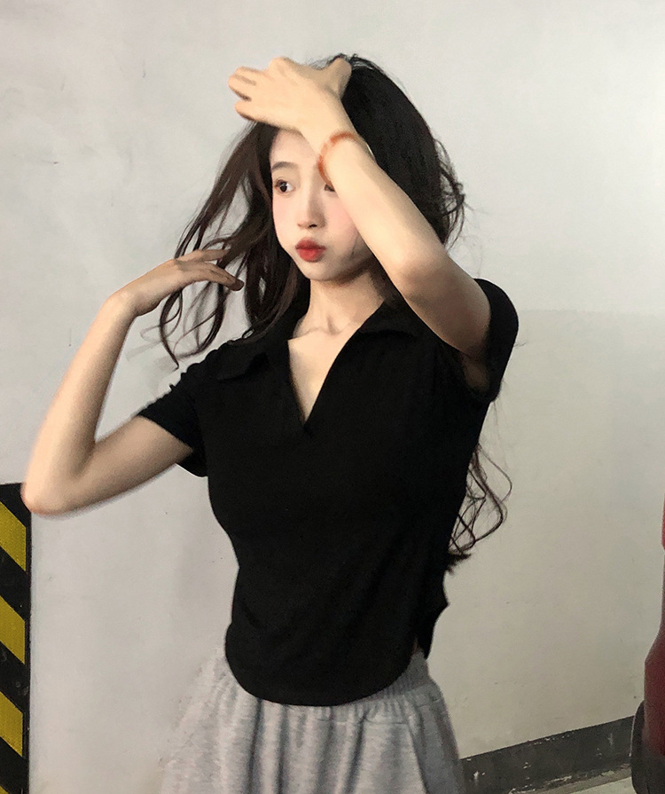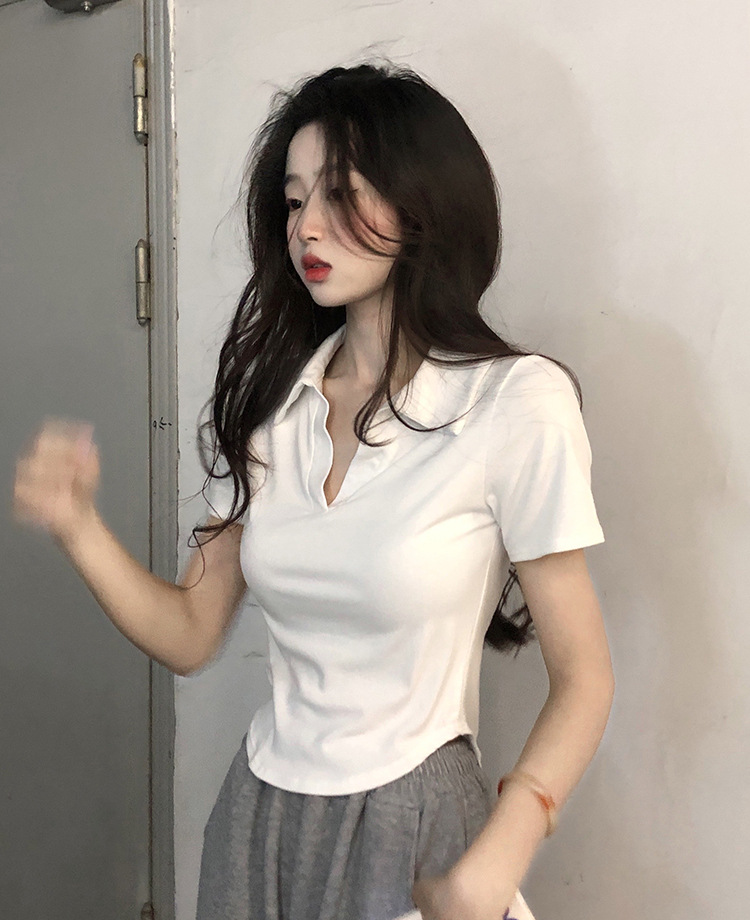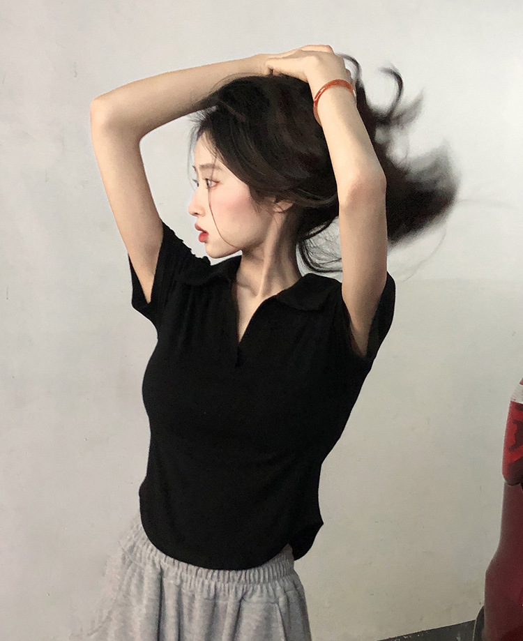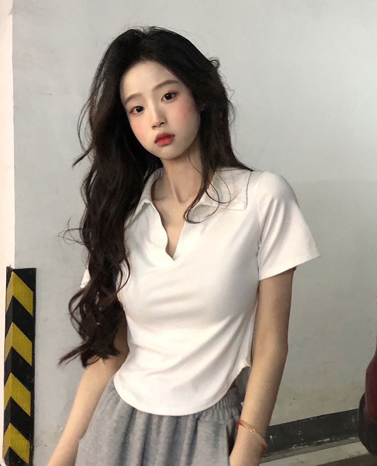아이스 실크 스레드 폴로 칼라 반팔 티셔츠 여성 여름 한국 스타일 슬림-핏 불규칙한 바닥 셔츠 티셔츠 탑 아우터웨어