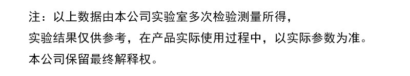 2.(注:以上数据由本公司实验室多次检验测量所得,实验结果仅供参考,在产品实际使用过程中,以实际参数为准。本公司保留终解释权。)