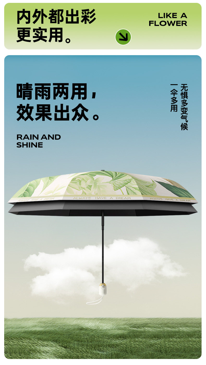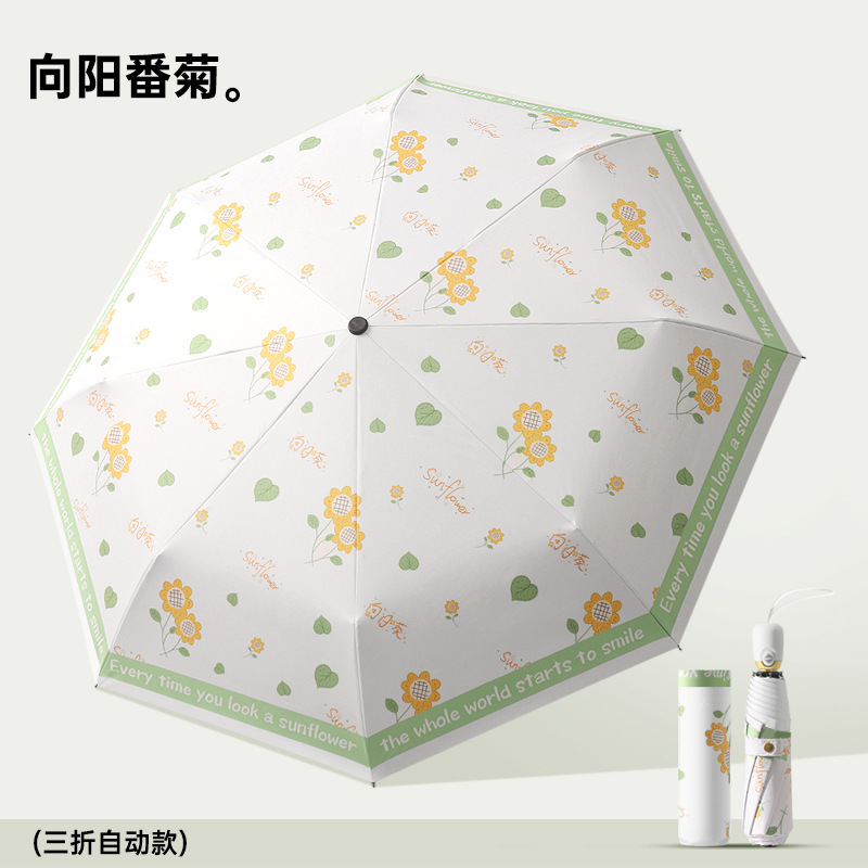완전 자동 이중 목적 신선한 꽃 인쇄 우산 여성의 3 배 우산 검은 고무 차양 자외선 차단