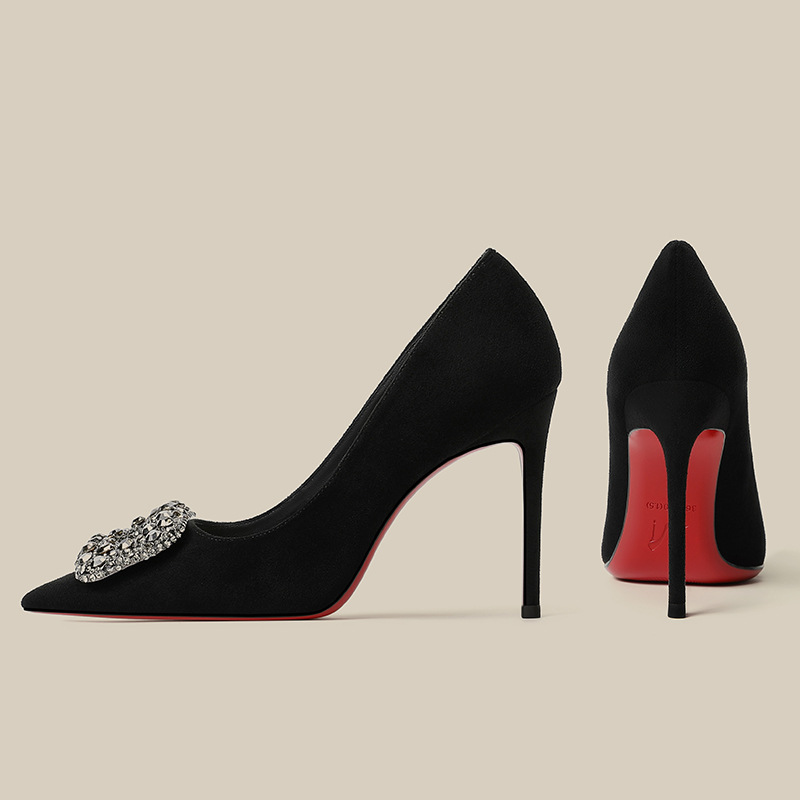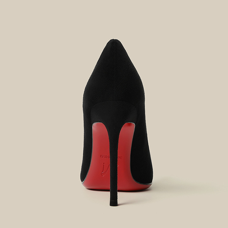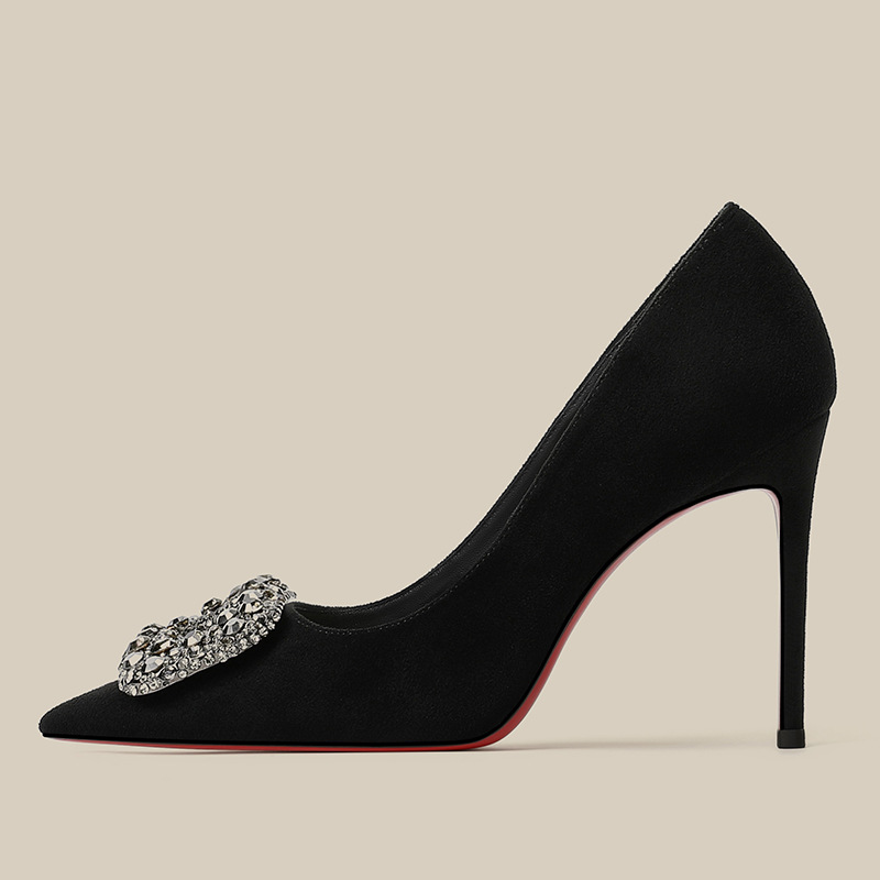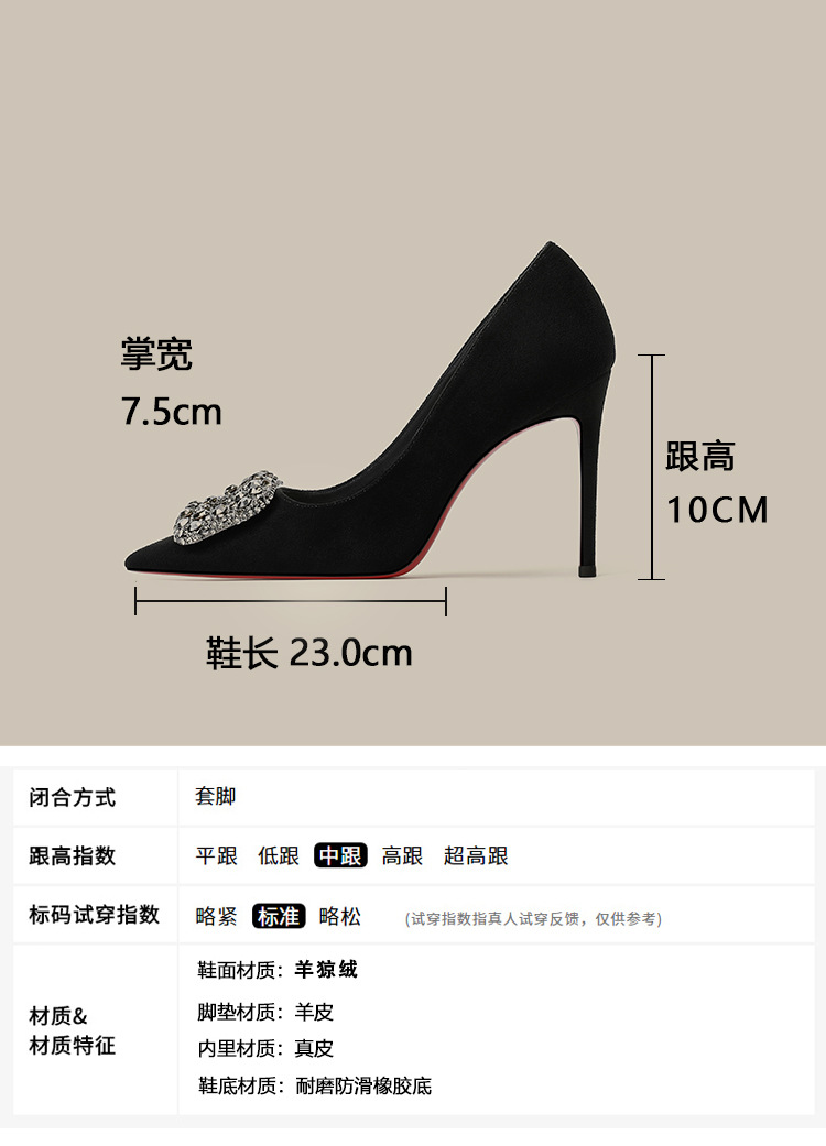 2023 새로운 모조 다이아몬드 버클 블랙 스웨이드 하이힐 여성 스틸레토 힐 뾰족한 얕은 입 올 매치 원피스 매트 슈즈스토어 가기