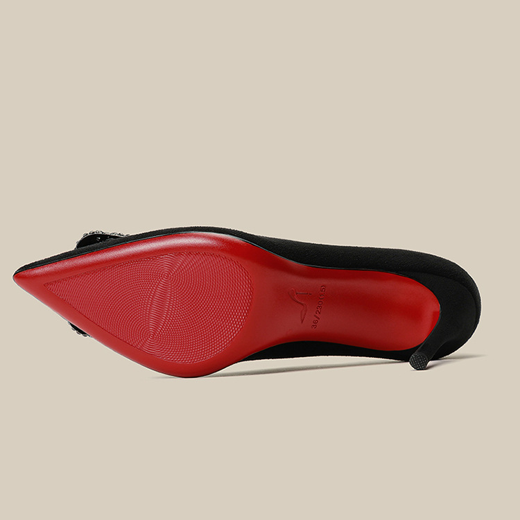 2023 새로운 모조 다이아몬드 버클 블랙 스웨이드 하이힐 여성 스틸레토 힐 뾰족한 얕은 입 올 매치 원피스 매트 슈즈