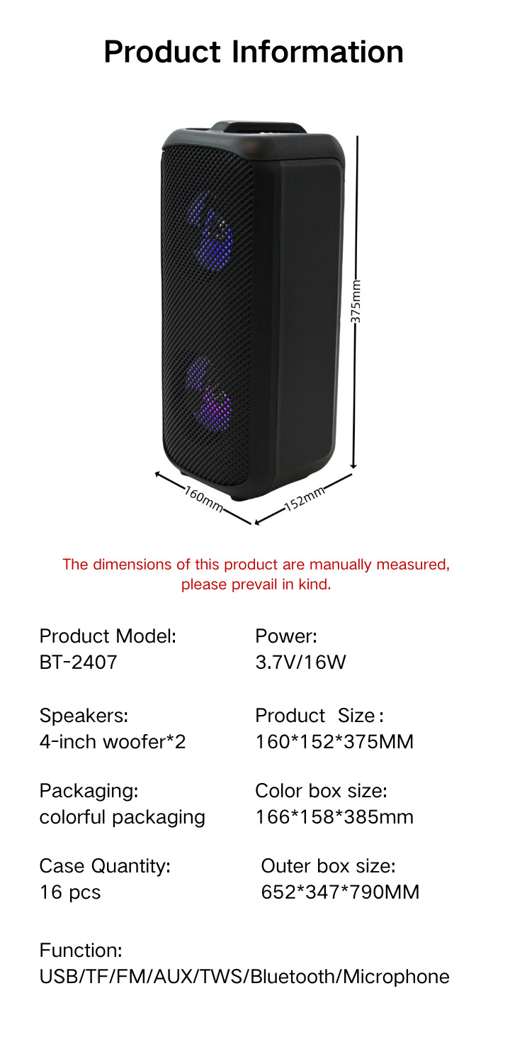 O8K BT-2407 야외용 4inch 듀얼 스피커 오디오 편리한 서브우퍼 다채로운 LED 조명 홈 스피커