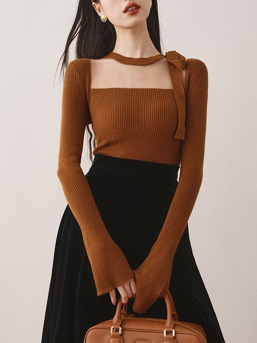 프랑스 다크 브라운 우아한 스웨터 여성 의류 2023 가을과 겨울 새로운 스타일 메쉬 디자인 스웨터 패션스토어 가기