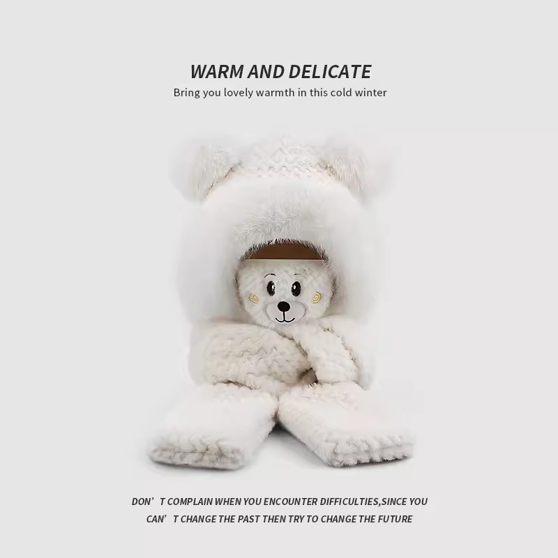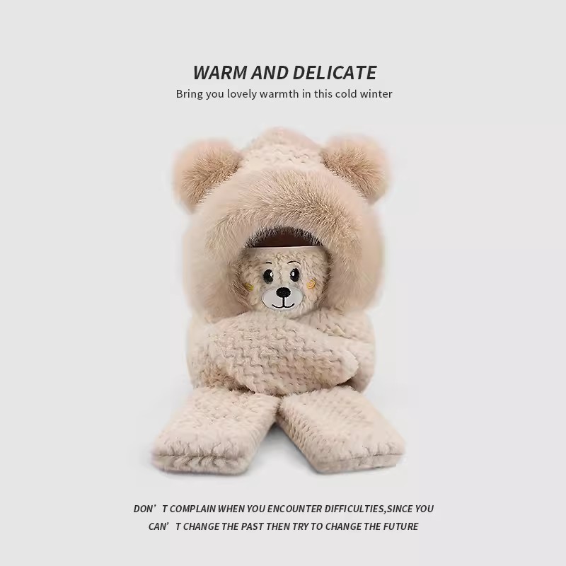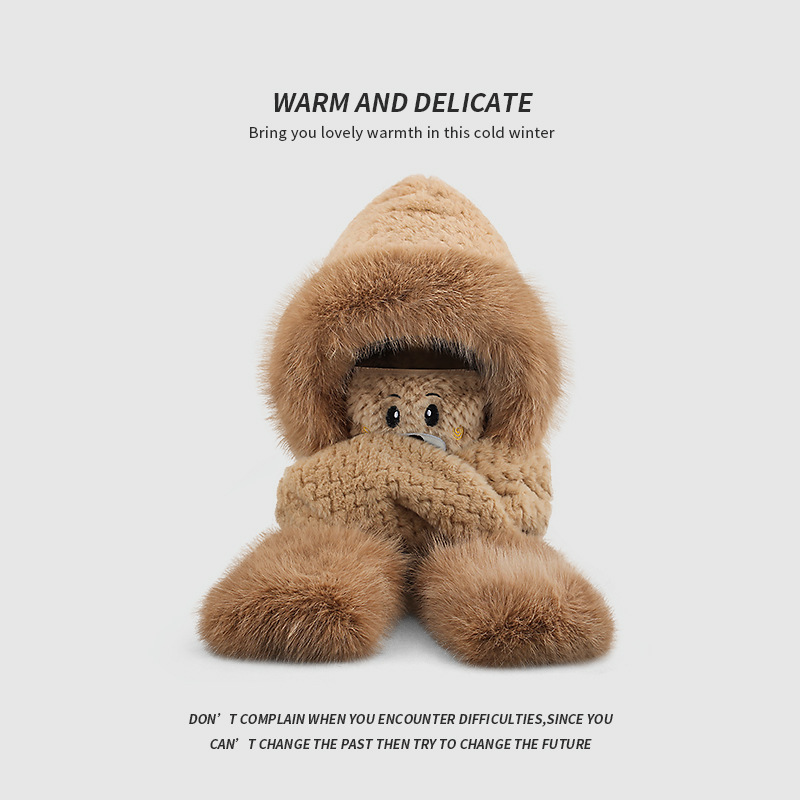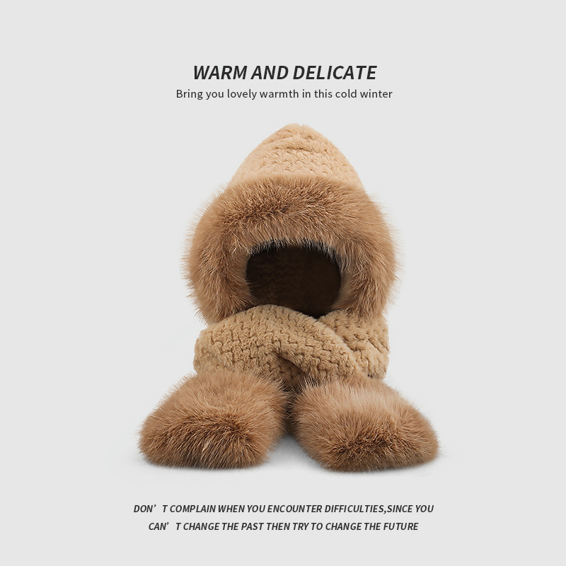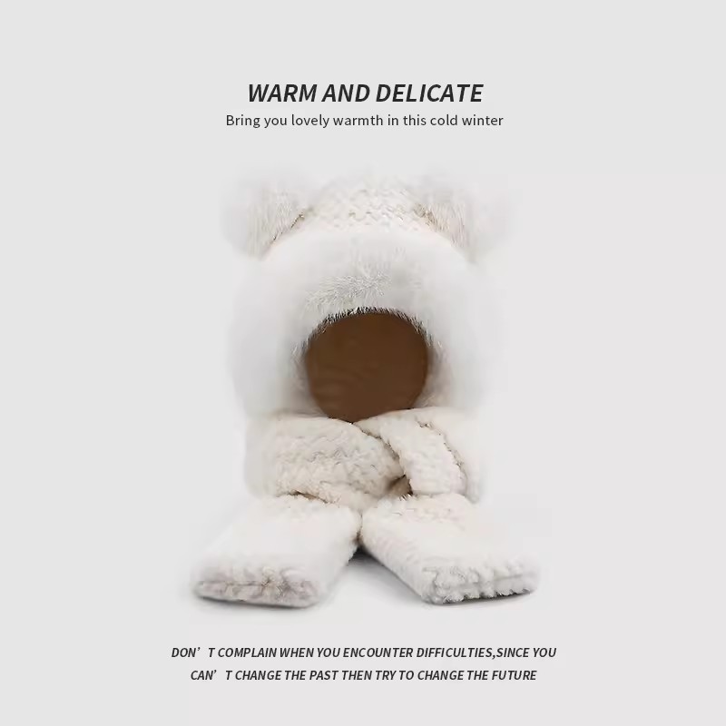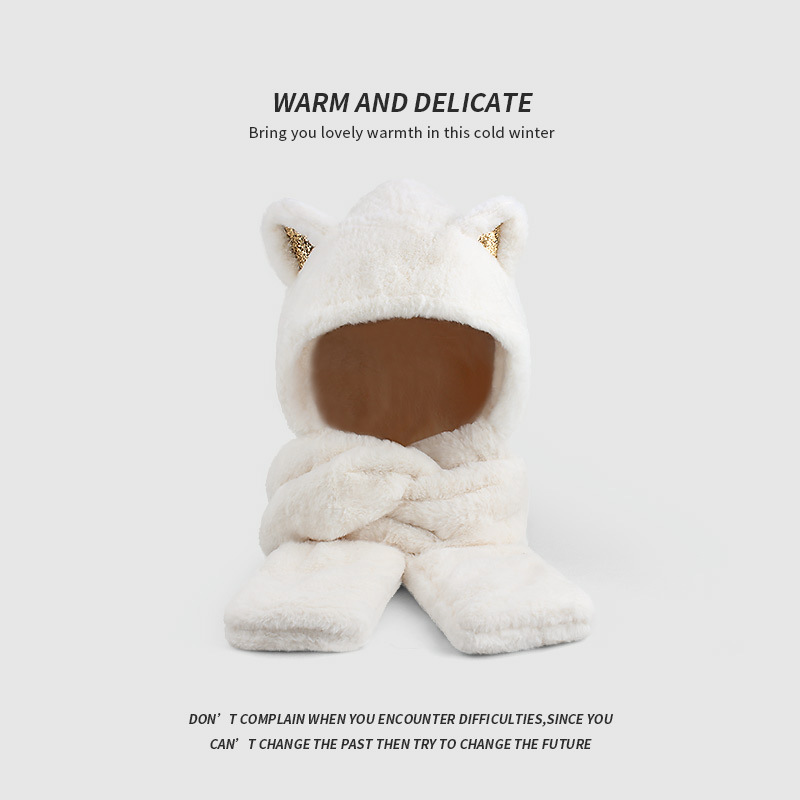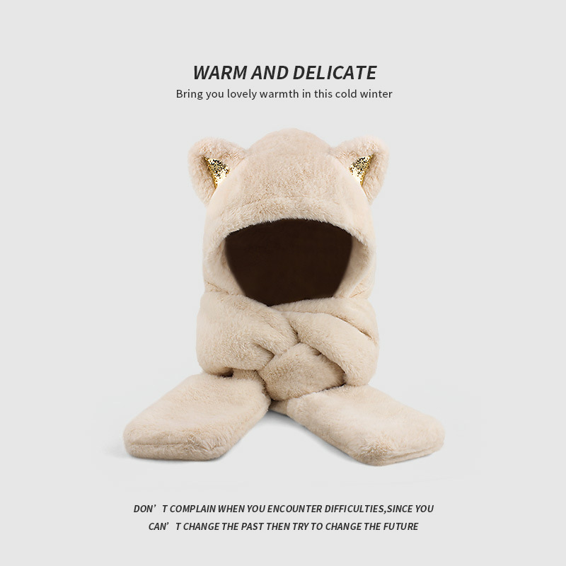 플러시 모자, 스카프, 장갑이 하나로 통합된 여성용 가을 겨울용 사이클링 방한 귀 보호 따뜻한 후드형 단색 3-in-1