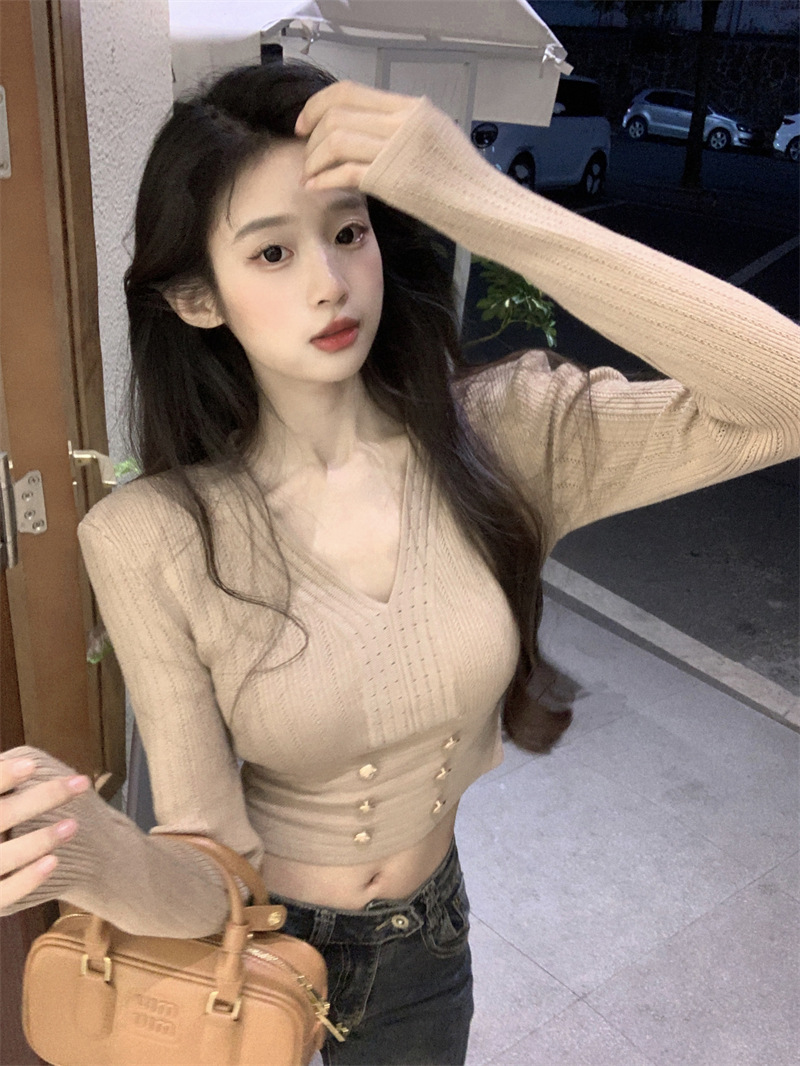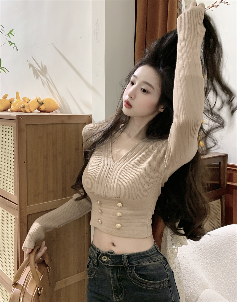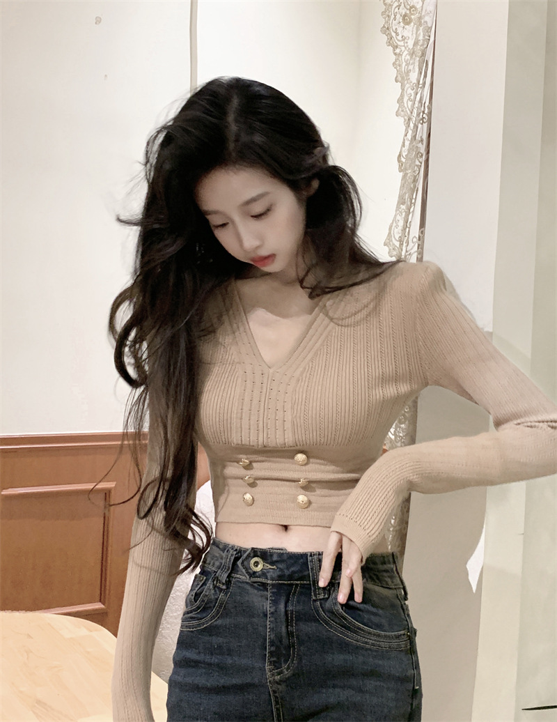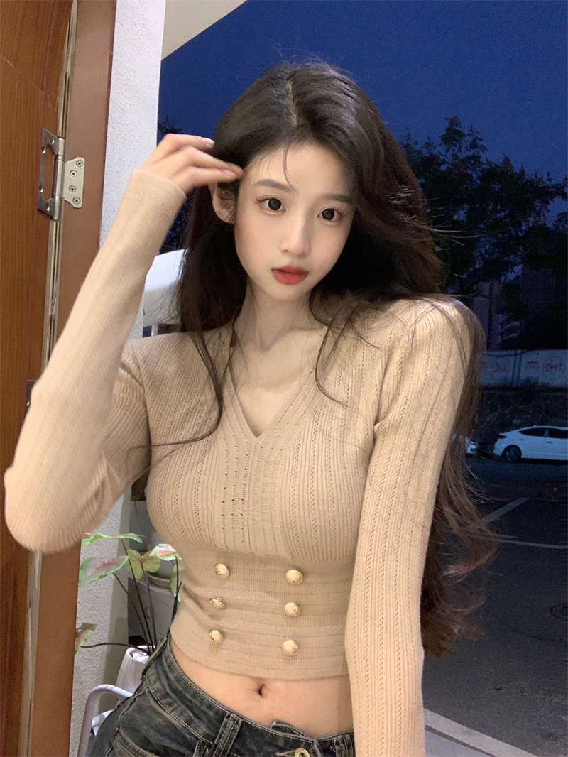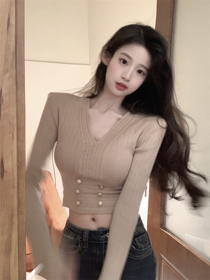 여성용 슬림 타이트한 허리 V 넥 긴팔 스웨터 가을과 겨울 매운 소녀 탑이있는 새로운 타이트한 짧은 바지 셔츠스토어 가기