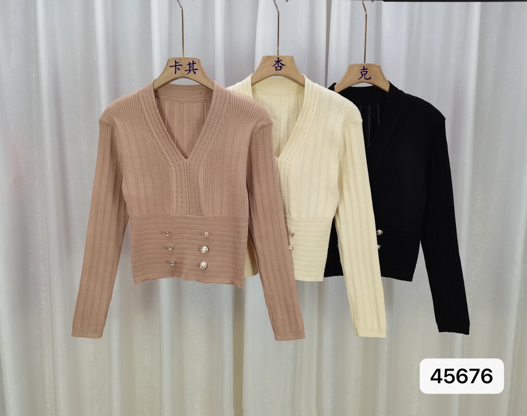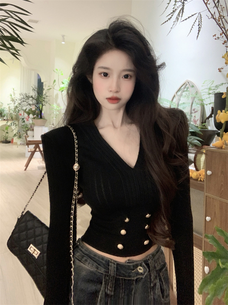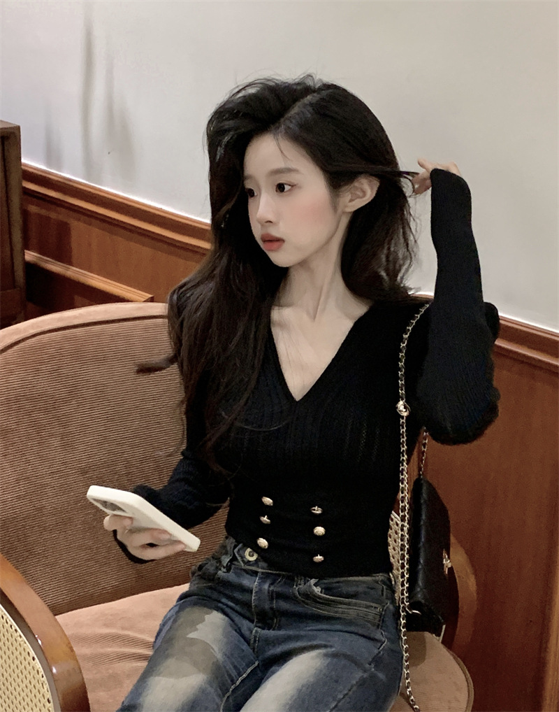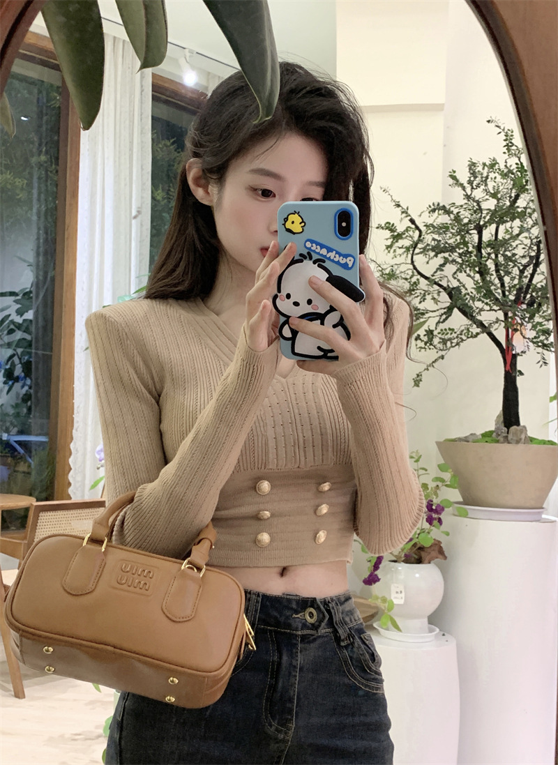 여성용 슬림 타이트한 허리 V 넥 긴팔 스웨터 가을과 겨울 매운 소녀 탑이있는 새로운 타이트한 짧은 바지 셔츠스토어 가기