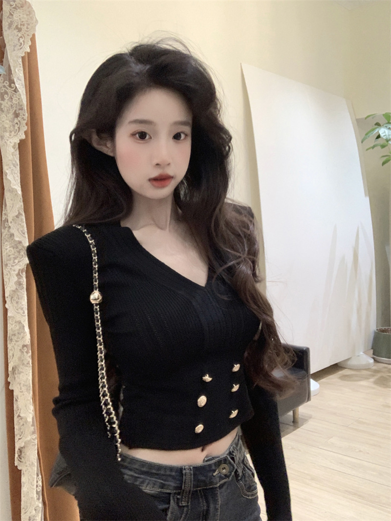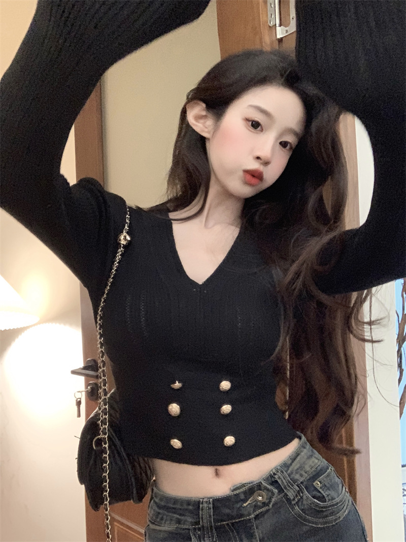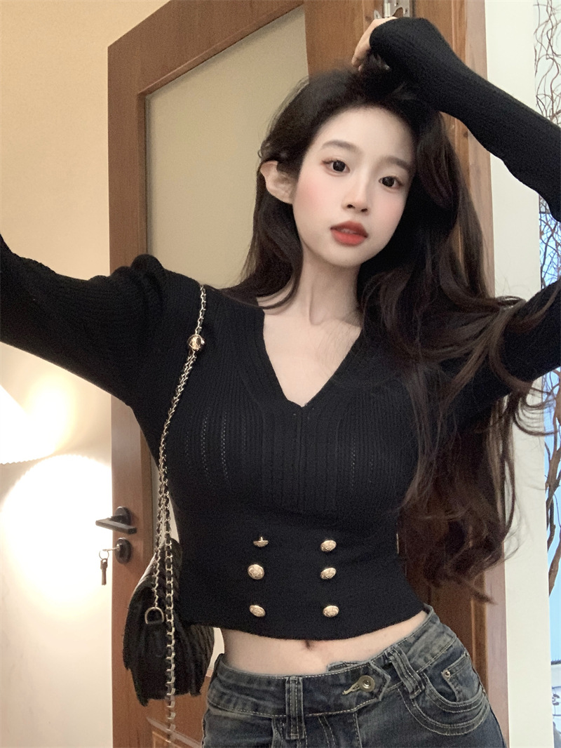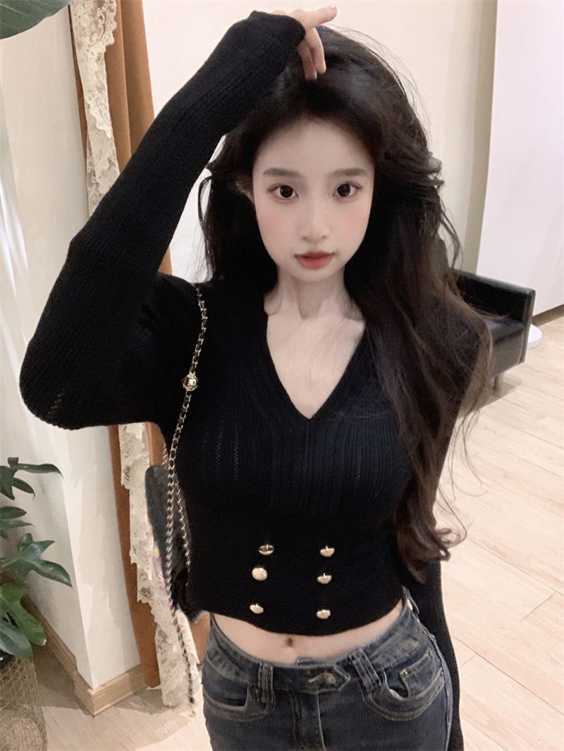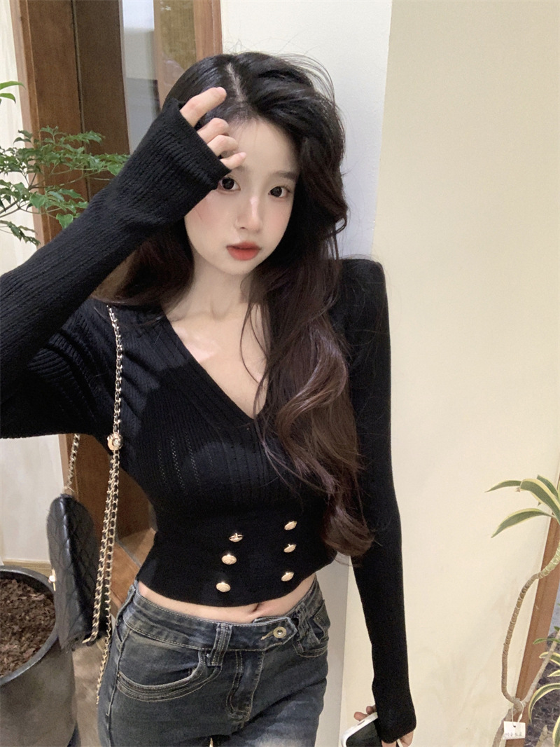 여성용 슬림 타이트한 허리 V 넥 긴팔 스웨터 가을과 겨울 매운 소녀 탑이있는 새로운 타이트한 짧은 바지 셔츠