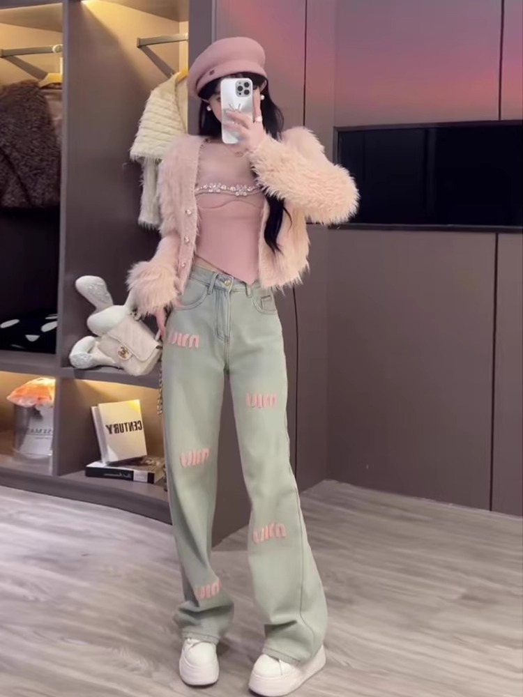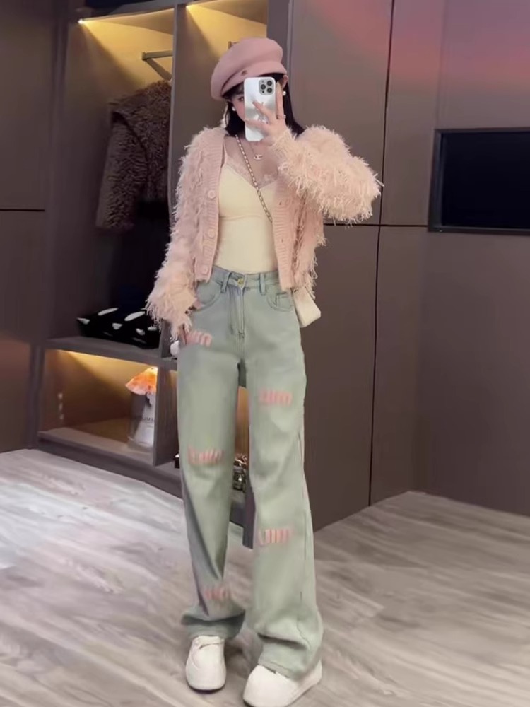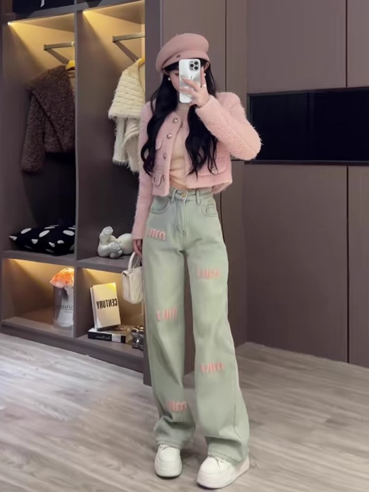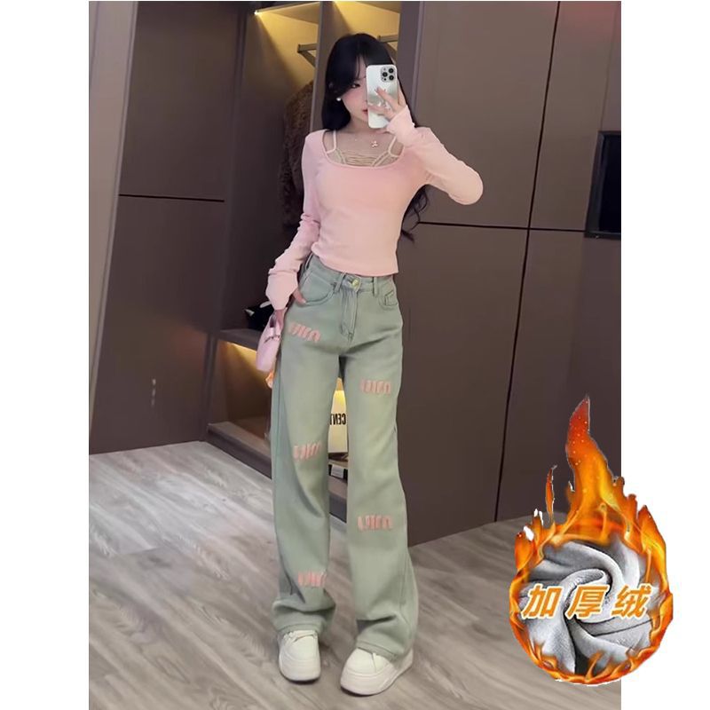 미국식 자수 높은 허리 기모 두꺼운 청바지 여성 올 매치 아우터웨어 슬리밍 서양식 세탁 스트레이트 걸레 팬츠스토어 가기