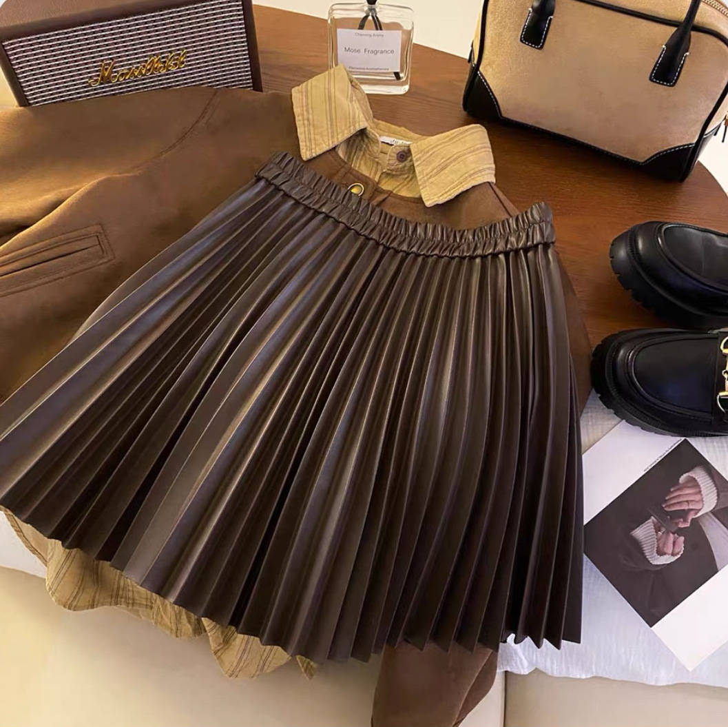 소녀의 봄과 가을 PU 가죽 얇은 주름 공주 스커트 한국 탄성 높은 허리 A 라인 노출 방지 블랙 작은 가죽 스커트