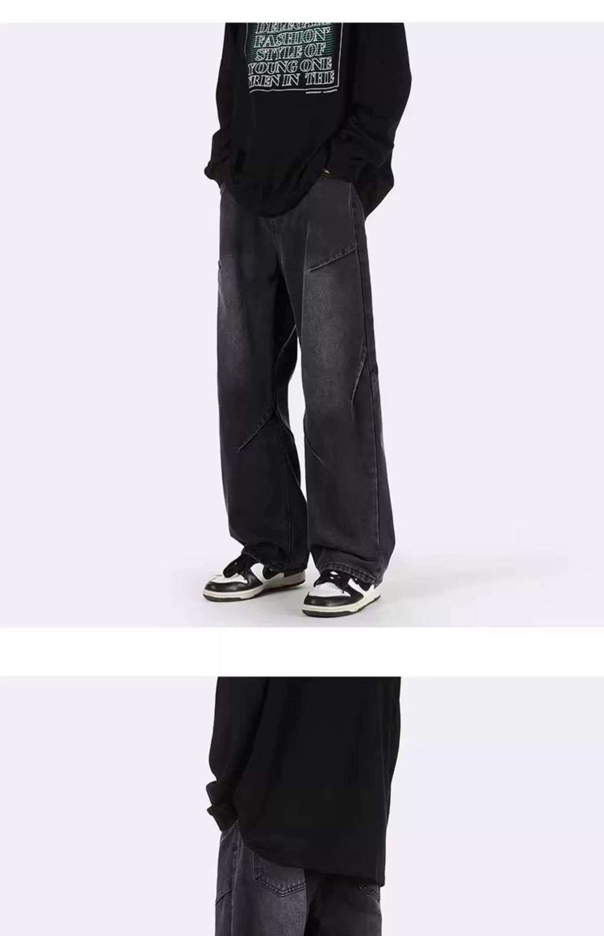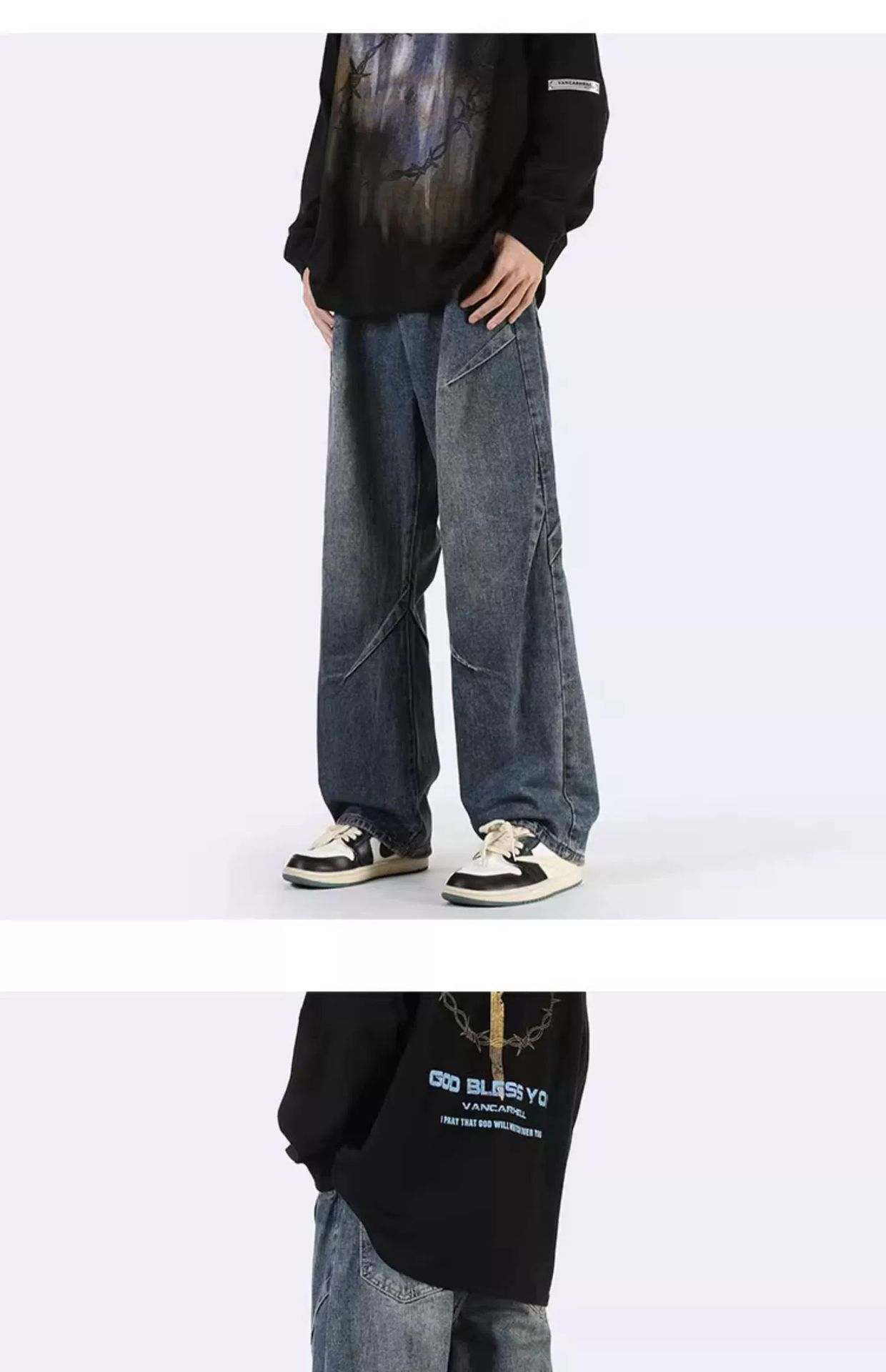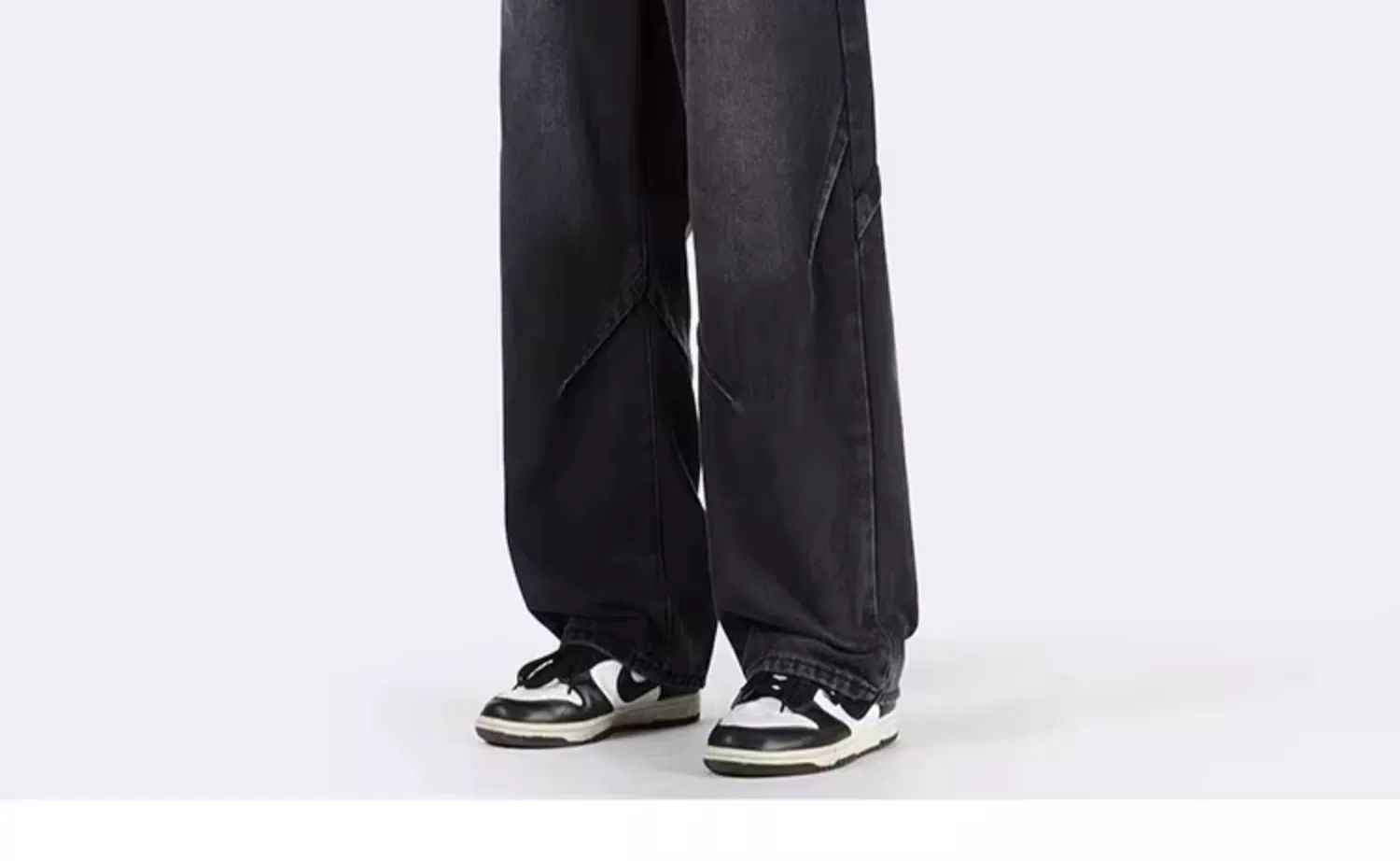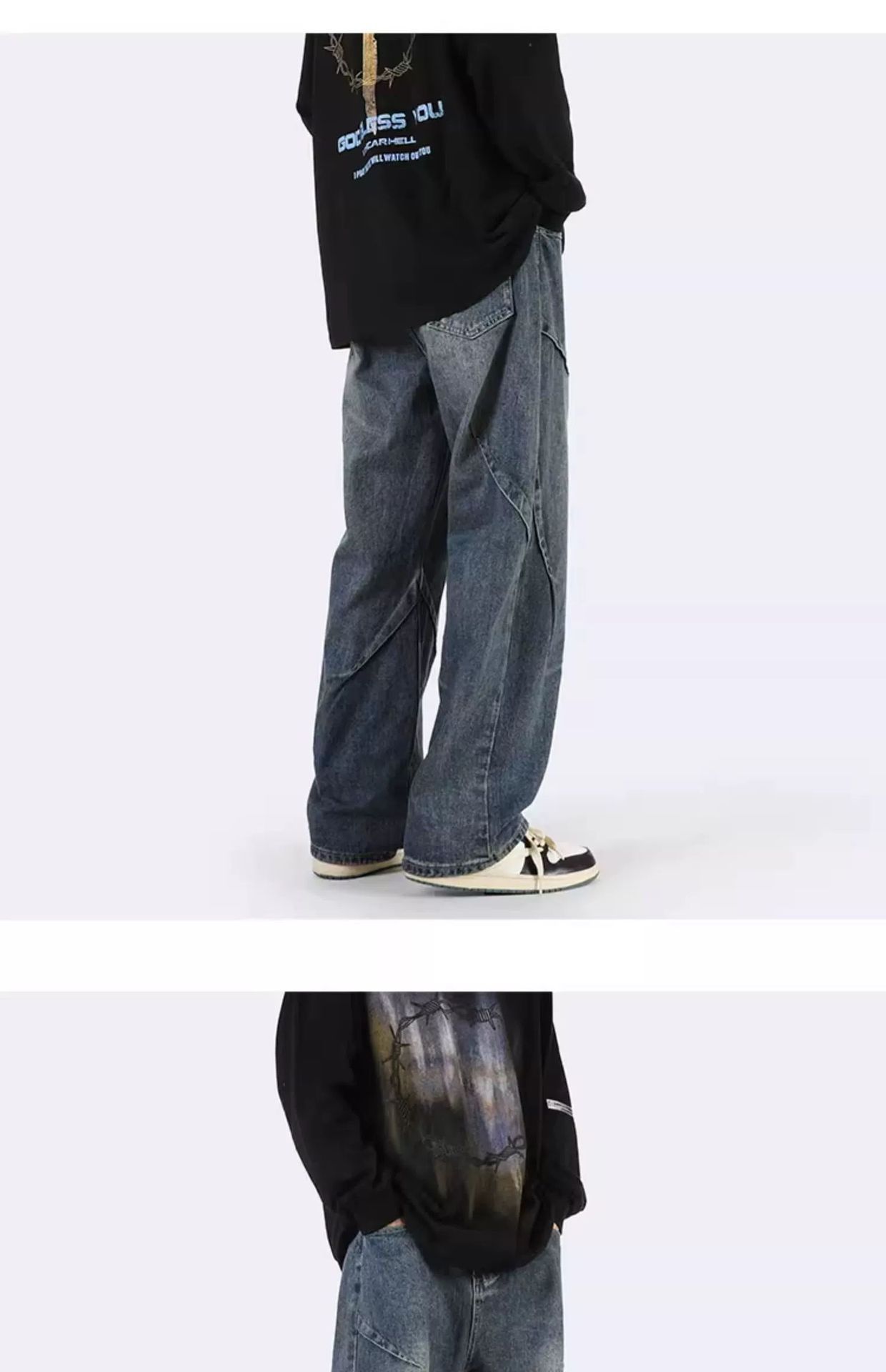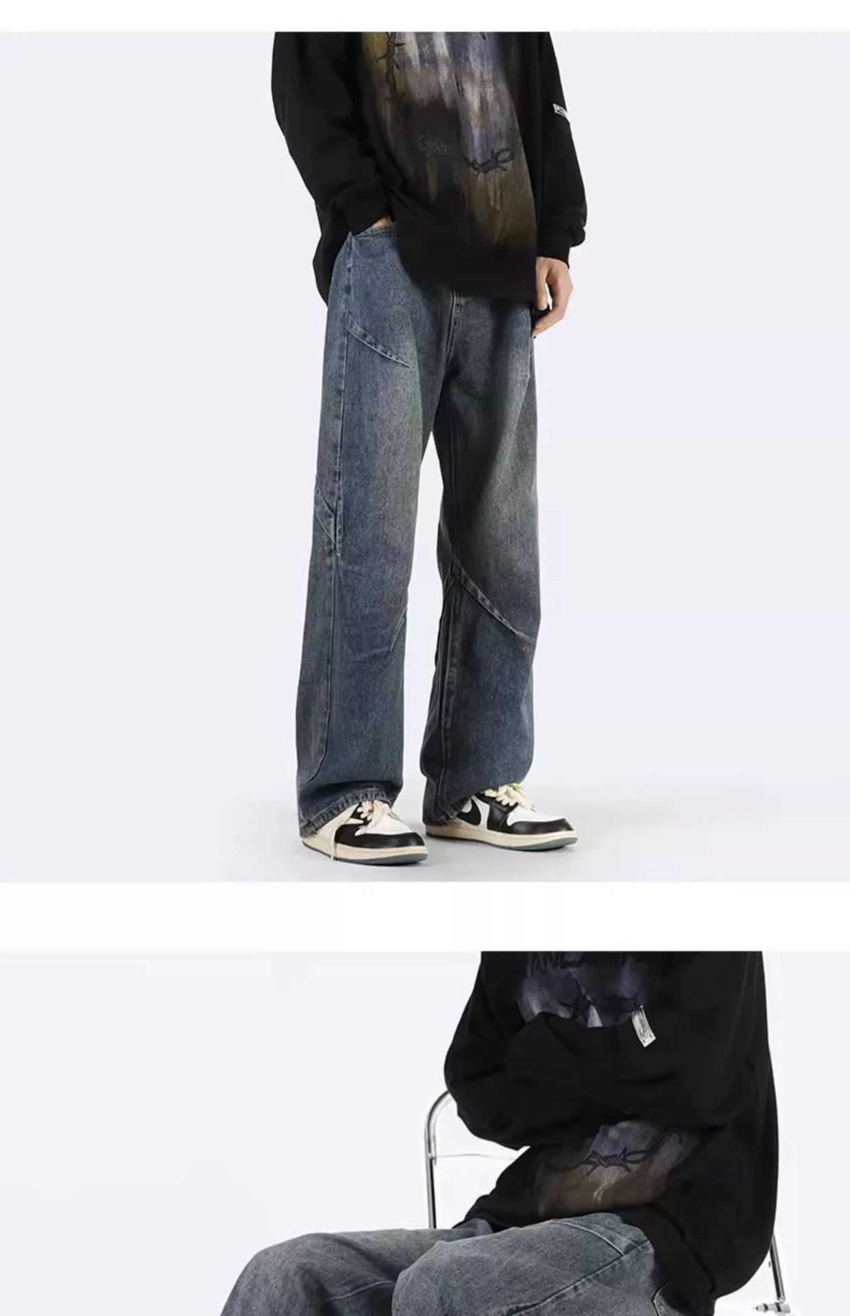 패치 워크 청바지 남성용 가을과 겨울 넓은 다리가 느슨한 스트레이트 바지 틈새 디자인 감각 미국 하이 스트리트스토어 가기