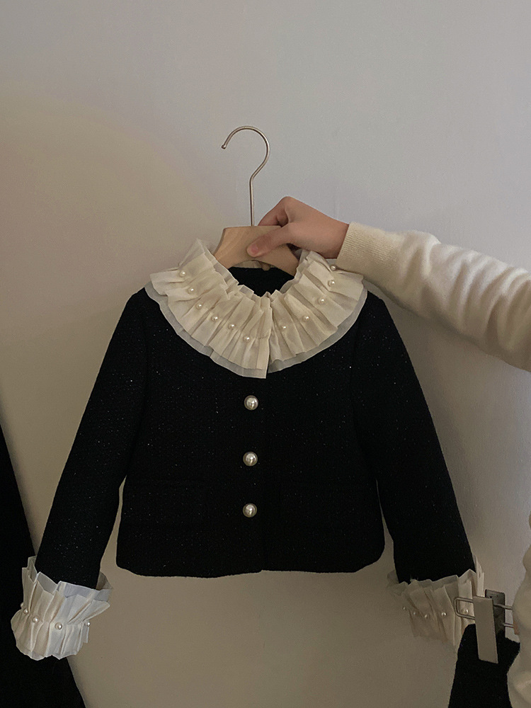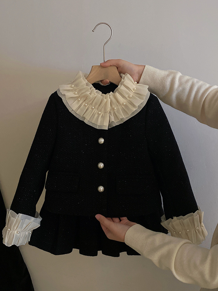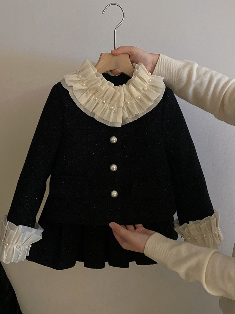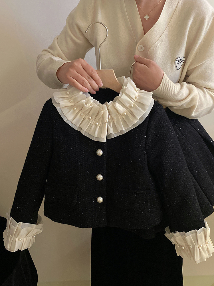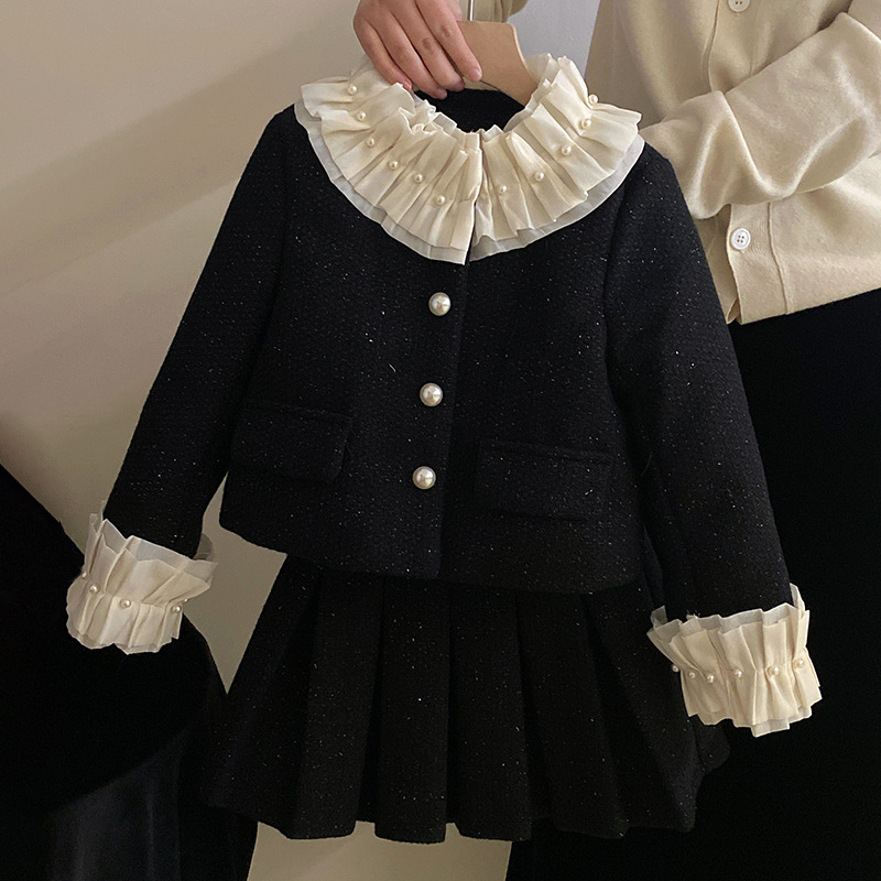 소녀 한국 스타일의 주름 구슬 절묘한 세트 2023 겨울 퀼트 샤넬 스타일 코트 세련된 주름 치마