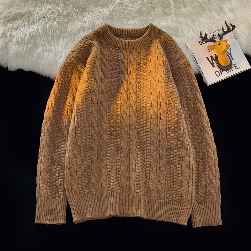 일본 복고풍 트위스트 스웨터 남자 2024 겨울 새로운 느슨한 간단한 단색 풀오버 라운드 넥 스웨터 코트스토어 가기