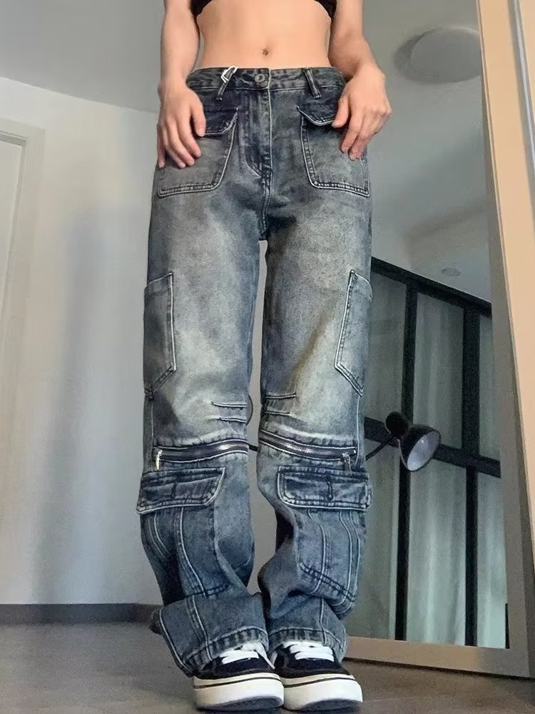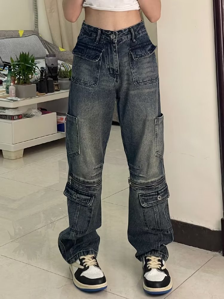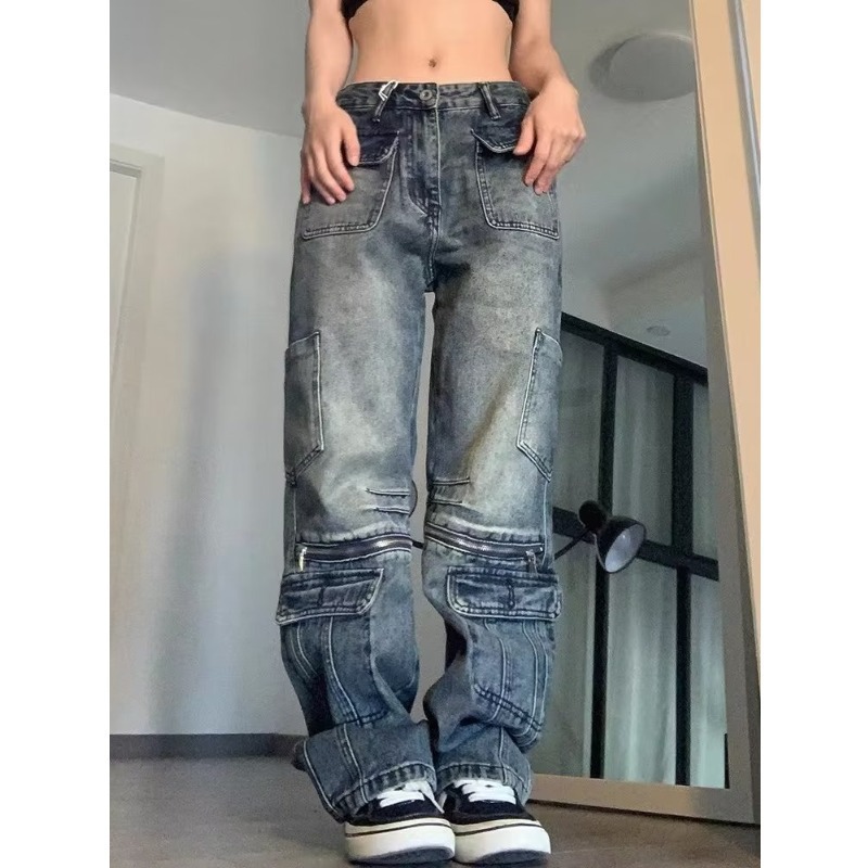 아메리칸 스트리트 멀티 포켓 작업복 청바지 플러스 사이즈 여성 여름 새로운 느슨한 스트레이트 와이드 레그 팬츠 슬리밍 패션스토어 가기