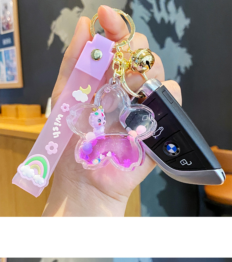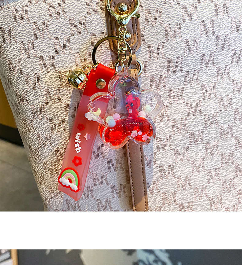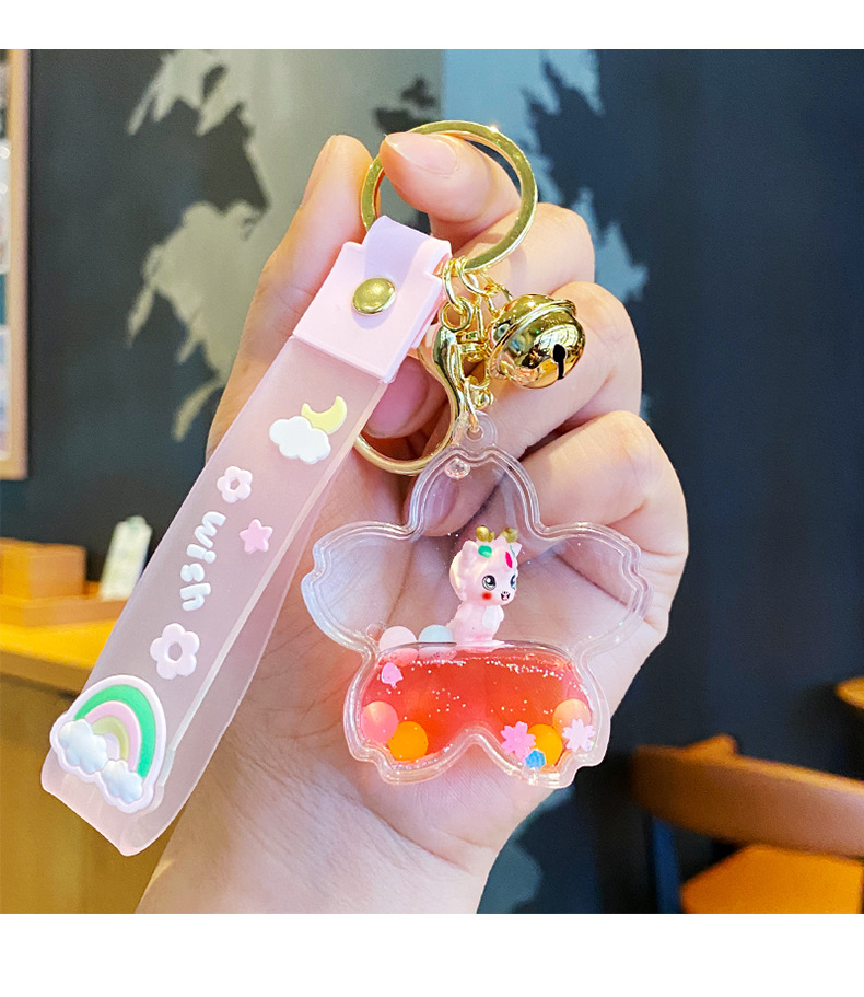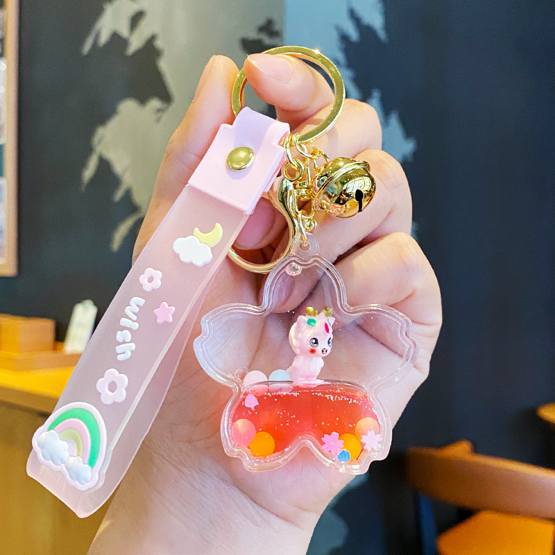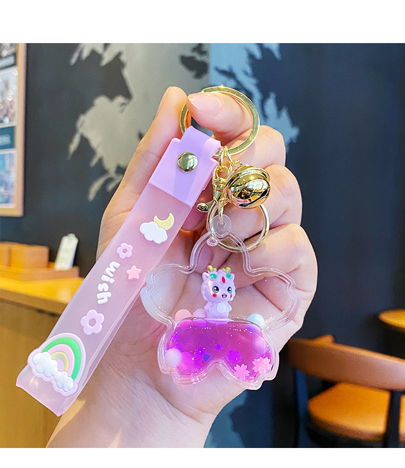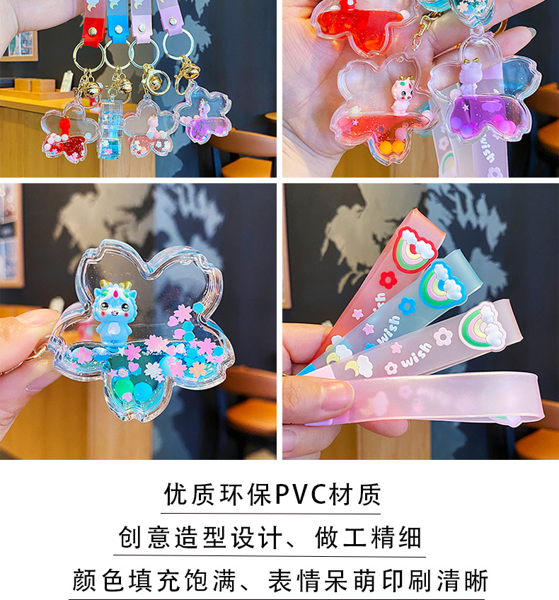 새로운 기름 벚꽃 키 체인 여성 귀여운 용 아기 떠 다니는 병 액체 퀵 샌드 펜던트 어린이 책가방 장식품