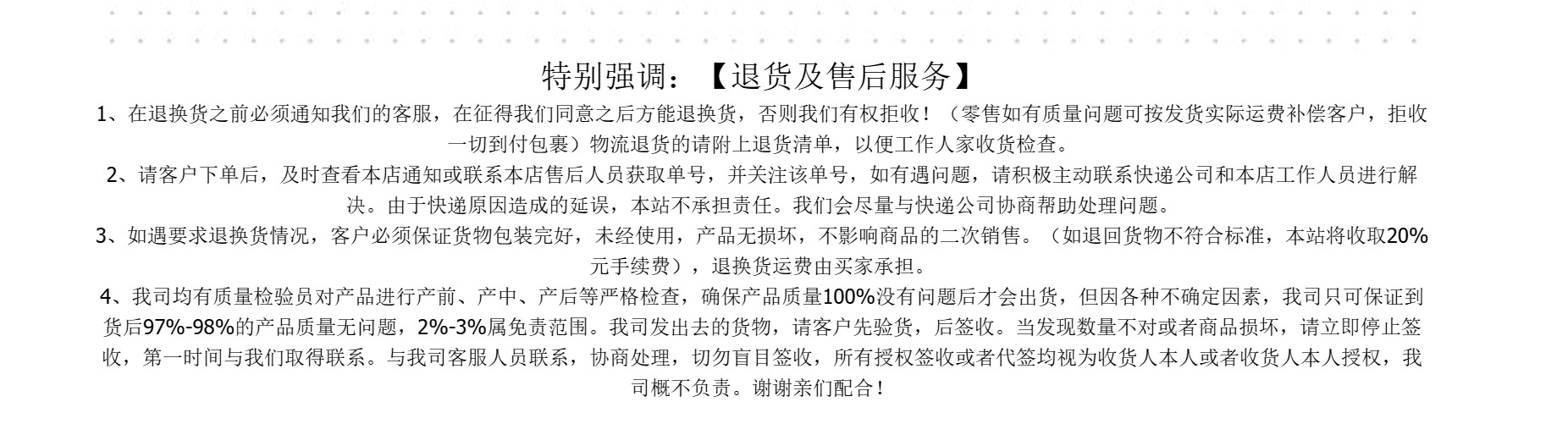 1.我们原则上不接受退货,产品因出厂质量问题的可协商换货,但所产生运输费用需要由买家负责,收到退回产品后我们会在客户下次进货时将换货一起发出,无法接受下次发货时一起发的情况,运费由客户自理!寄回前必须告知我司旺旺客服!!!