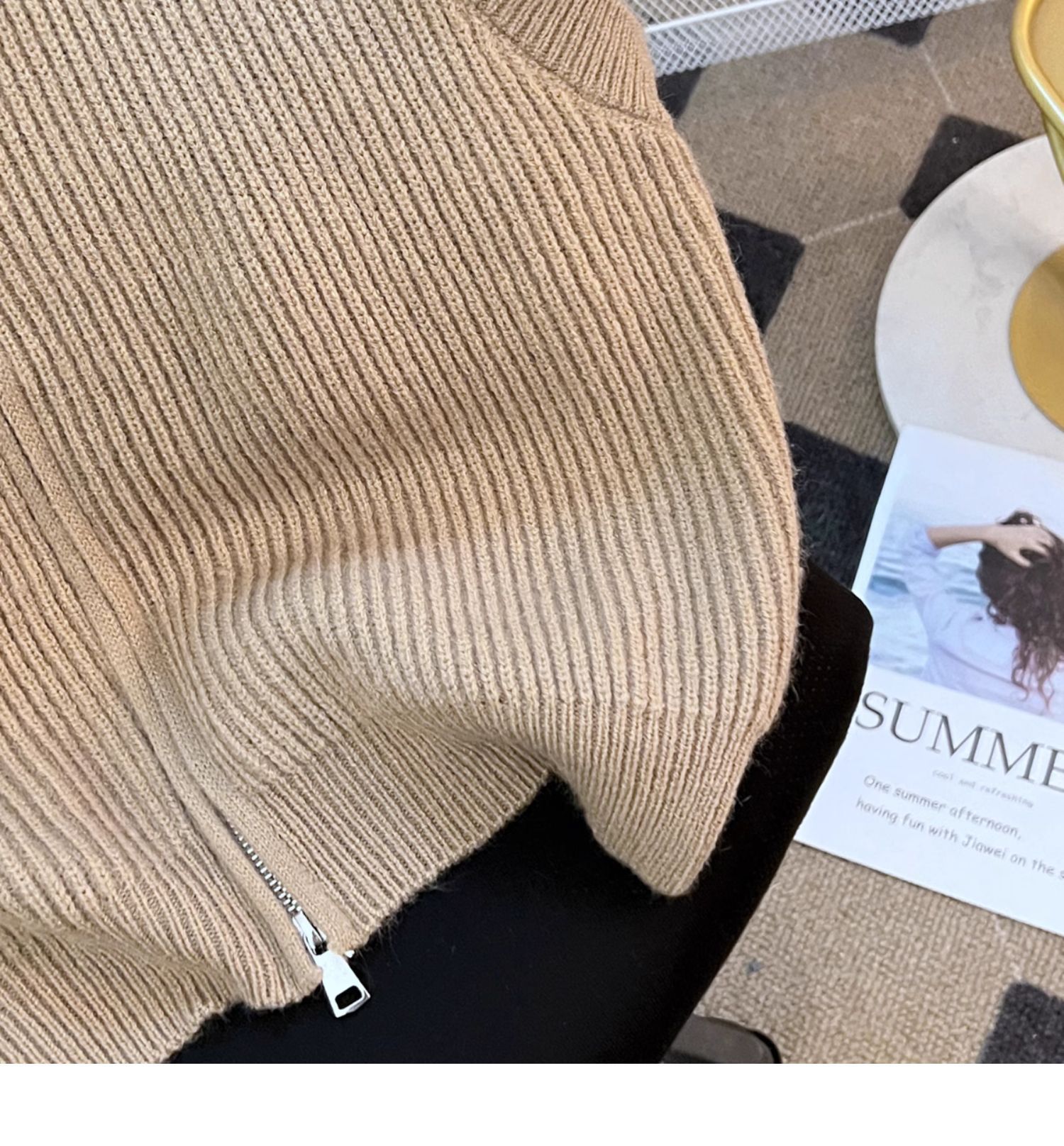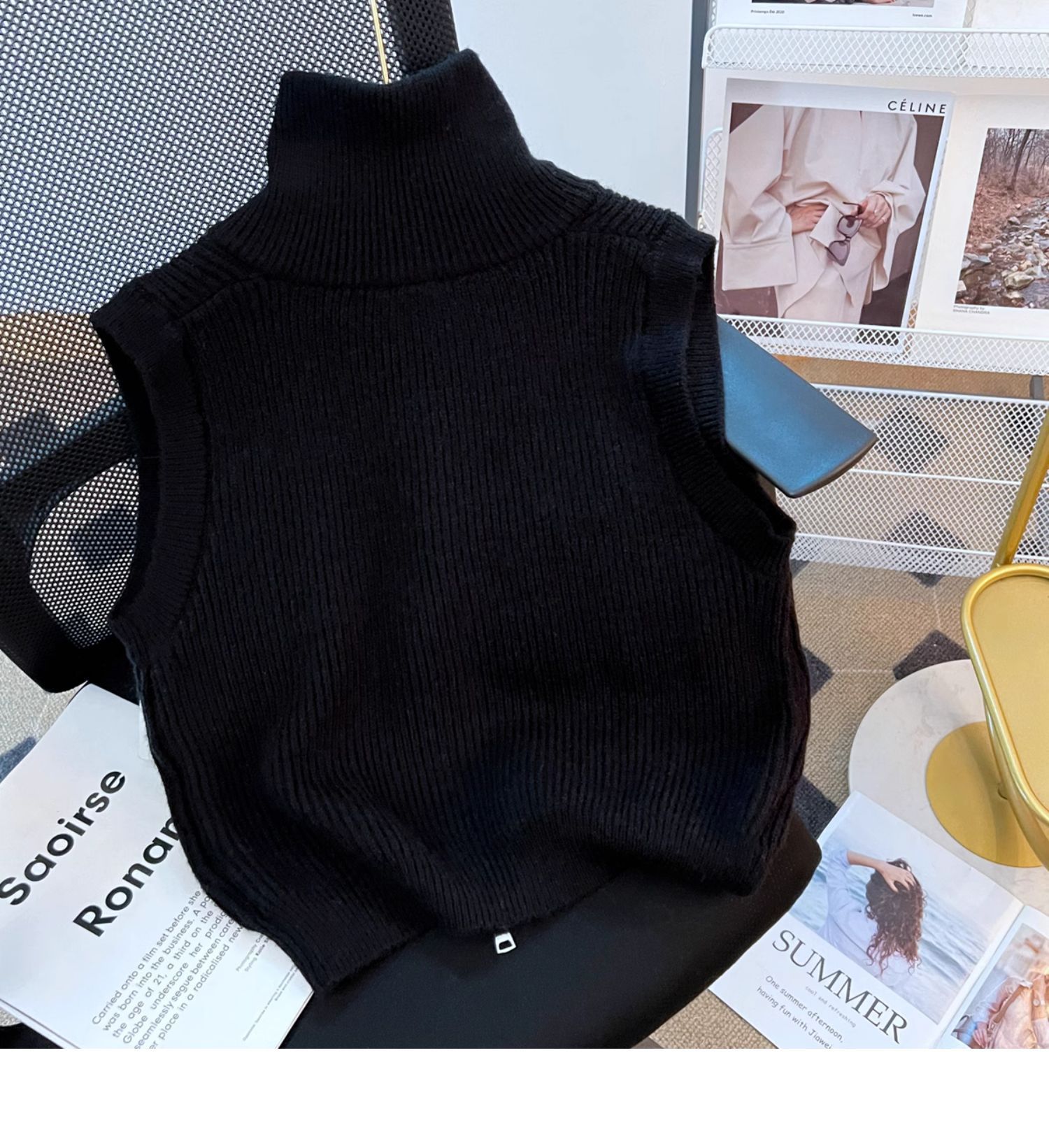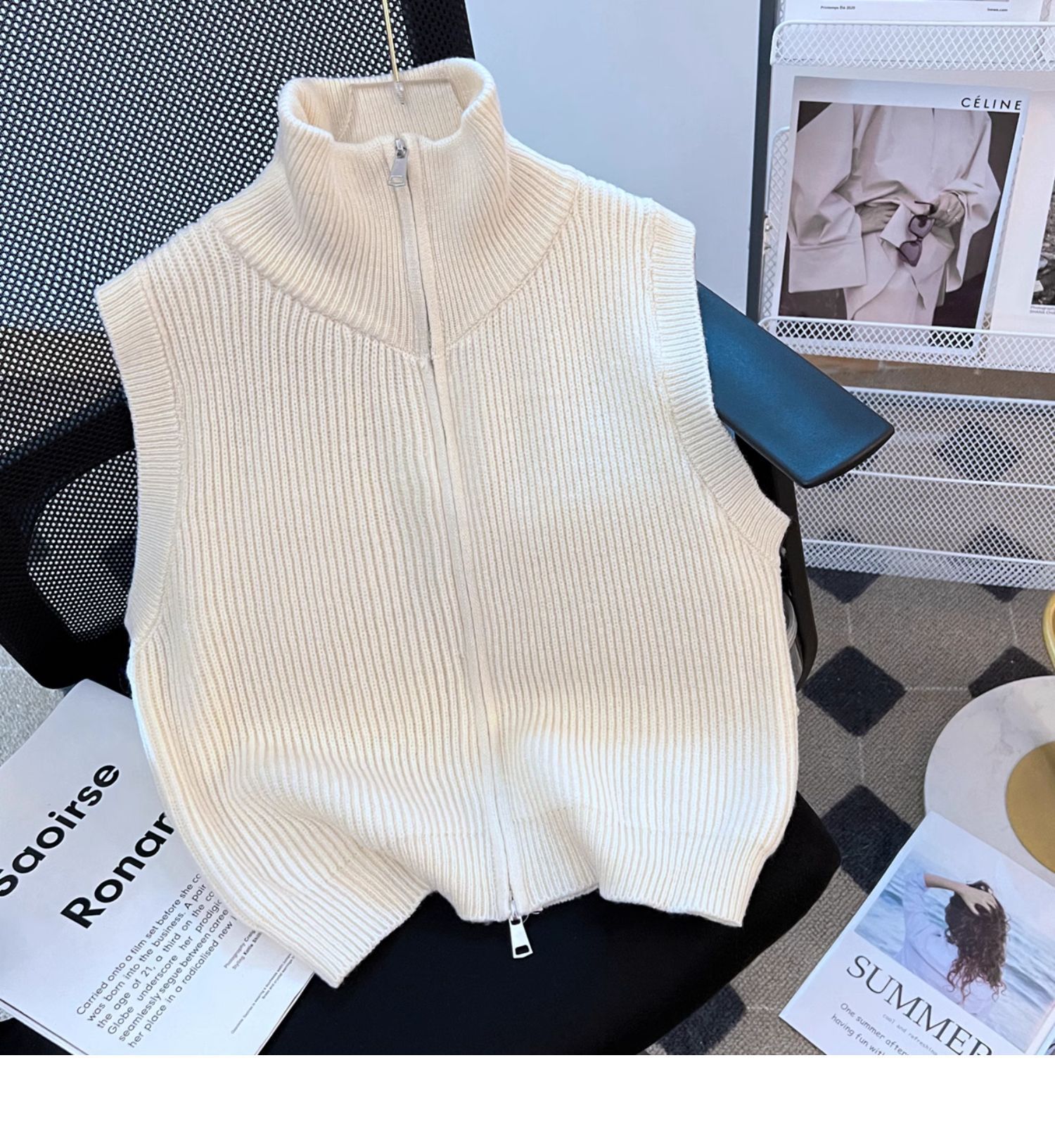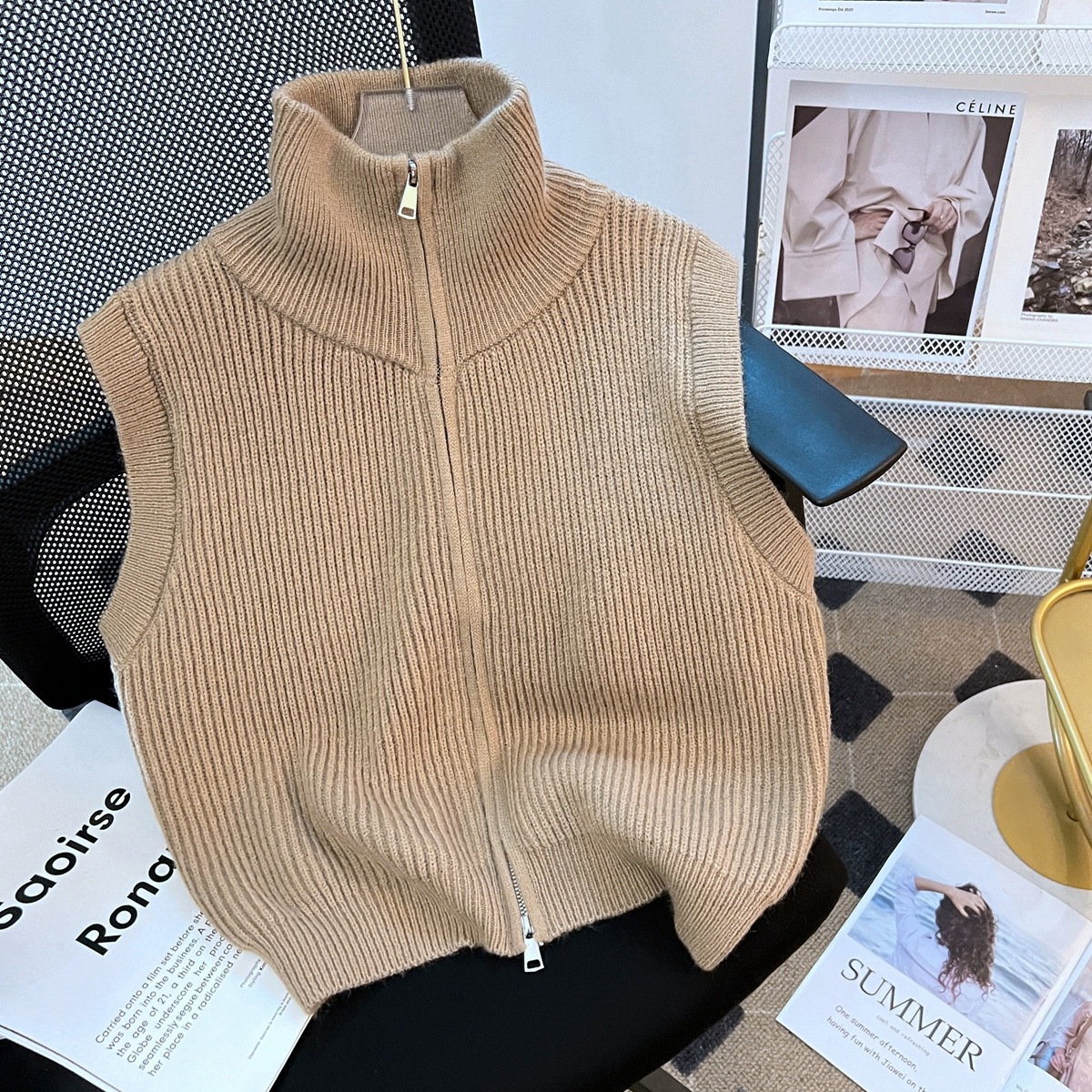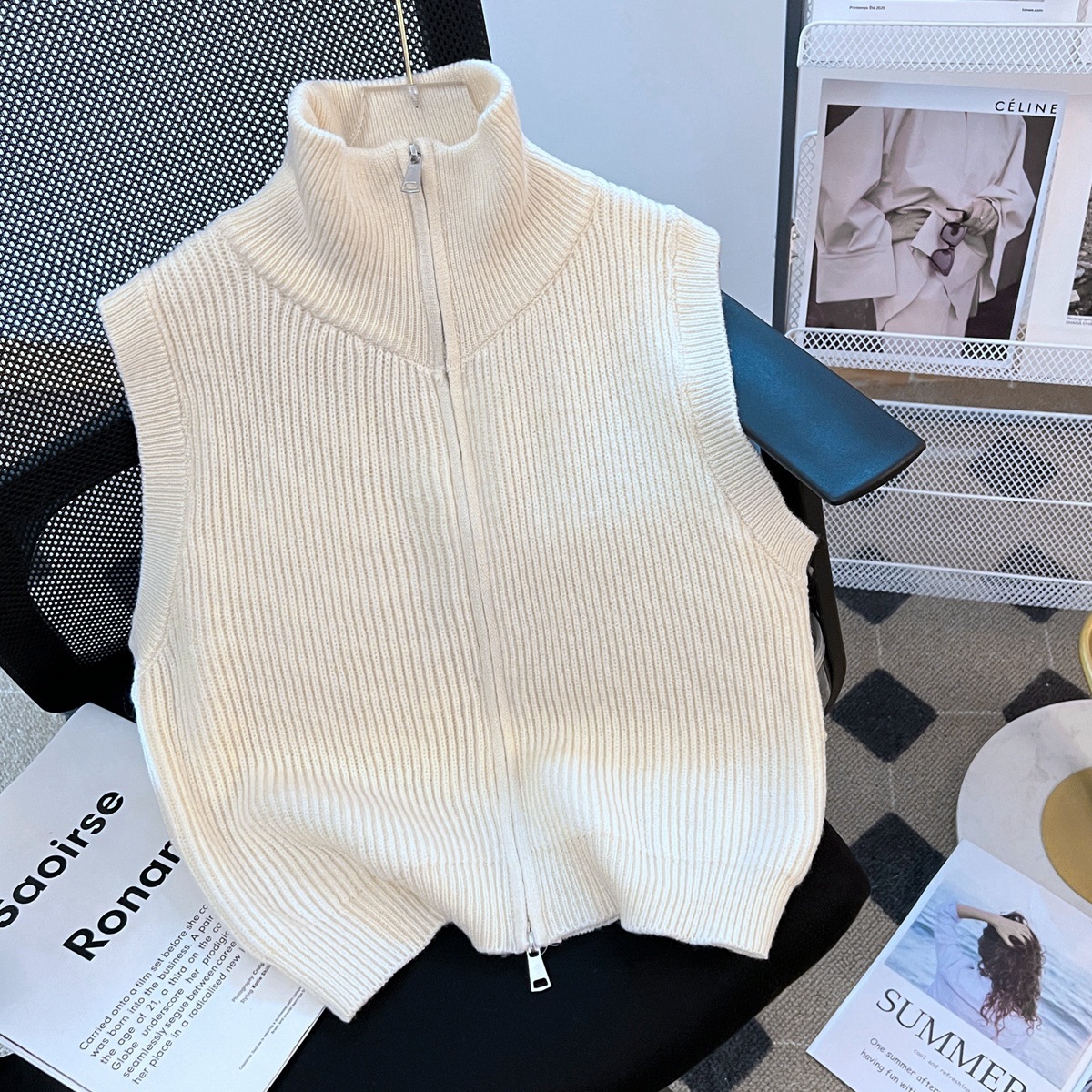 다홍 [올 매치 아티팩트] 니트 스탠드 칼라 조끼 여성 가을과 겨울 더블 지퍼 스택 조끼 조끼 민소매 스웨터 코트스토어 가기