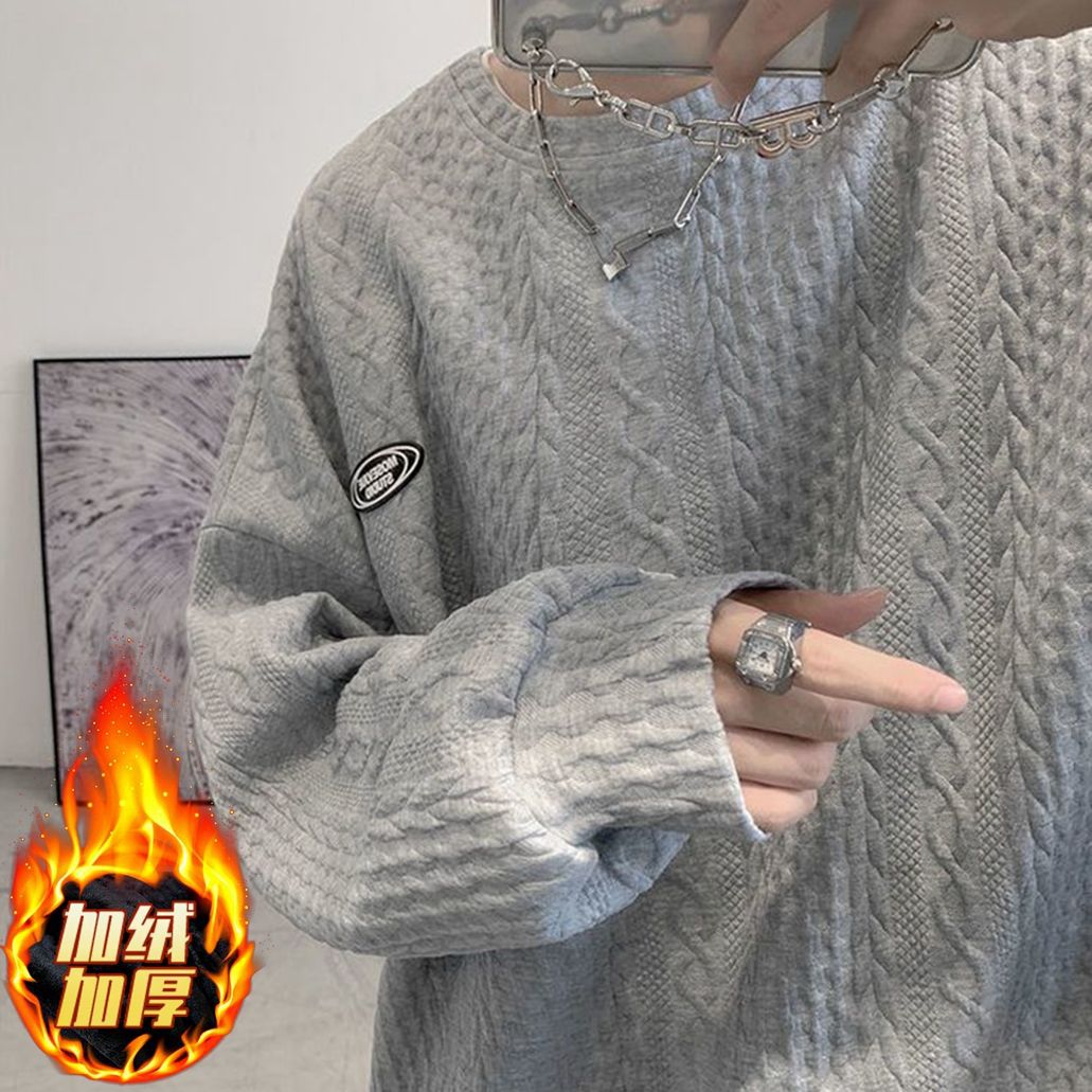 겨울 기모 두꺼운 따뜻한 와플 스웨터 남성용 느슨한 올 매치 라운드 넥 풀오버 청소년 긴팔 티셔츠스토어 가기