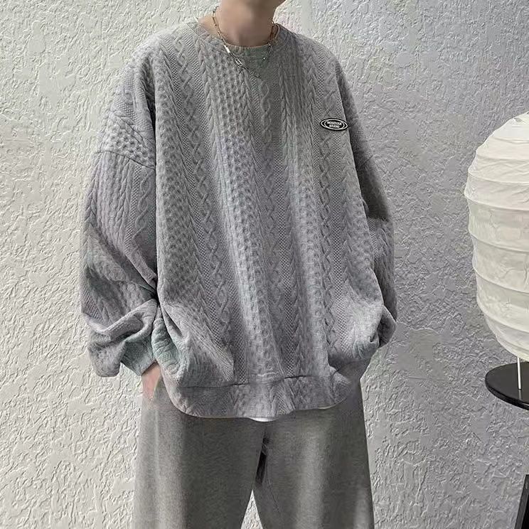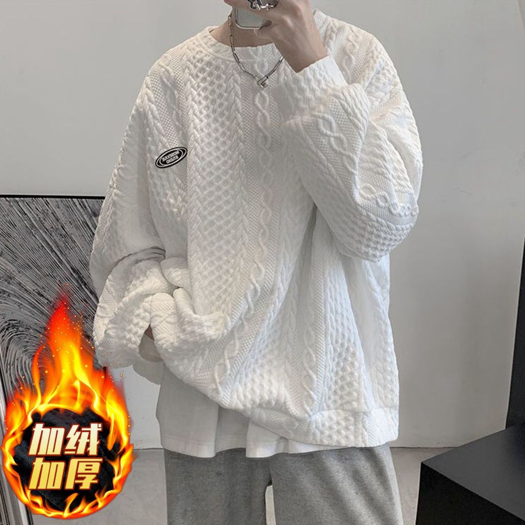 겨울 기모 두꺼운 따뜻한 와플 스웨터 남성용 느슨한 올 매치 라운드 넥 풀오버 청소년 긴팔 티셔츠