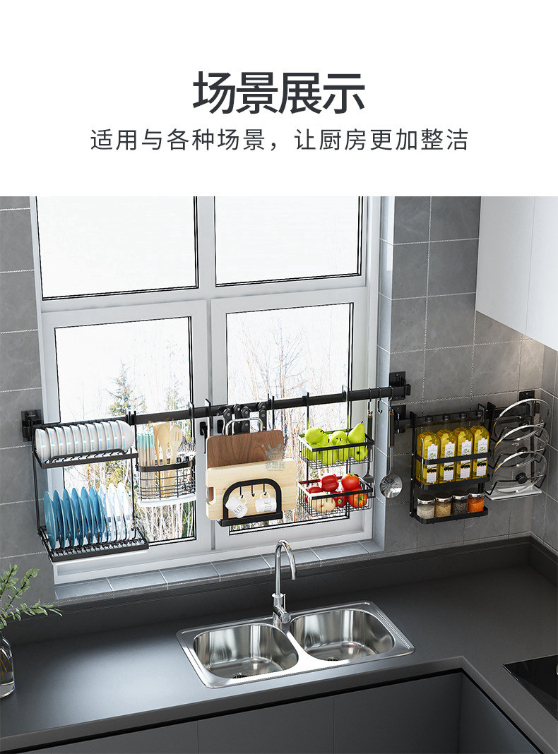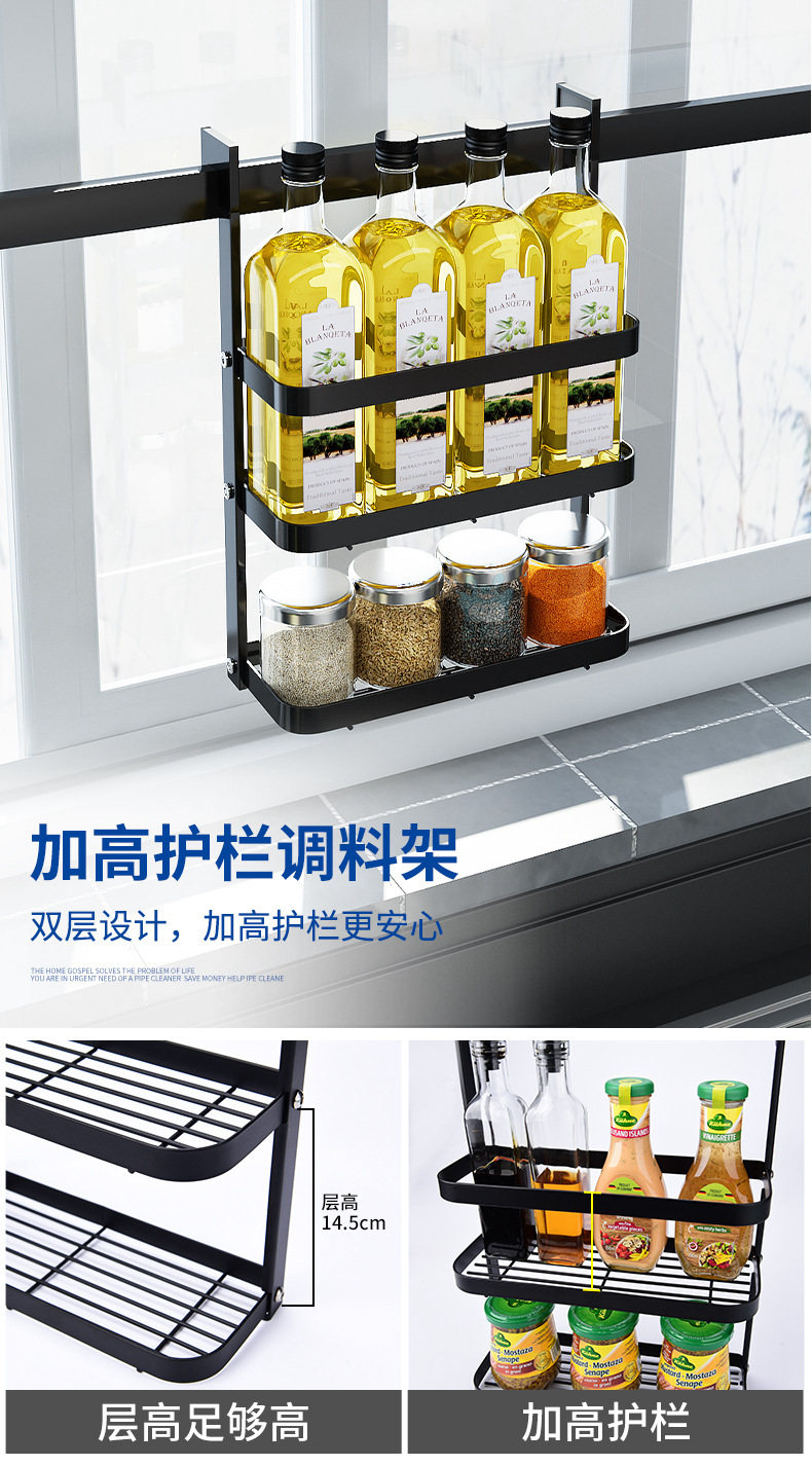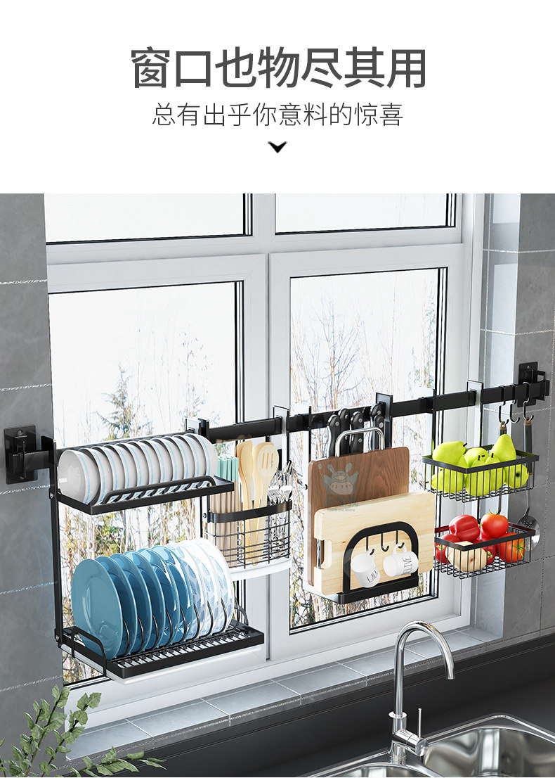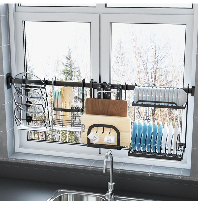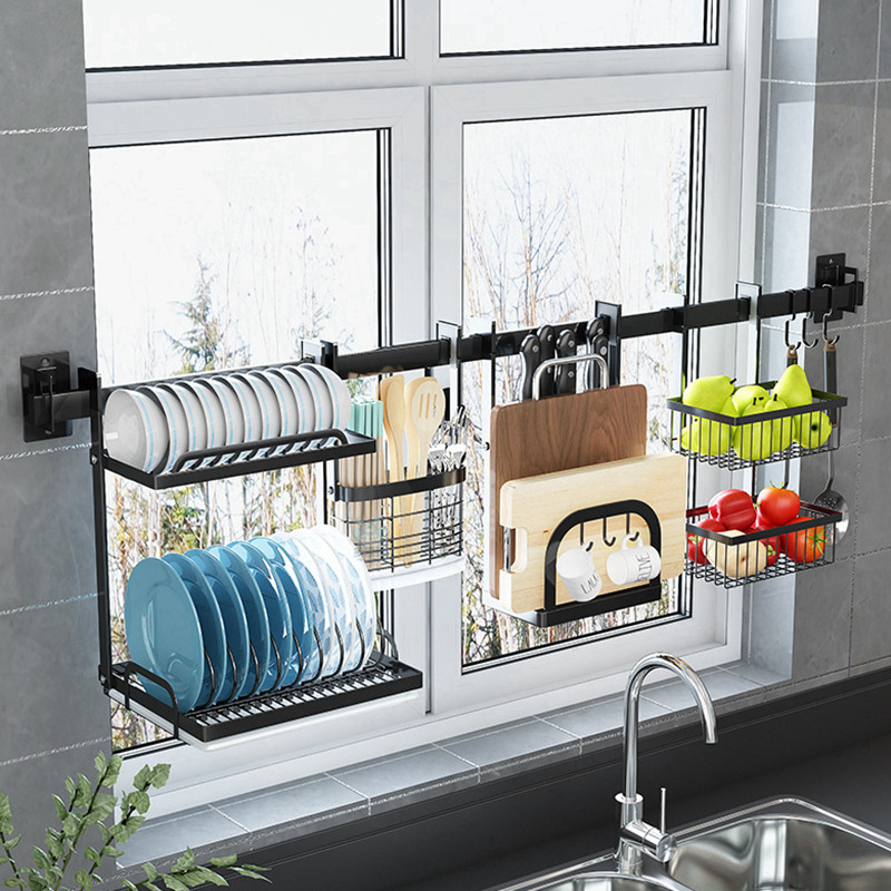 천공되지 않은 스테인레스 스틸 다기능 주방 창문 보관 랙 창 벽걸이 블랙 교수형 바 후크스토어 가기