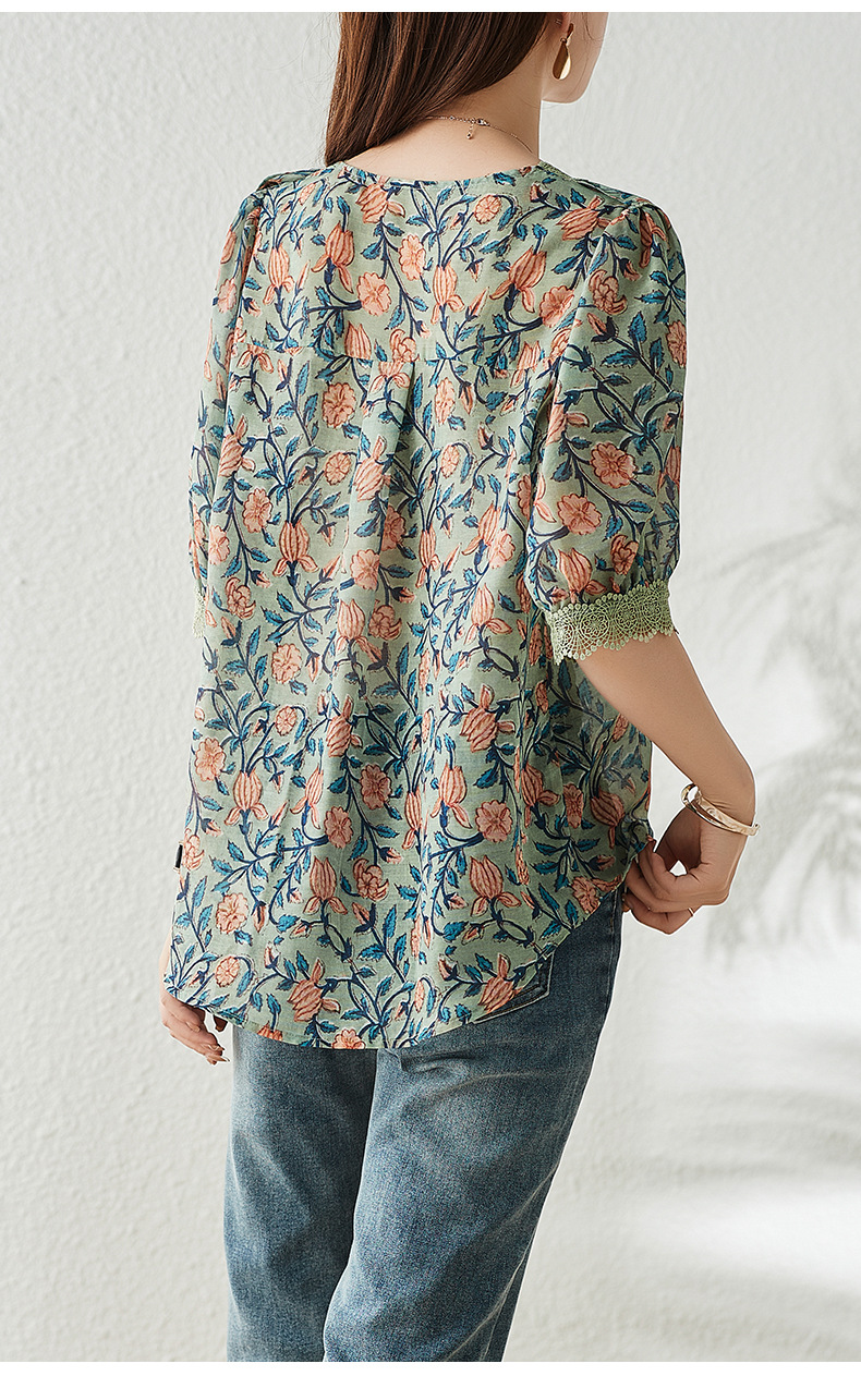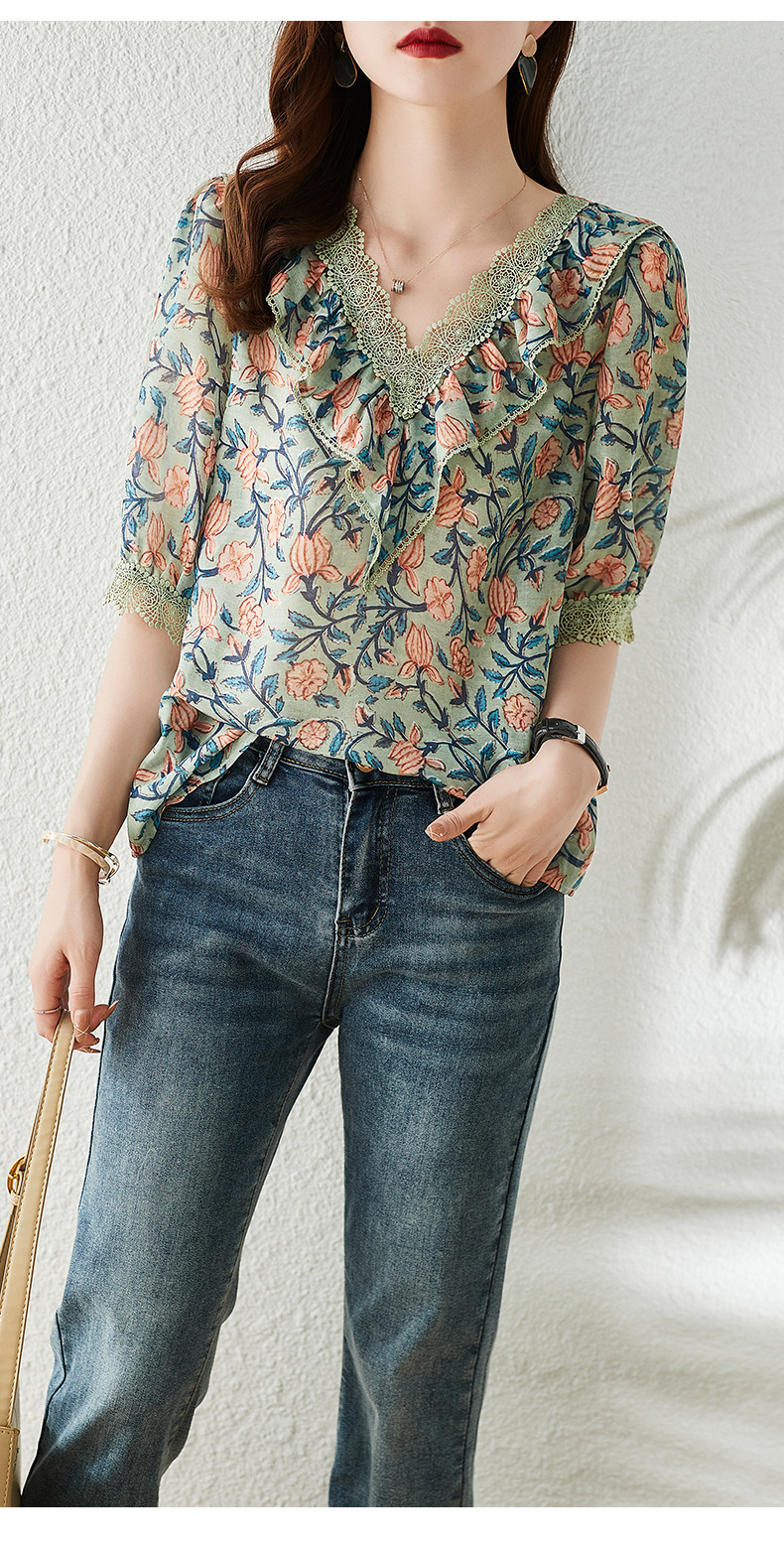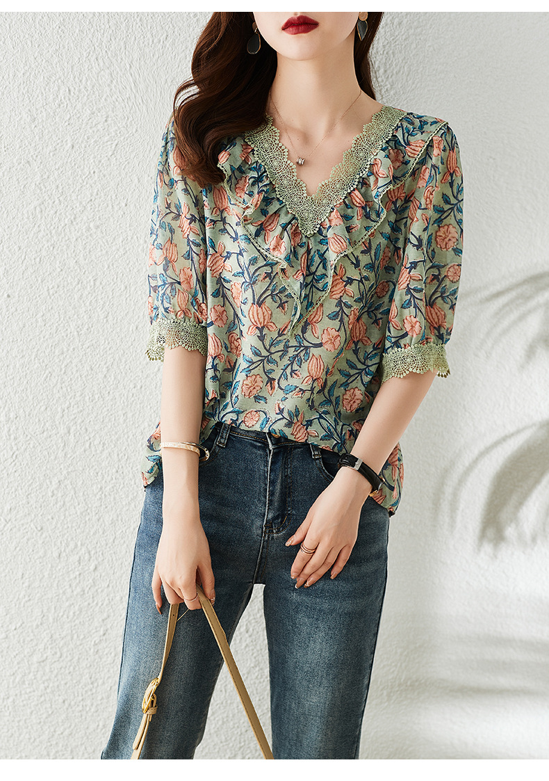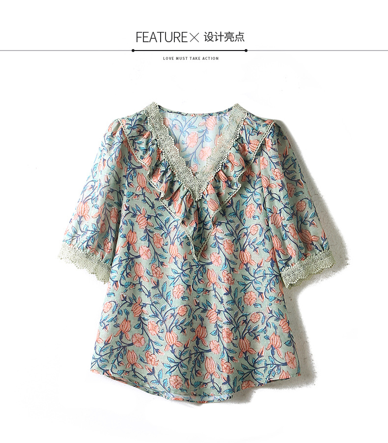 V 넥 플로럴 쉬폰 셔츠 여성 여름 반팔 2023 새로운 느슨한 플러스 사이즈 통통녀 디자인 탑스토어 가기