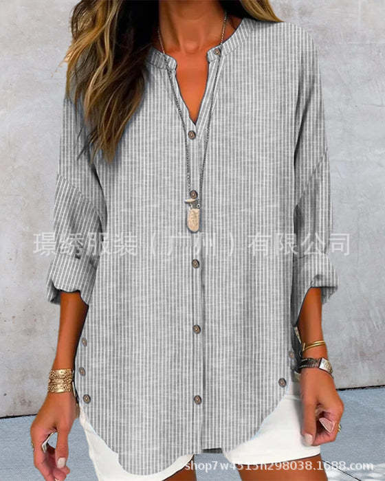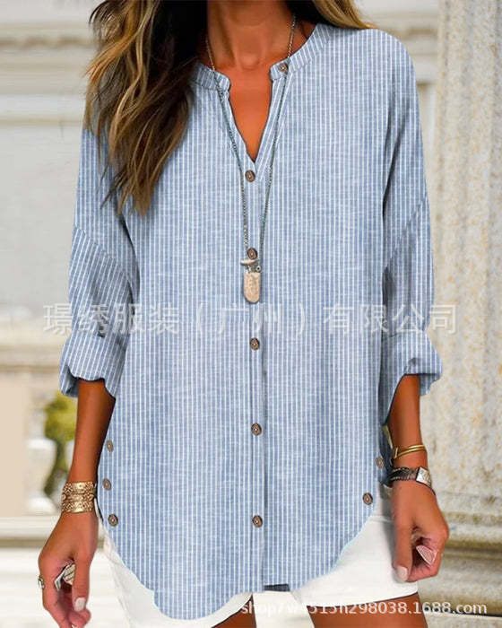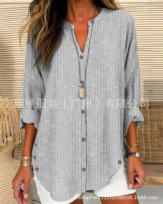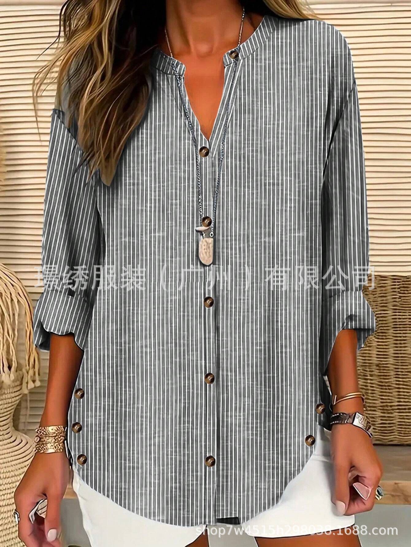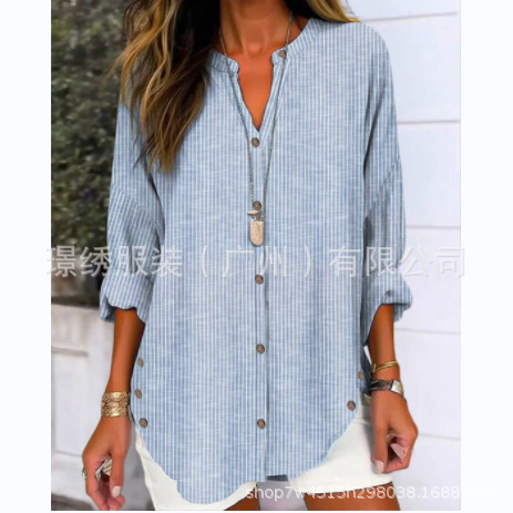 2023 아마존 여성의 가을과 겨울 새로운 국경 유럽과 미국의 캐주얼 패션 버튼 스트라이프 긴 소매 단색 셔츠