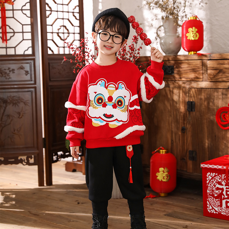 TZ210-lion 댄스 카드 울 스트라이프 스웨터 세트 축제 새해 인사말 옷 소년 한푸 탕 세트 중국 스타일 아기 옷